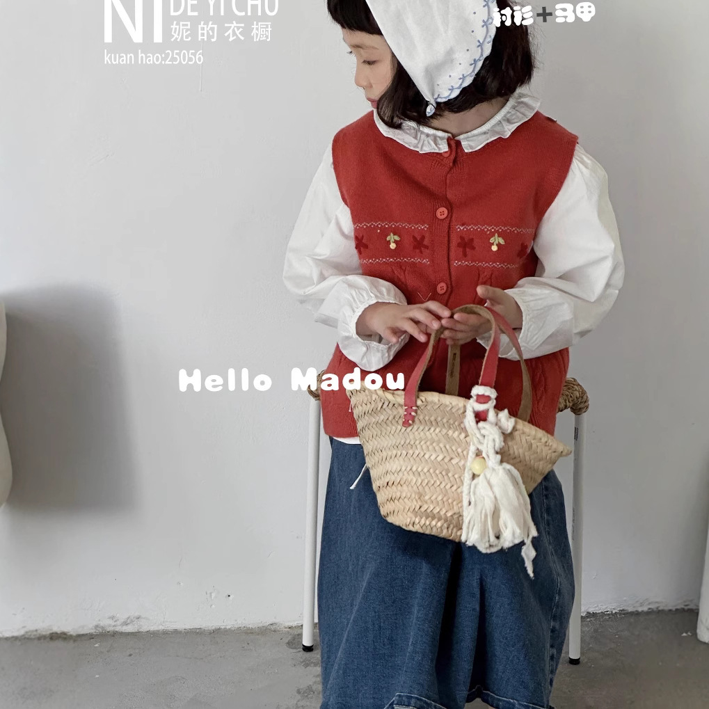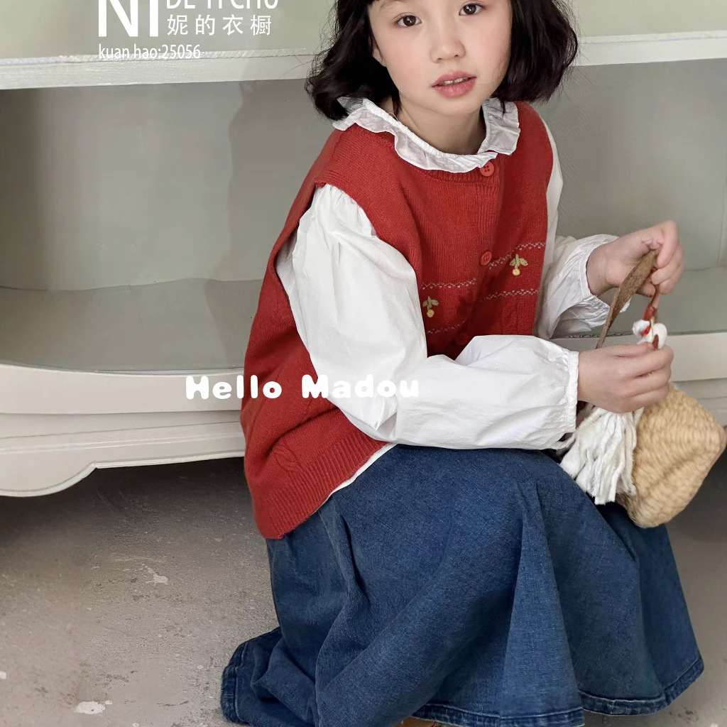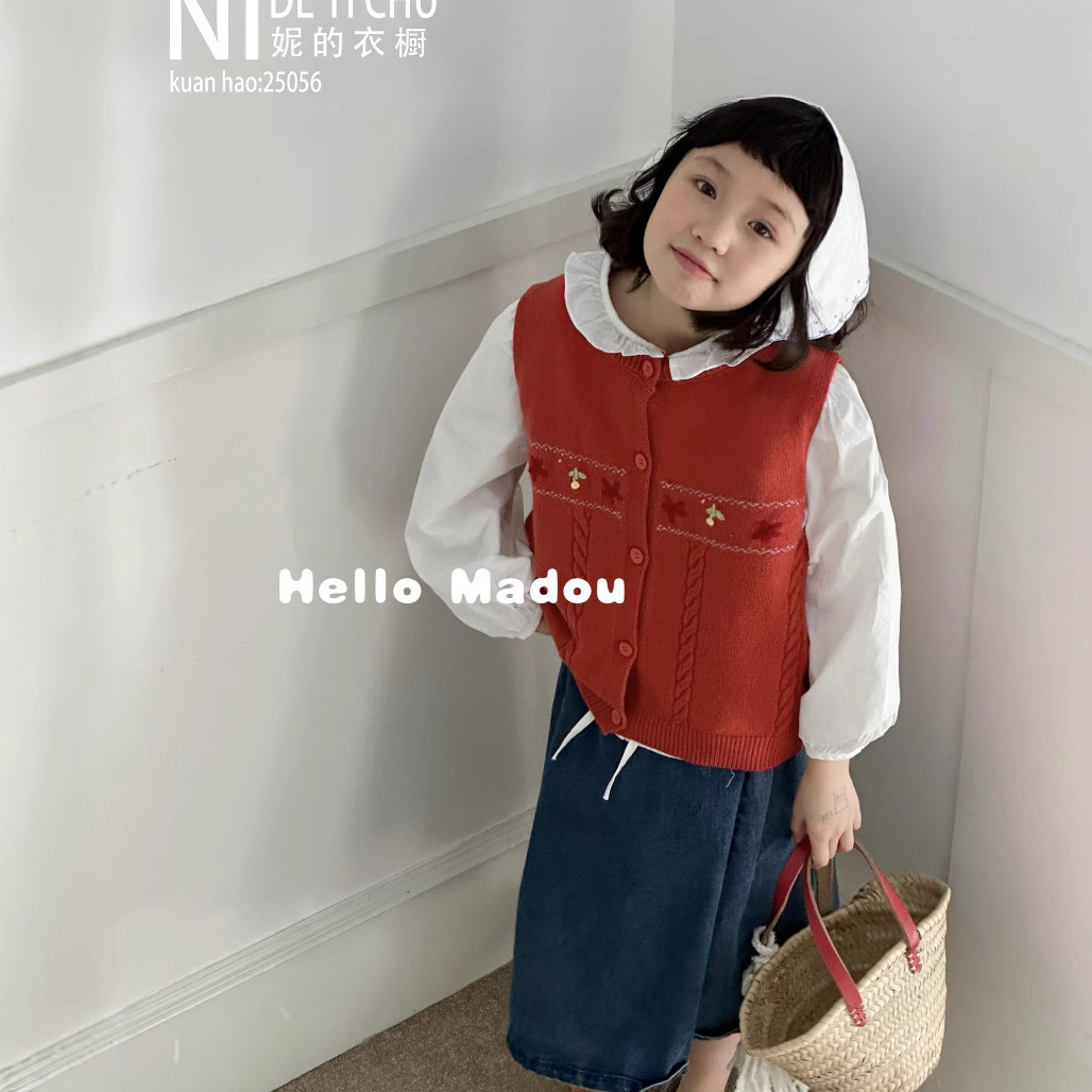 【056】대형 아동용 130-170 사이즈 수제 꽃무늬 조끼와 셔츠 투피스 세트 (여아용, 반품 불가)