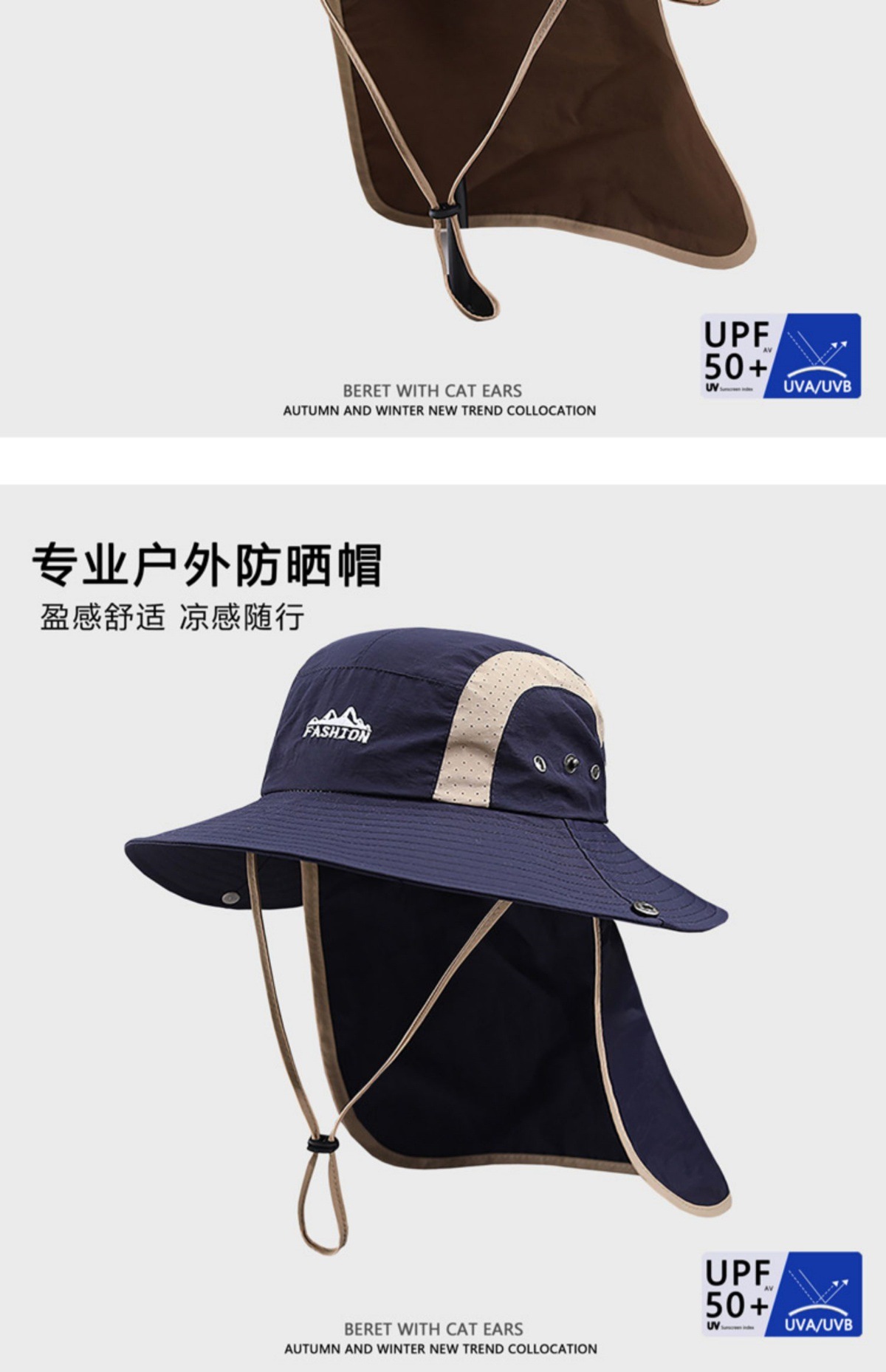 • 야외용 태양 모자 + 숄 - 카키색 + 네이비 블루