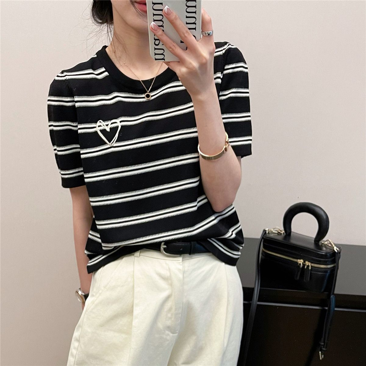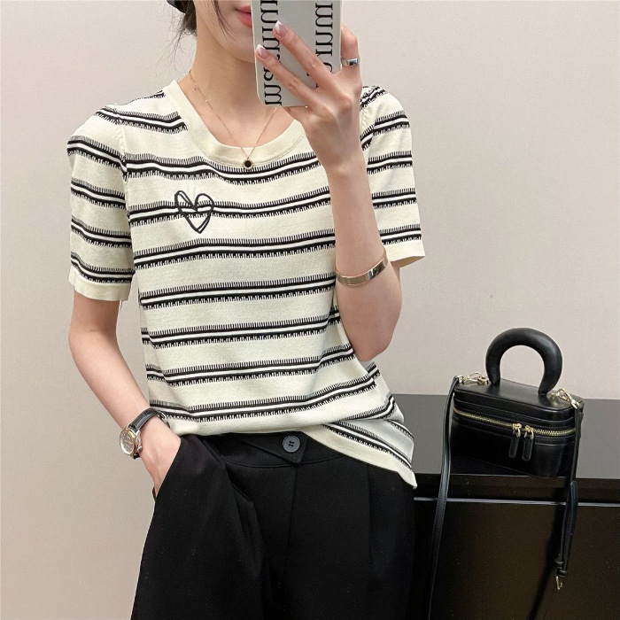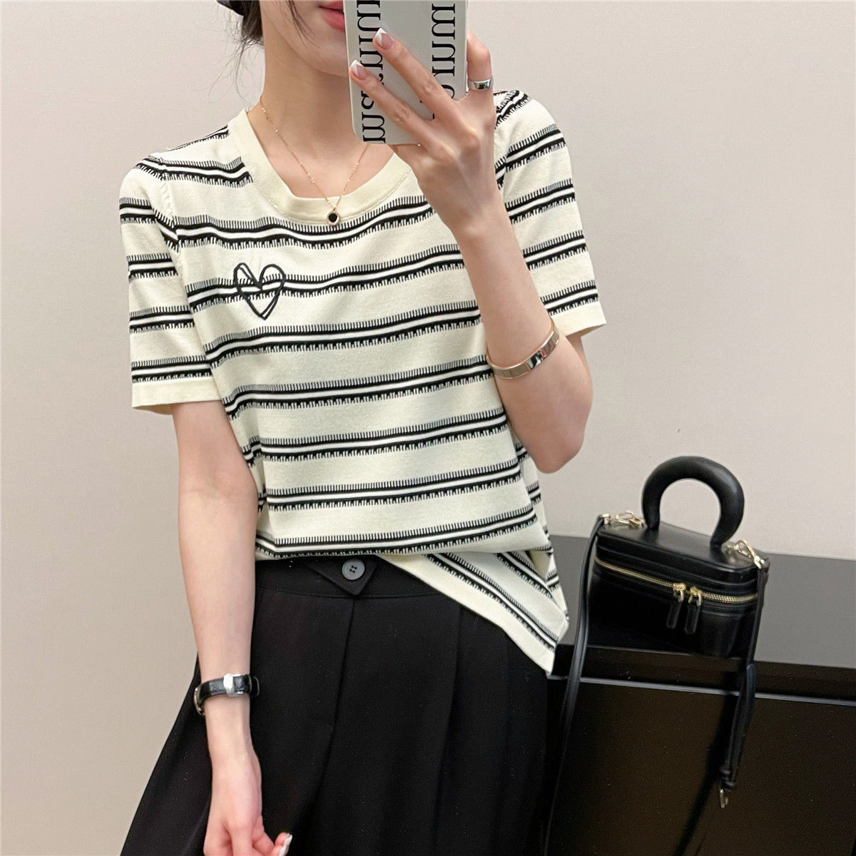 자수 사랑 패턴 2025 여름 새로운 유럽 슬림 스트라이프 짧은 소매 탑 아이스 실크 니트 베이스 셔츠