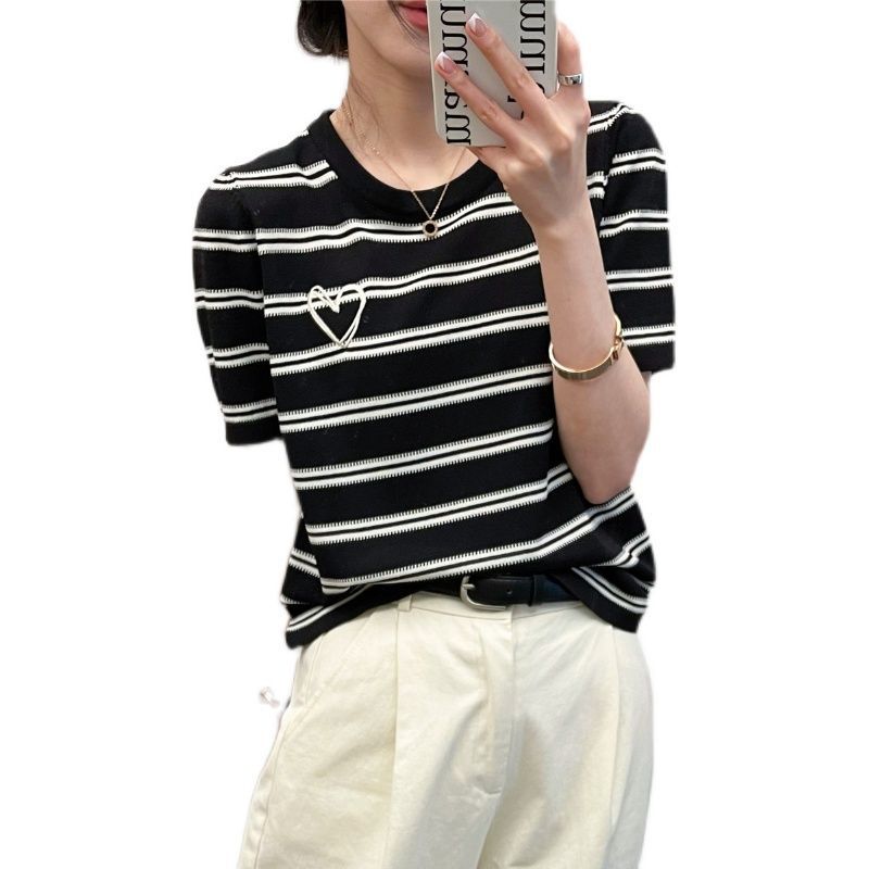 자수 사랑 패턴 2025 여름 새로운 유럽 슬림 스트라이프 짧은 소매 탑 아이스 실크 니트 베이스 셔츠스토어 가기