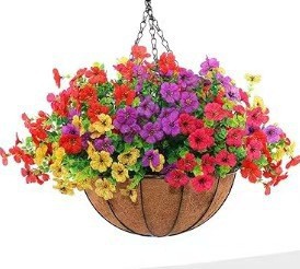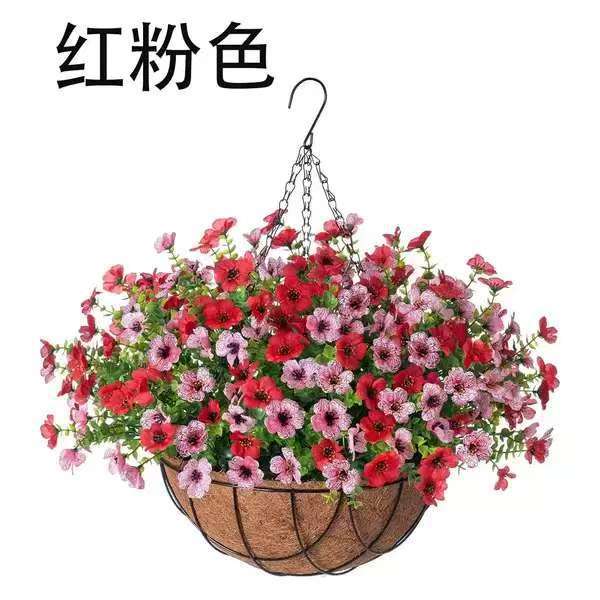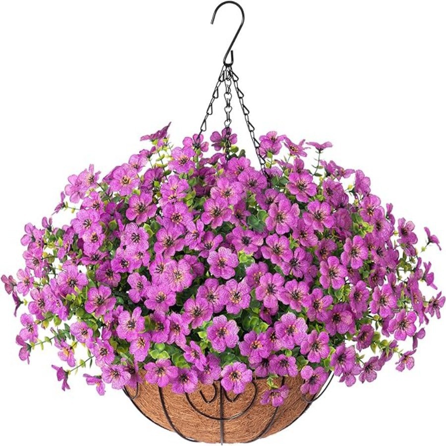 모조 보라색 꽃과 철제 프레임이 있는 코코넛 섬유 걸이바구니, 봄 여름 야외 정원 장식용 원형 걸이바구니스토어 가기