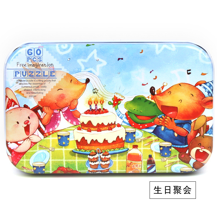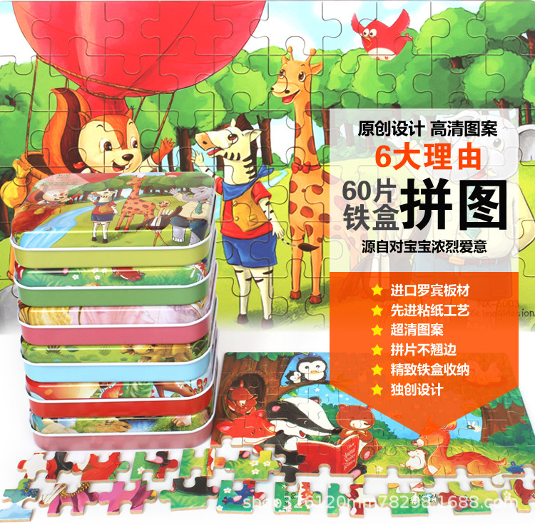 어린이 60 조각 철 상자 퍼즐 유치원 3-6 세 조기 교육 교육 동물 애니메이션 만화 나무 퍼즐 장난감 2