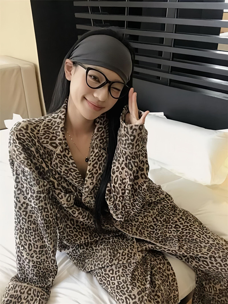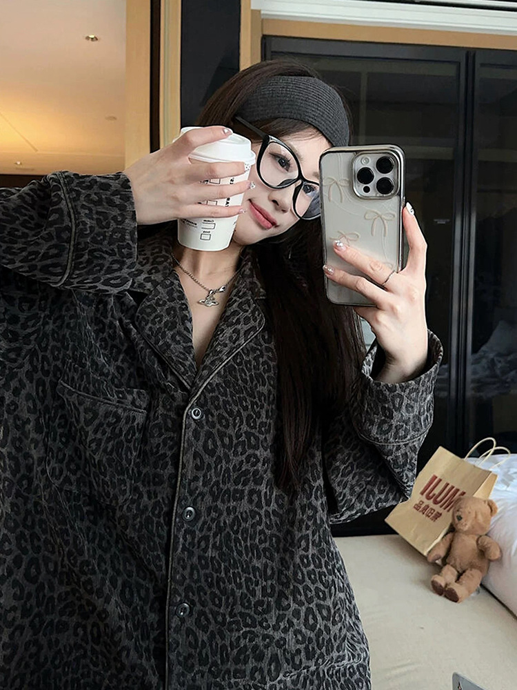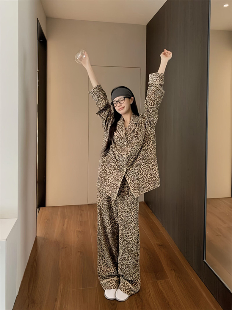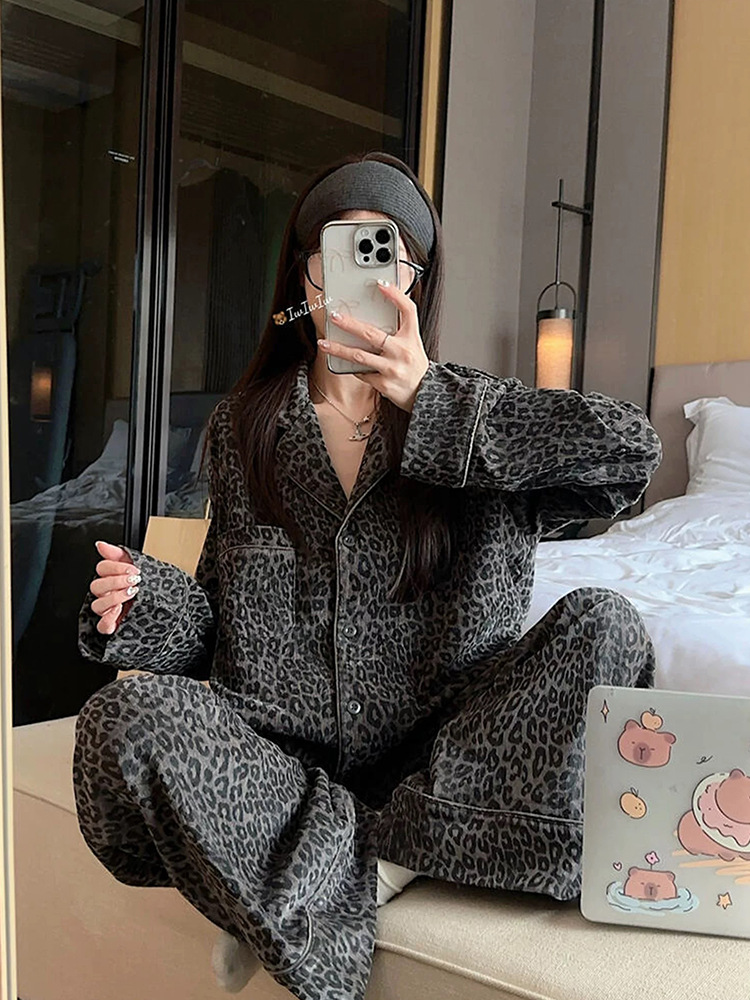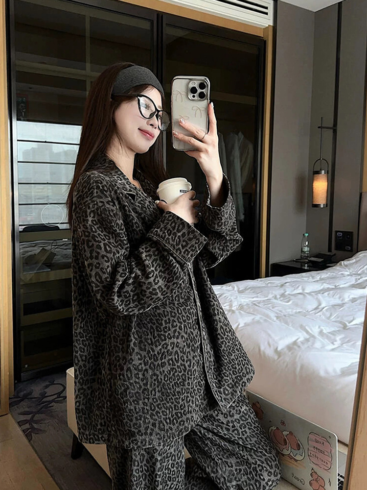 레오파드 무늬 잠옷 여성 봄과 가을 2025 새로운 오래된 돈 스타일 복고풍 긴 소매 넓은 다리 바지 느슨한 홈 의류 세트스토어 가기