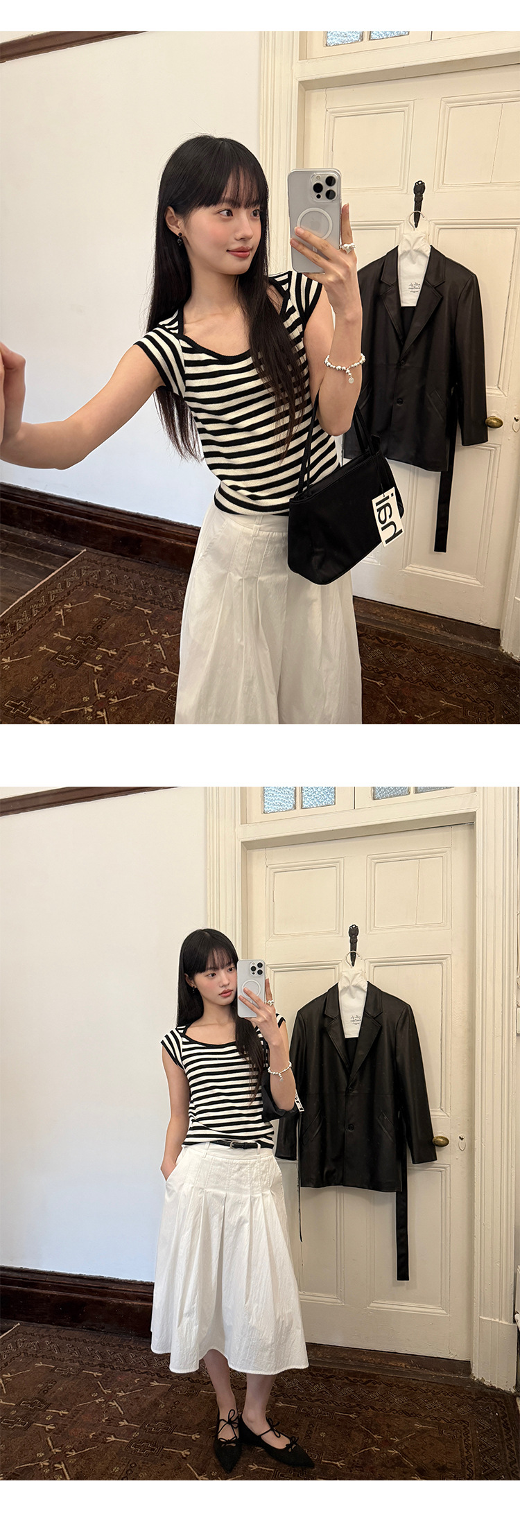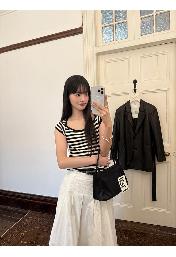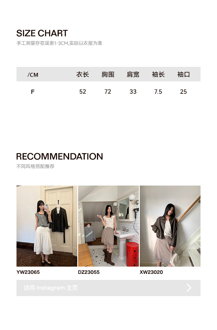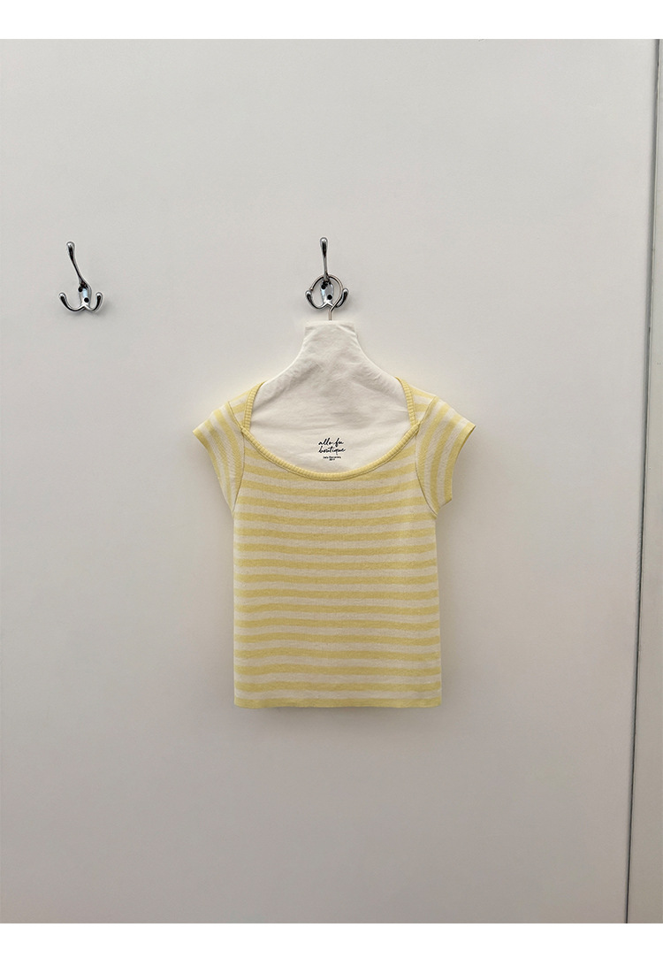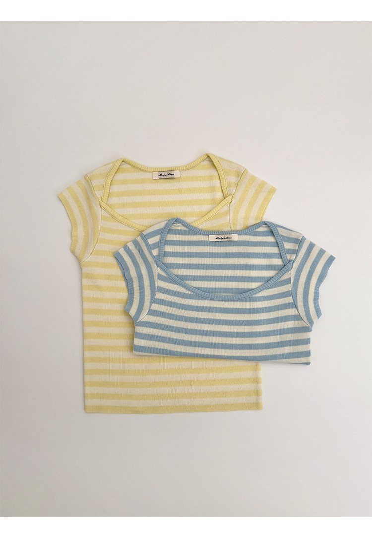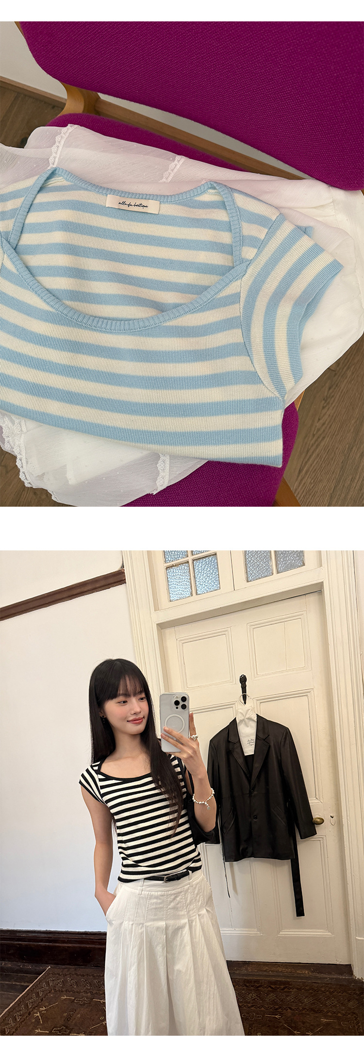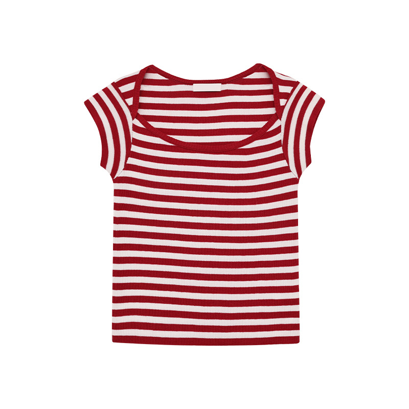[클리어아웃 및 환불 불가] 심플하고 활용도가 높은 스퀘어 라운드넥 여성용 반팔 스웨터 봄 스트라이프 숏탑 19127스토어 가기