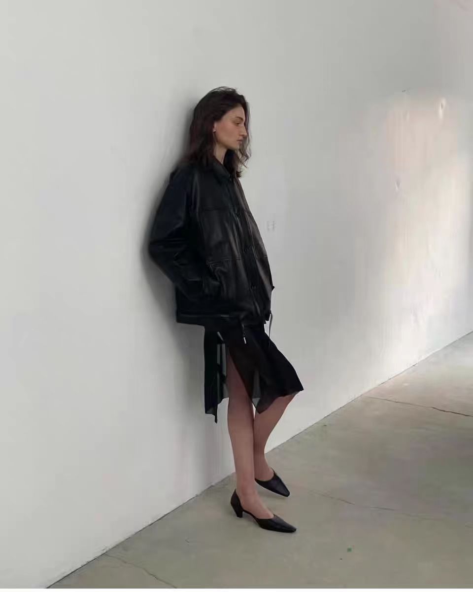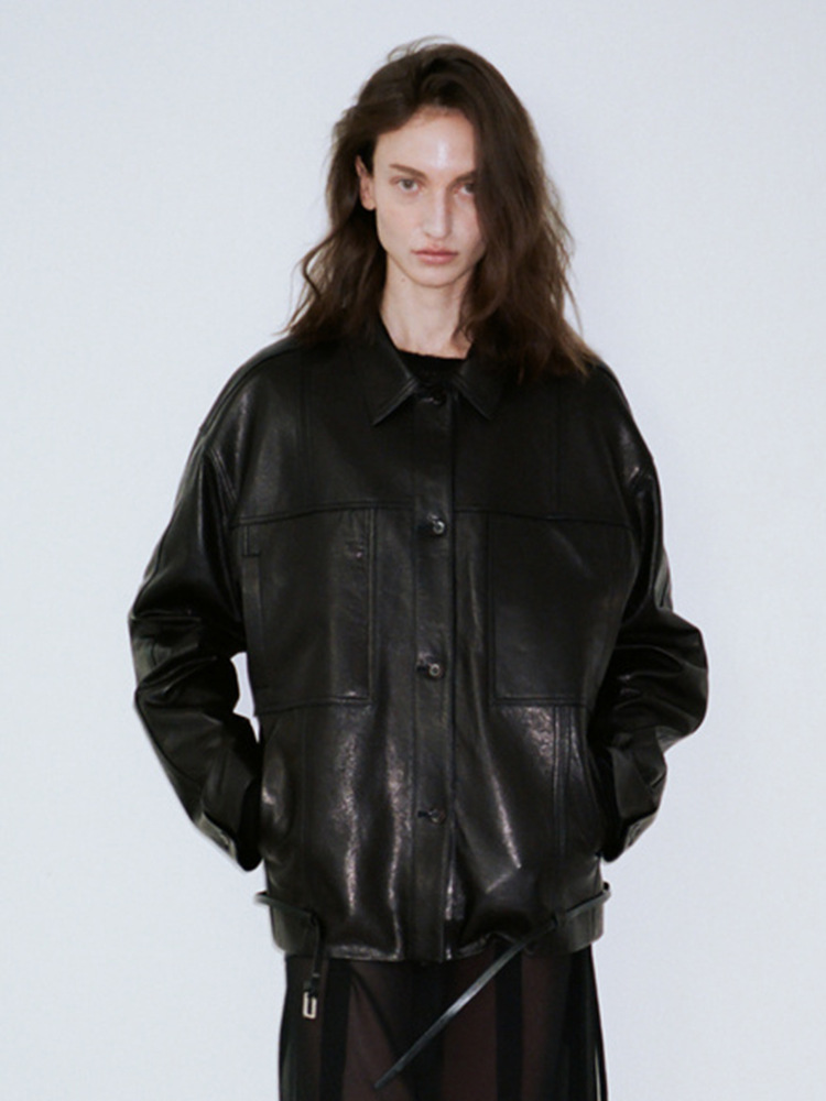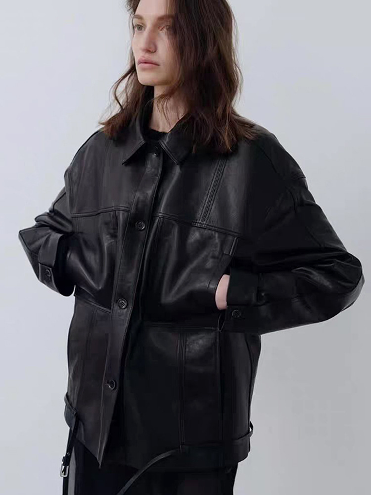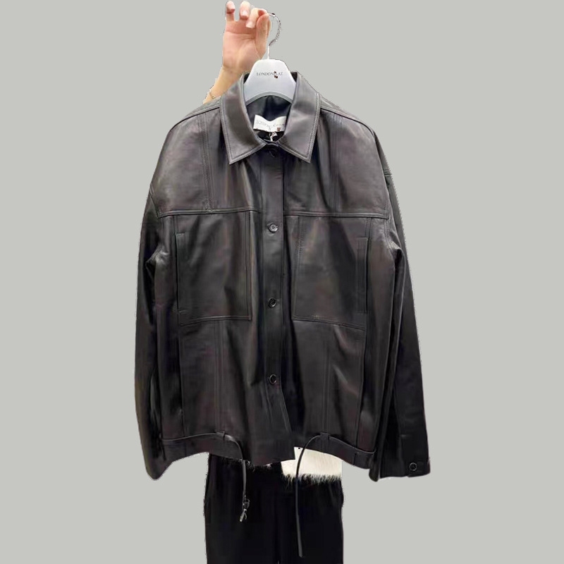 재고 있음: 런던 플랫 가죽 자켓 여성용, 봄 신상 레트로 고급 대형 포켓 레이스업 바이커 자켓스토어 가기