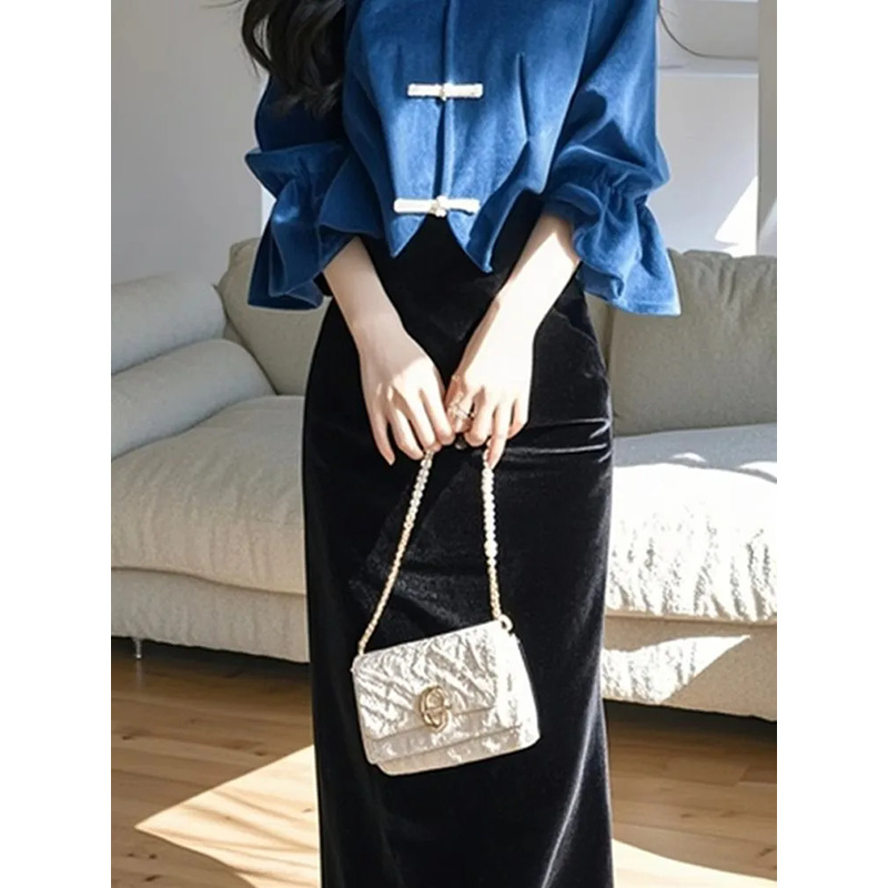 싱글 피스/2025 봄 새로운 여성 의류 새로운 중국 국가 스타일 블루 코듀로이 여성의 고급 품위 있고 우아한 패션