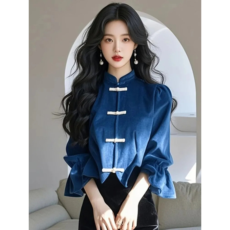 싱글 피스/2025 봄 새로운 여성 의류 새로운 중국 국가 스타일 블루 코듀로이 여성의 고급 품위 있고 우아한 패션스토어 가기