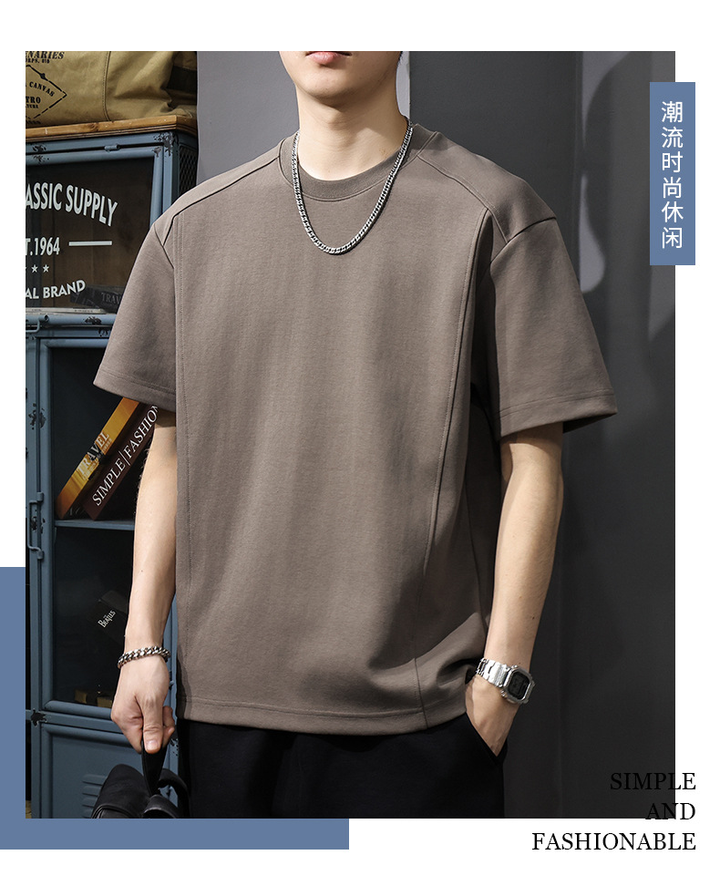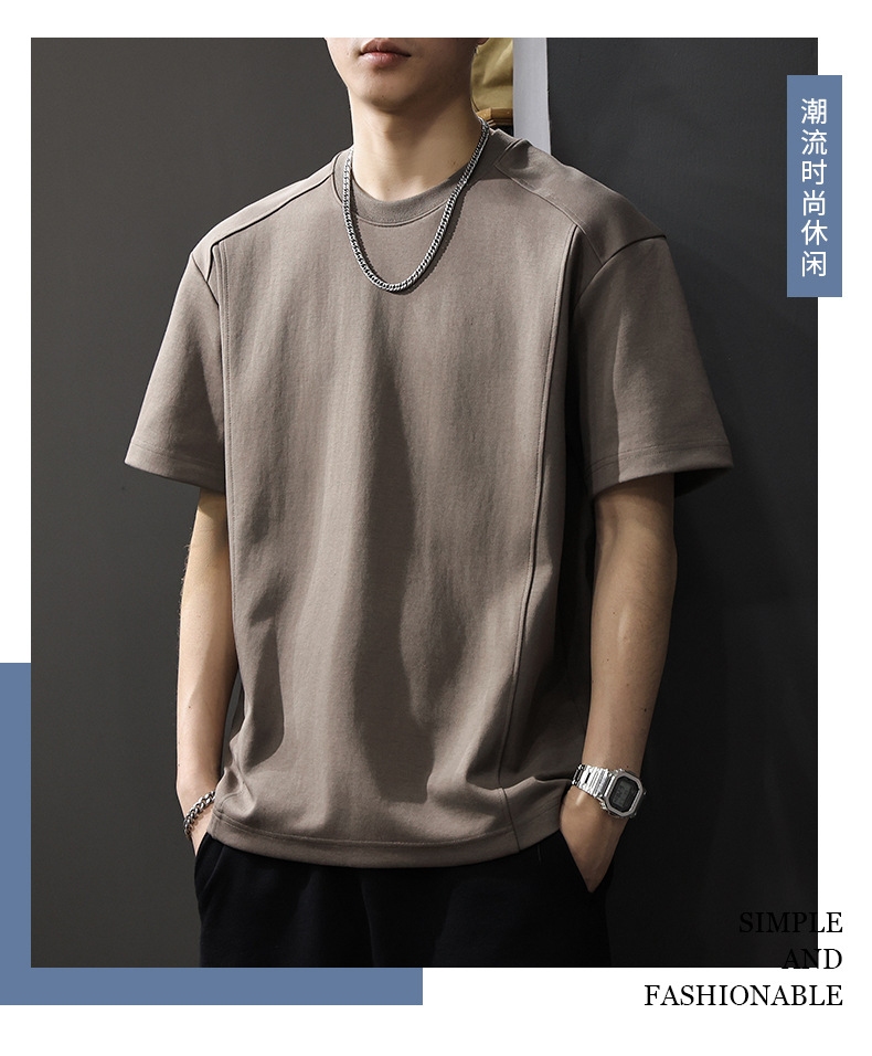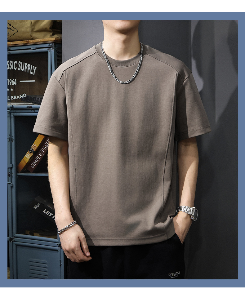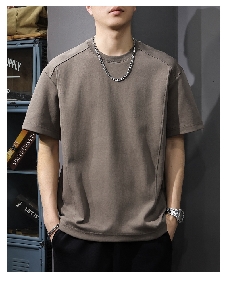 225G 헤비 레트로 반소매 티셔츠 남자 2025 년 여름 새로운 불규칙한 라인 느슨한 라운드 넥 반소매 티셔츠
