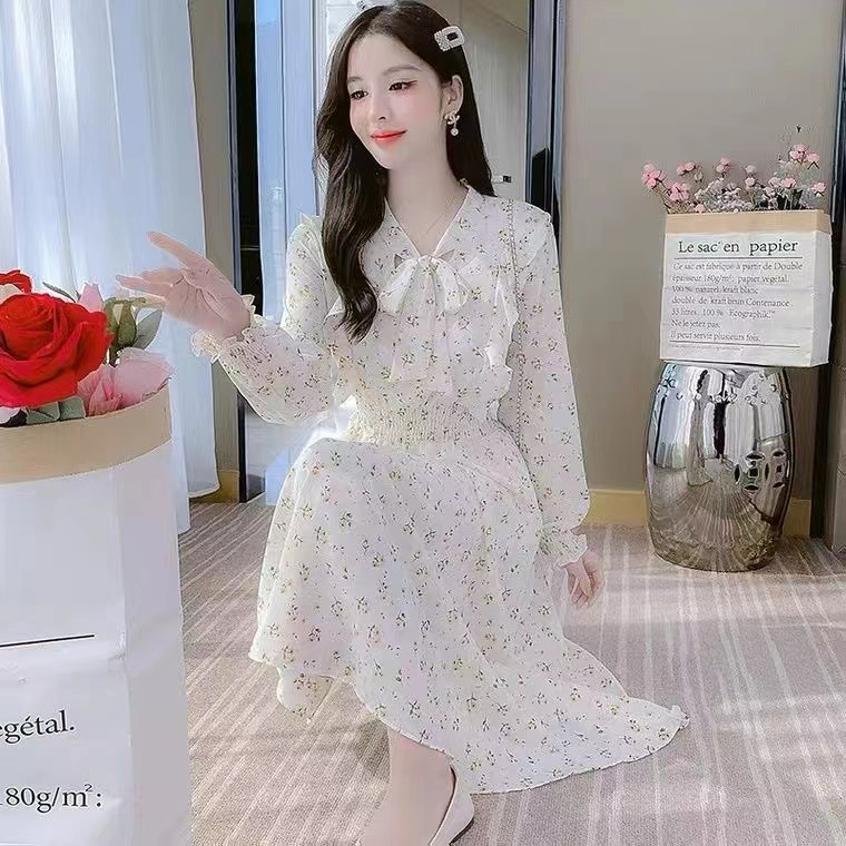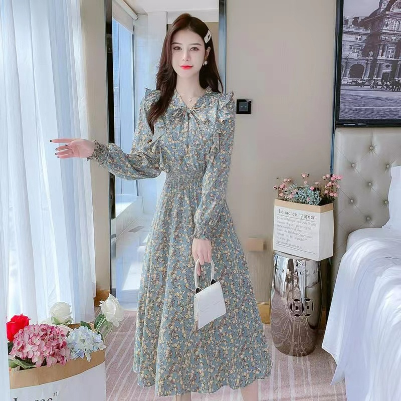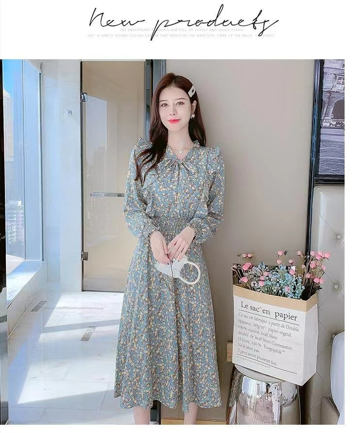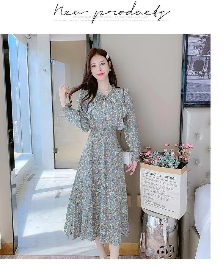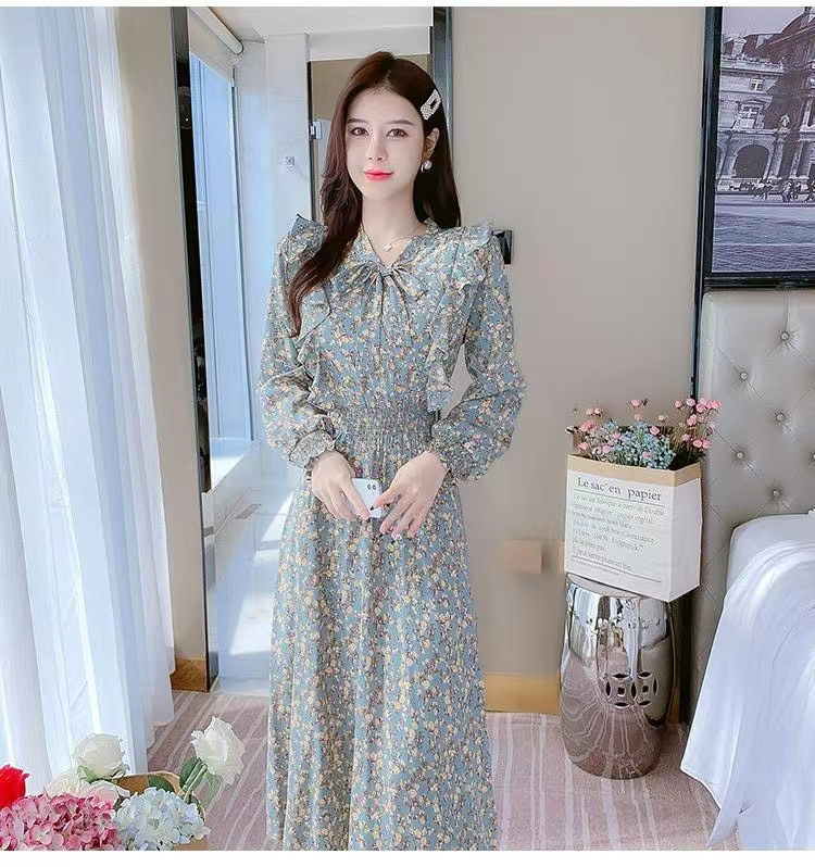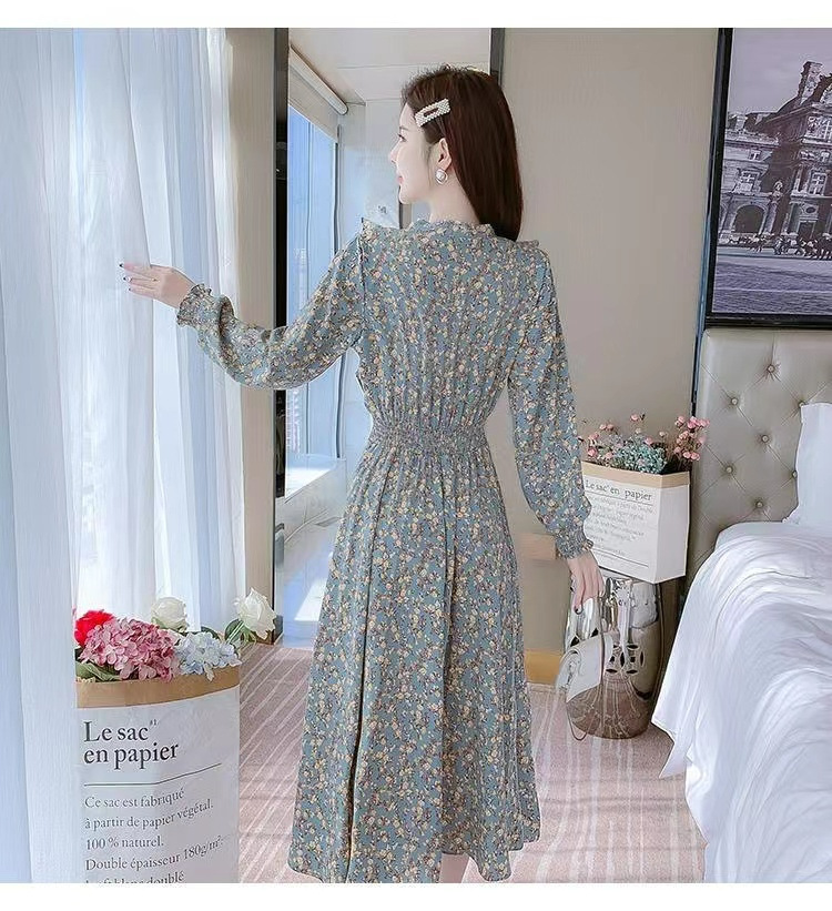 대외 무역, 주문하기 전에 진짜 프랑스 주름진 꽃 원피스 여성의 가을 새로운 허리를보십시오.스토어 가기