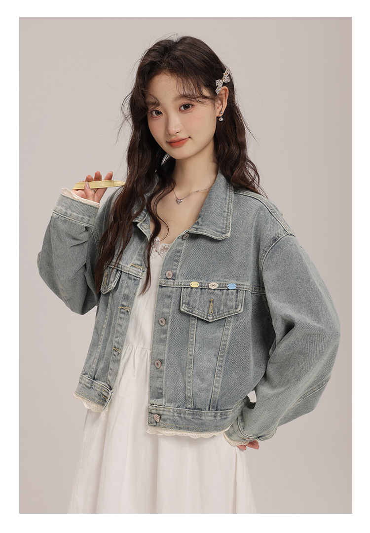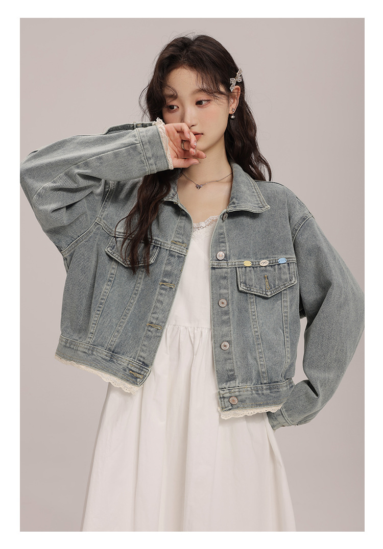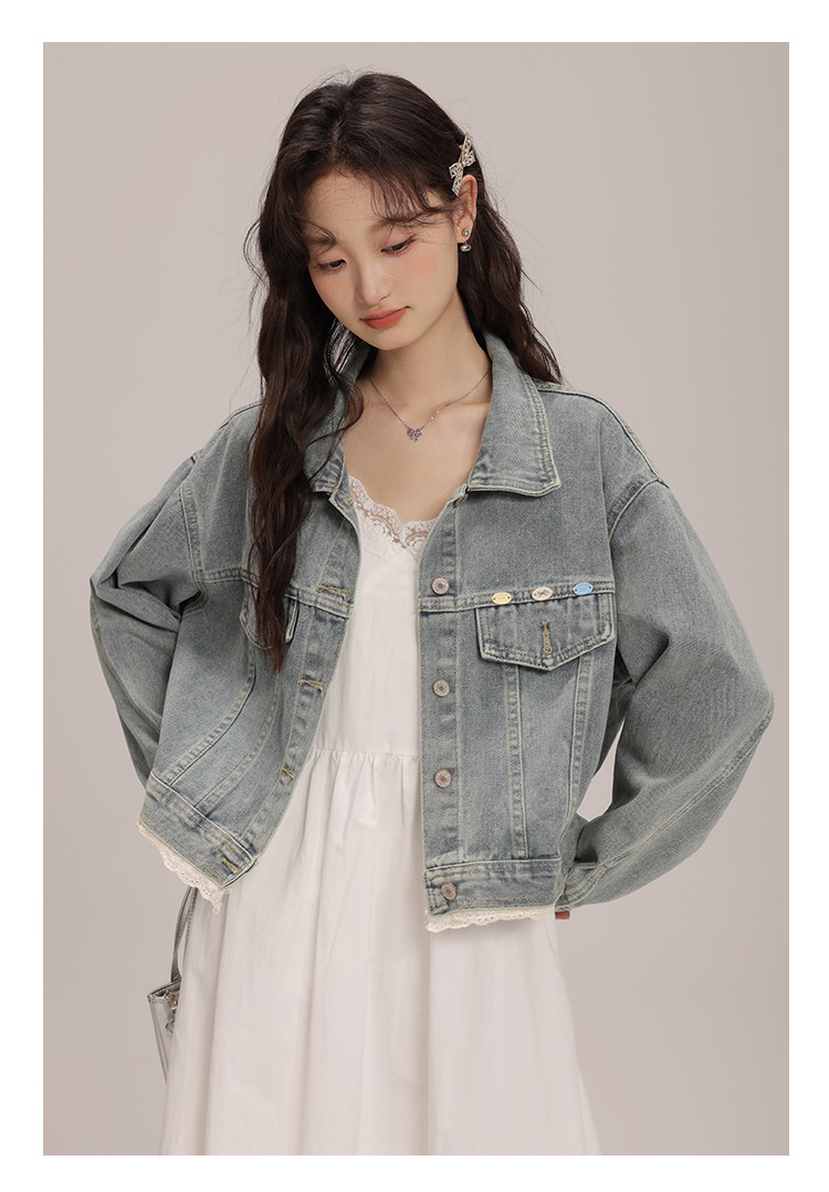 연마 된 바느질 레이스 데님 재킷 여성 봄과 여름 2025 새로운 느슨한 캐주얼 한국 스타일 다채로운 버클 재킷 탑