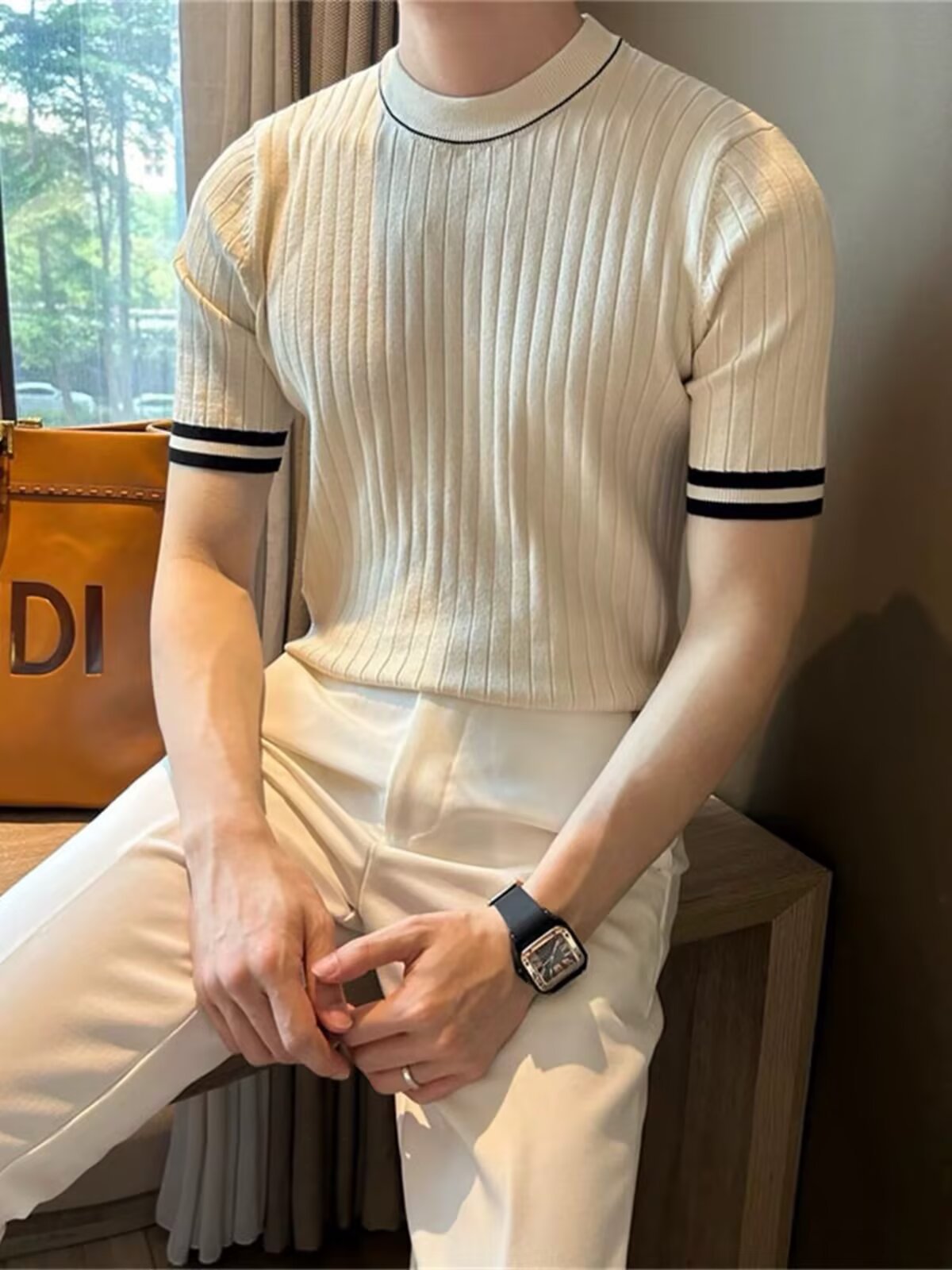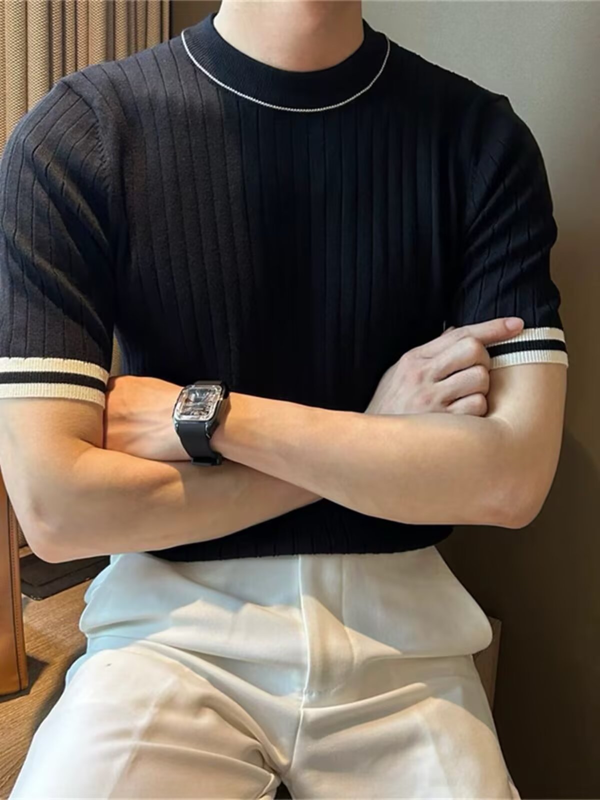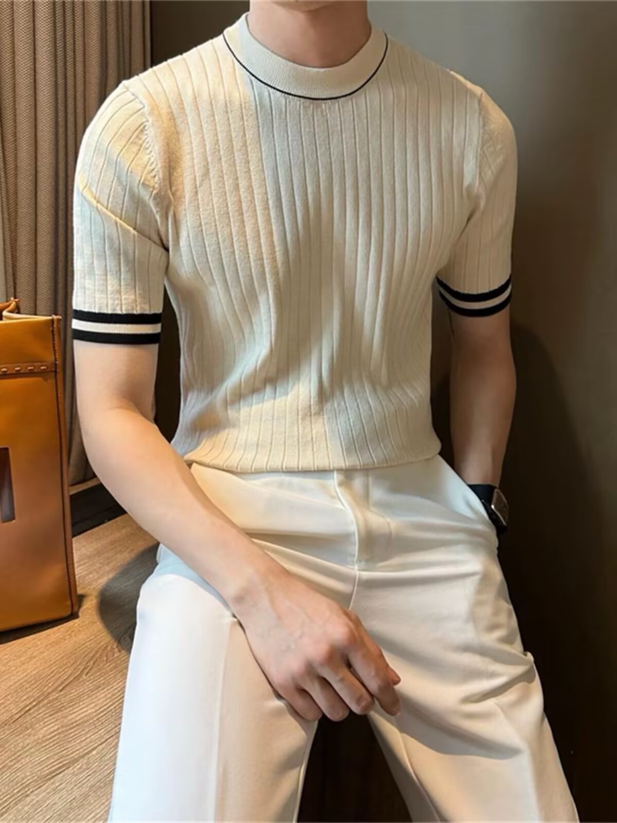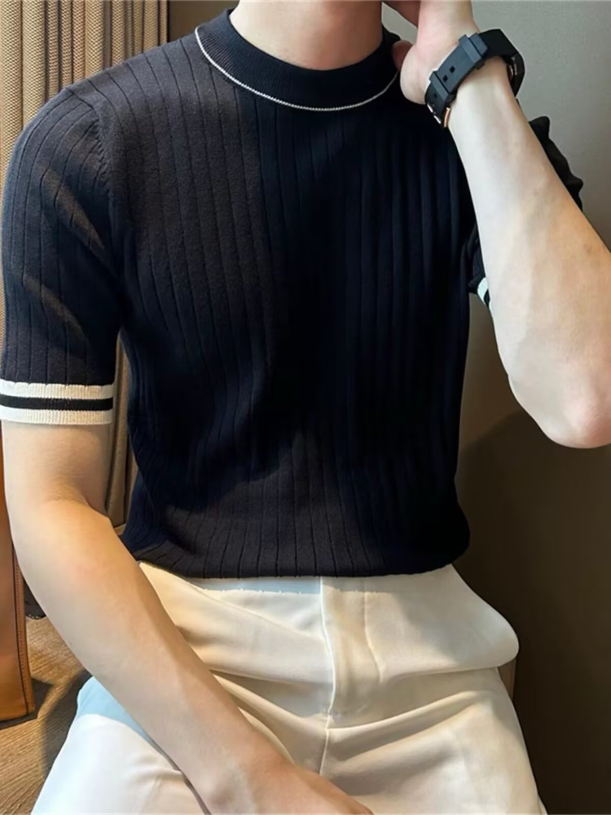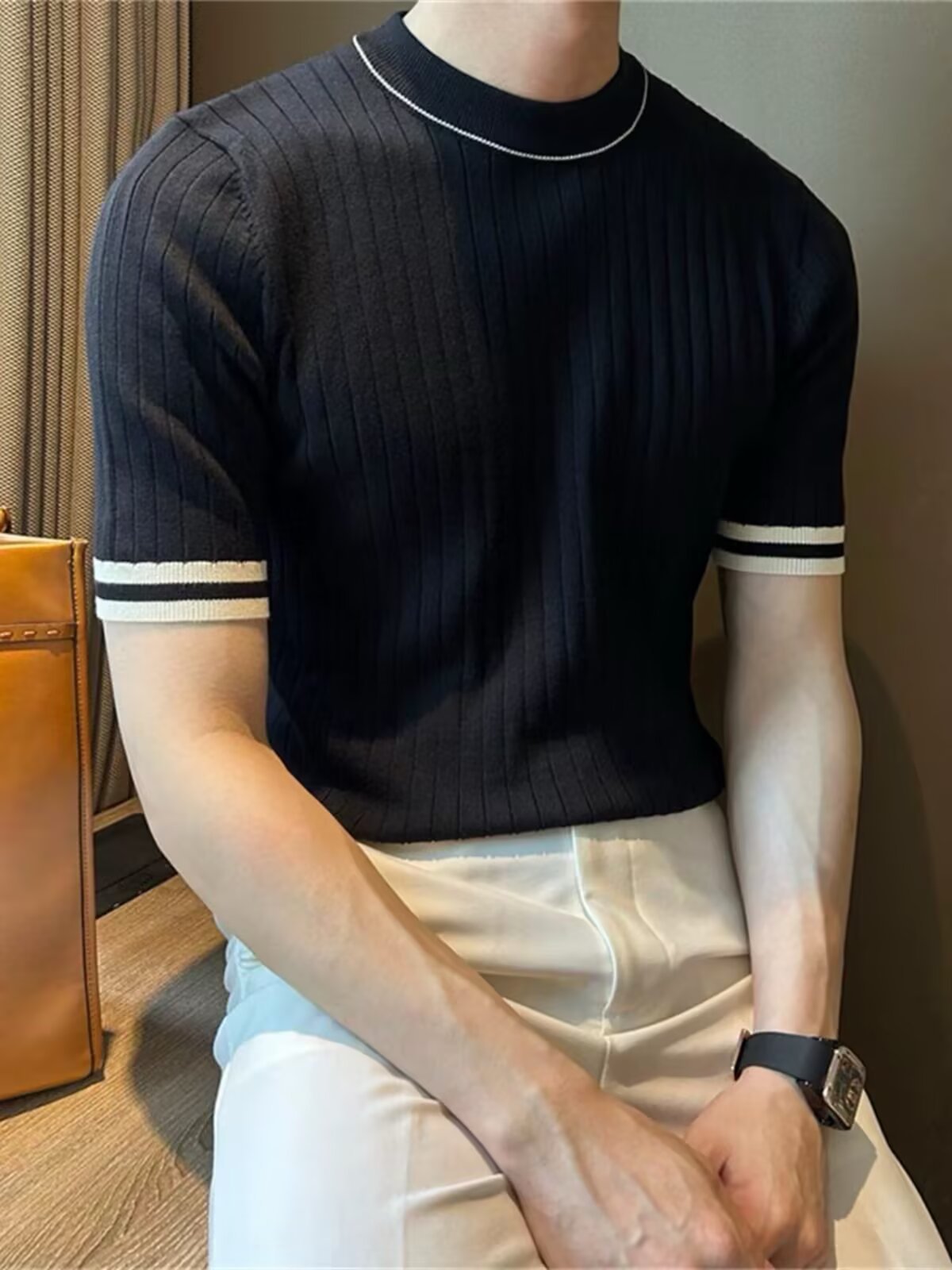 남자 반소매 아이스 실크 니트웨어 2025 여름 라운드 넥 올 매치 스트레치 탑 하이 엔드 슬림 핏 아이스 실크 스웨터스토어 가기