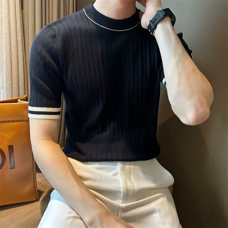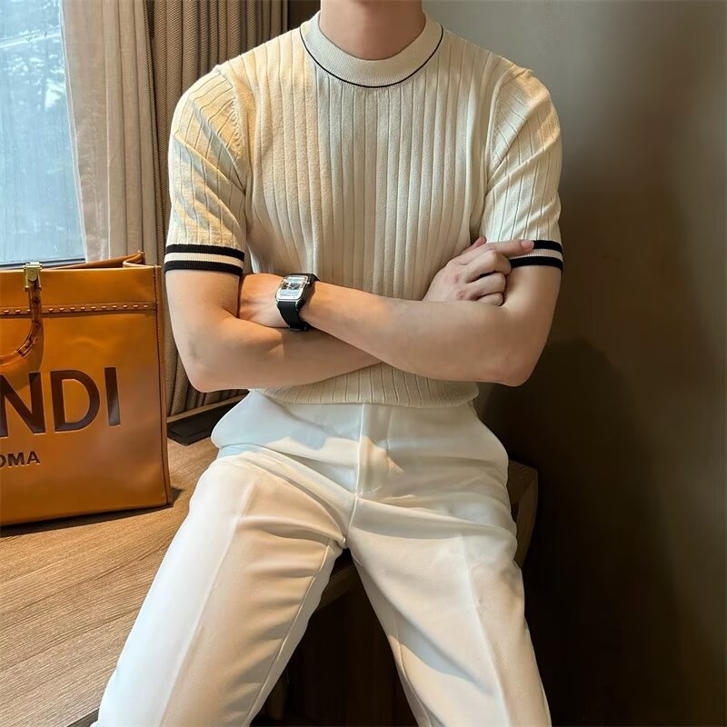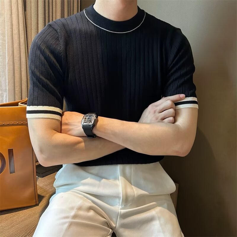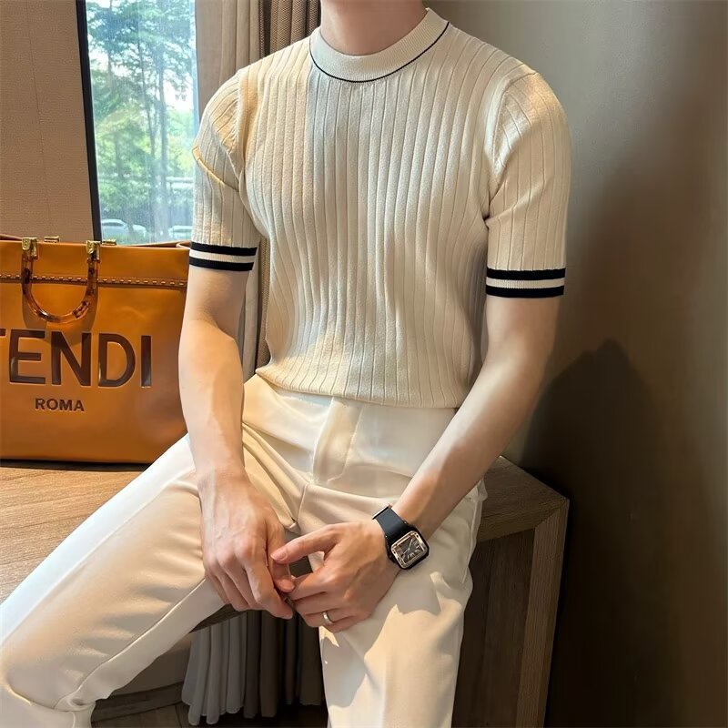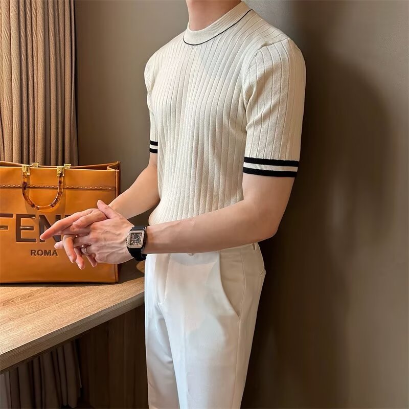 남자 반소매 아이스 실크 니트웨어 2025 여름 라운드 넥 올 매치 스트레치 탑 하이 엔드 슬림 핏 아이스 실크 스웨터