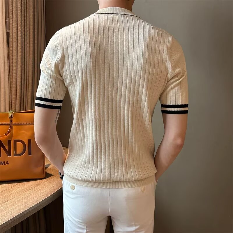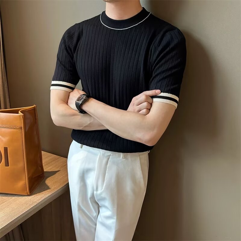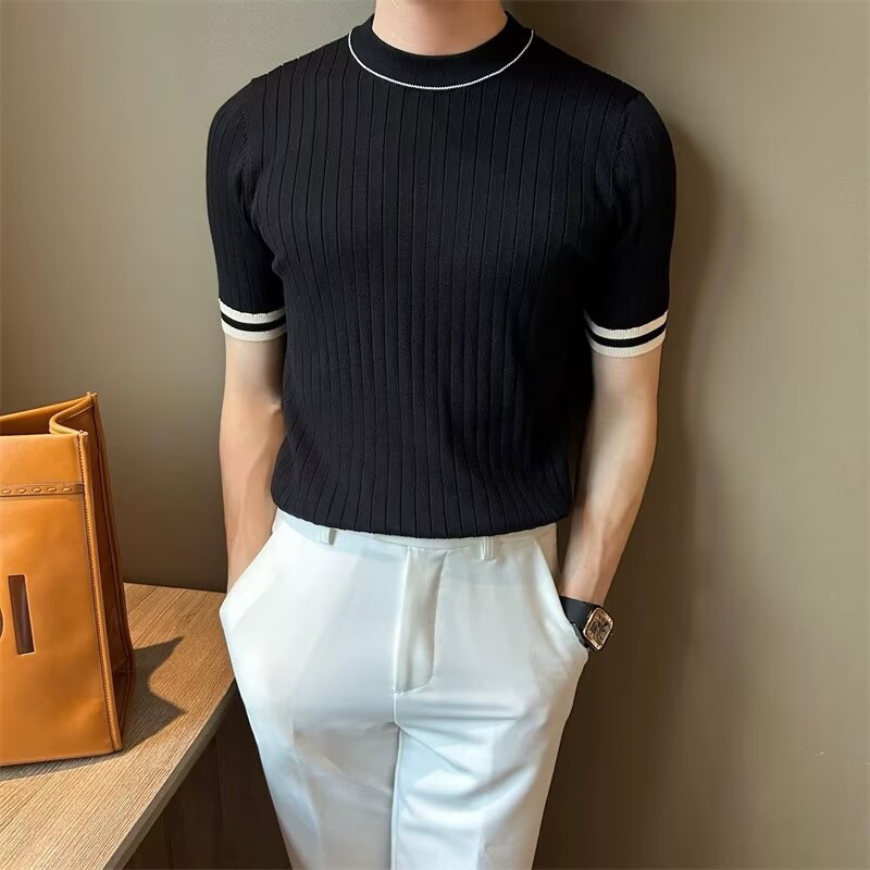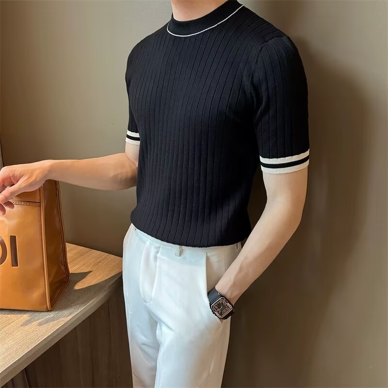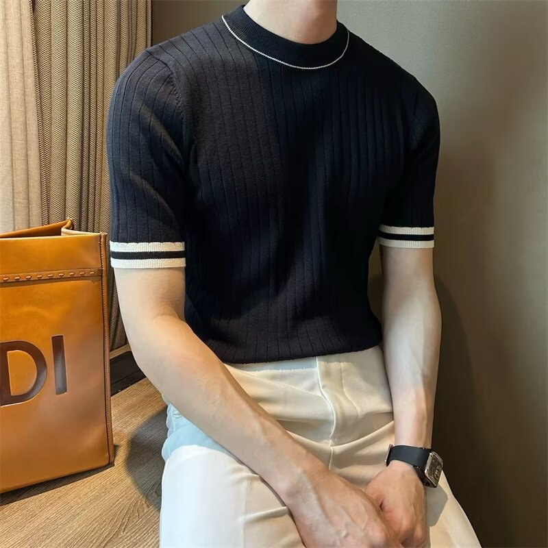 남자 반소매 아이스 실크 니트웨어 2025 여름 라운드 넥 올 매치 스트레치 탑 하이 엔드 슬림 핏 아이스 실크 스웨터