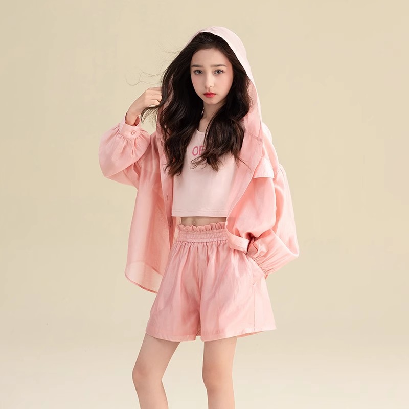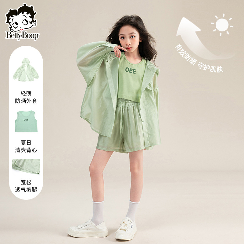 베티 걸스 서양식 세트 2025 여름 새 조끼 반바지 선 스크린 재킷 소녀 어린이 3 종 세트