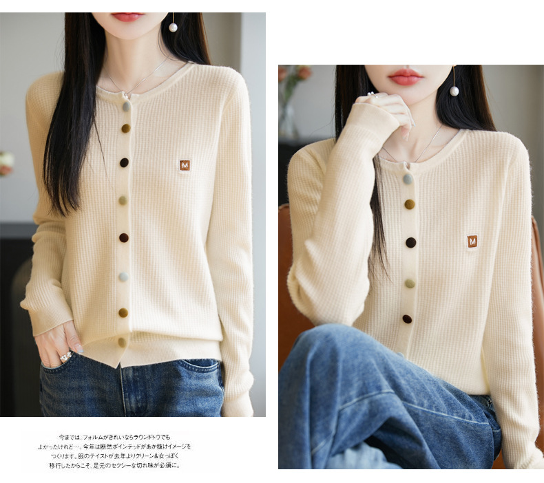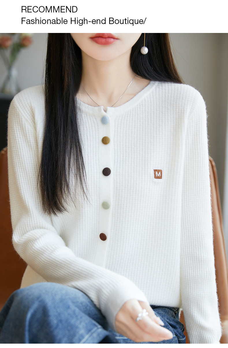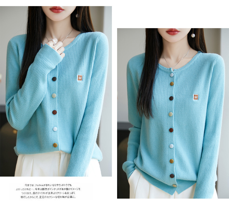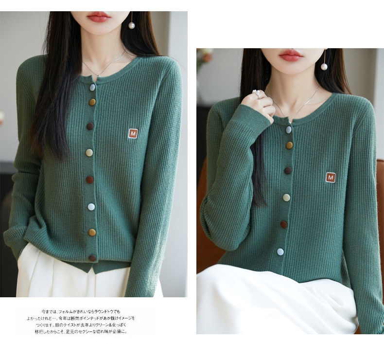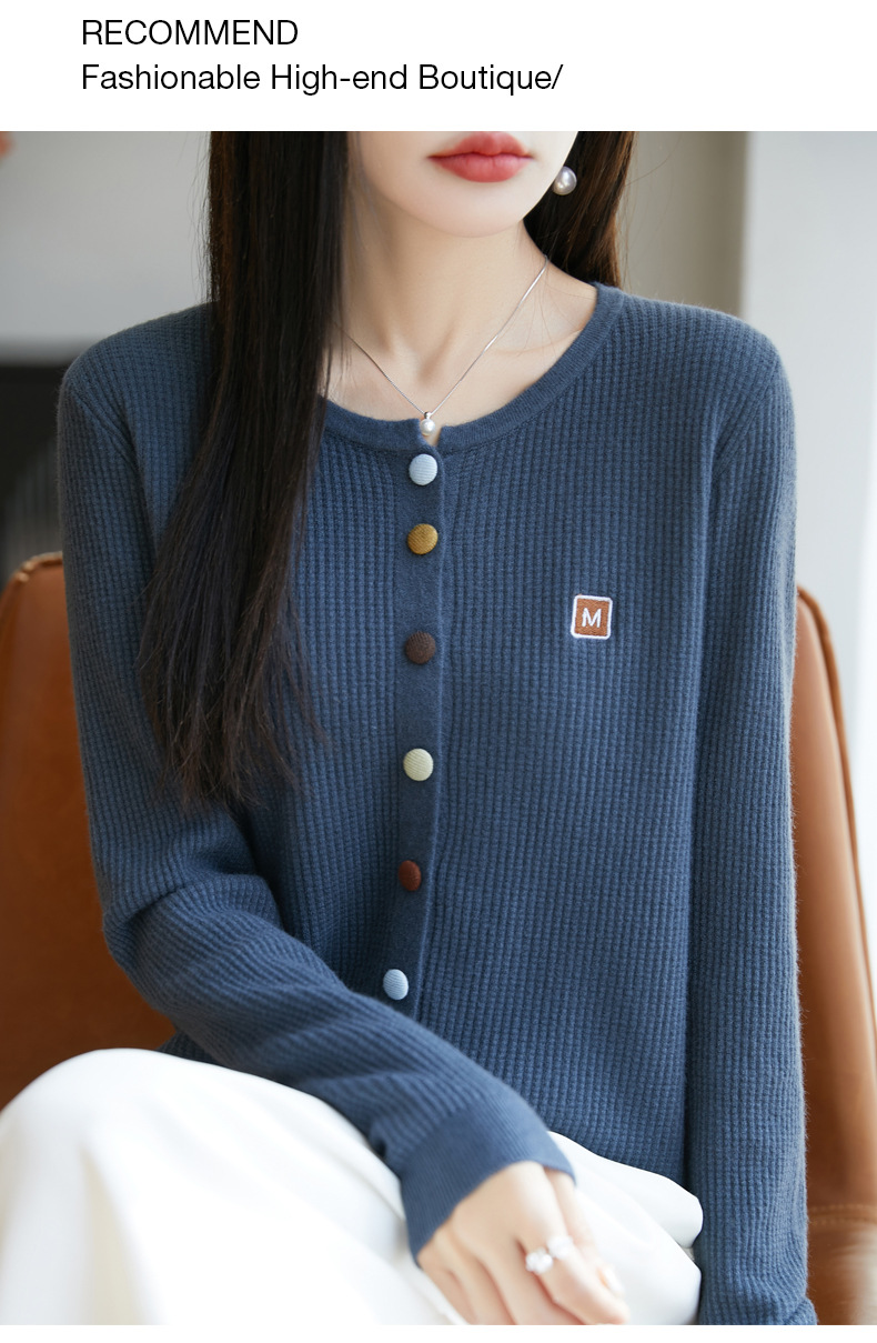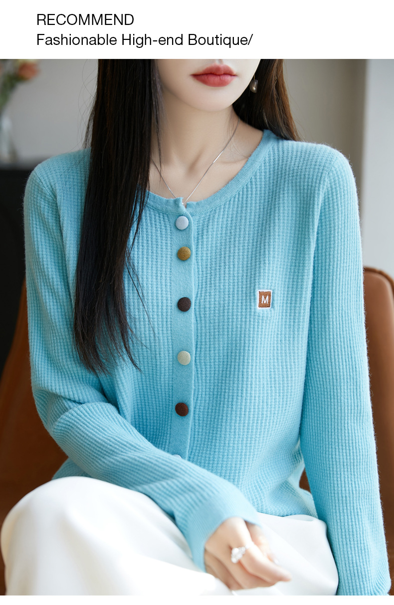 다채로운 버클 한국 스타일 캐주얼 니트 라운드 넥 카디건 여성 2025 봄 새로운 프랑스 인기 스웨터 재킷스토어 가기