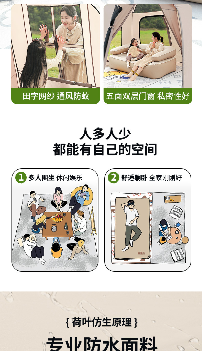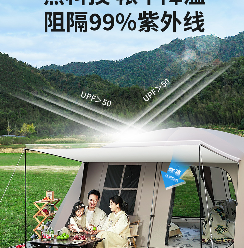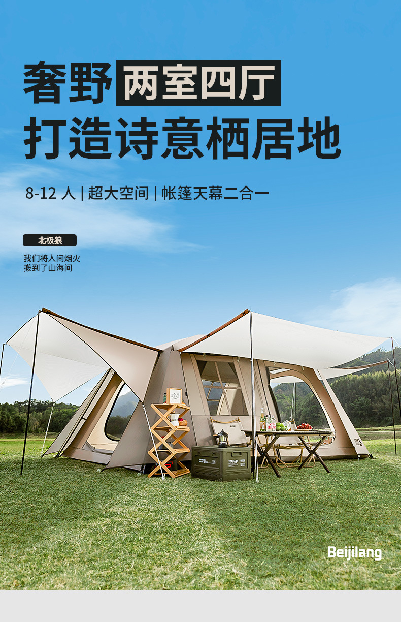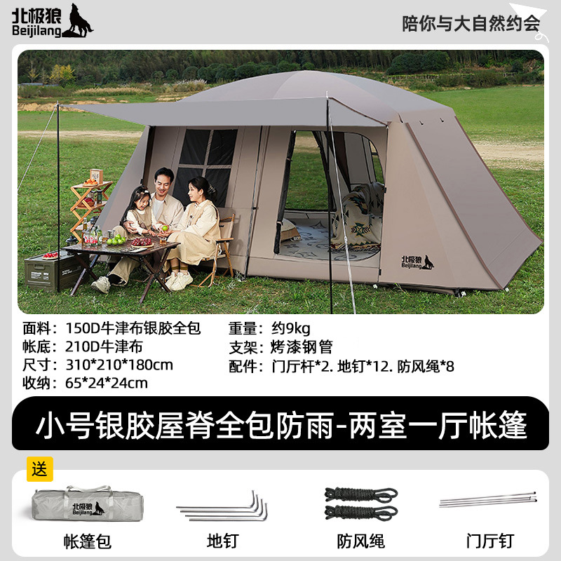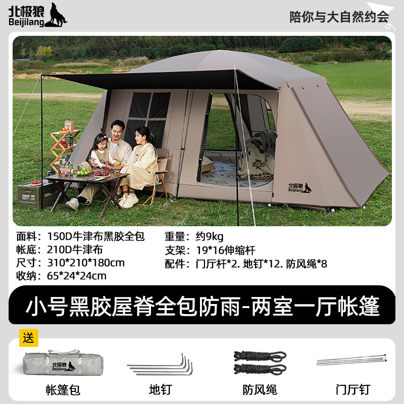 텐트 야외 캠핑 장비 공급 검은 고무 지붕 13 선 스크린 및 방비 2 개의 객실과 1 개의 홀 캠핑 하룻밤 텐트