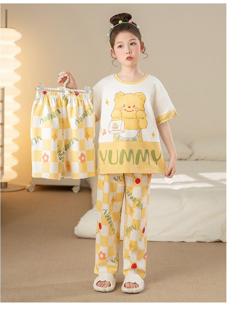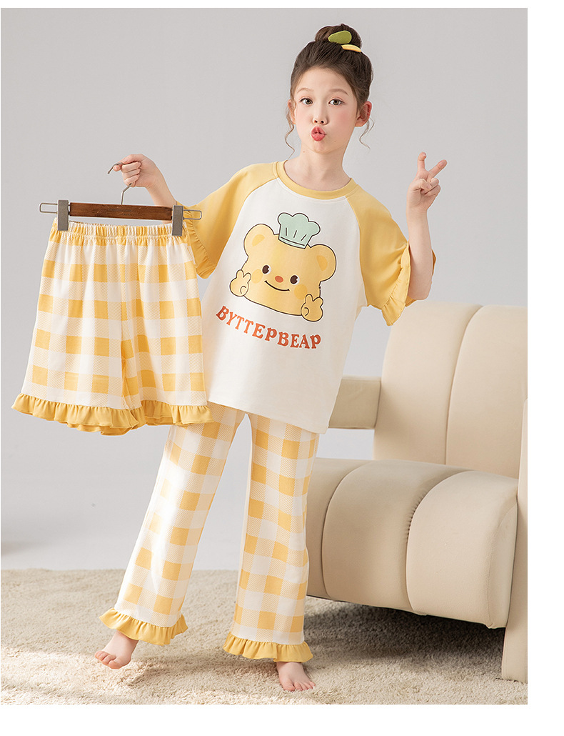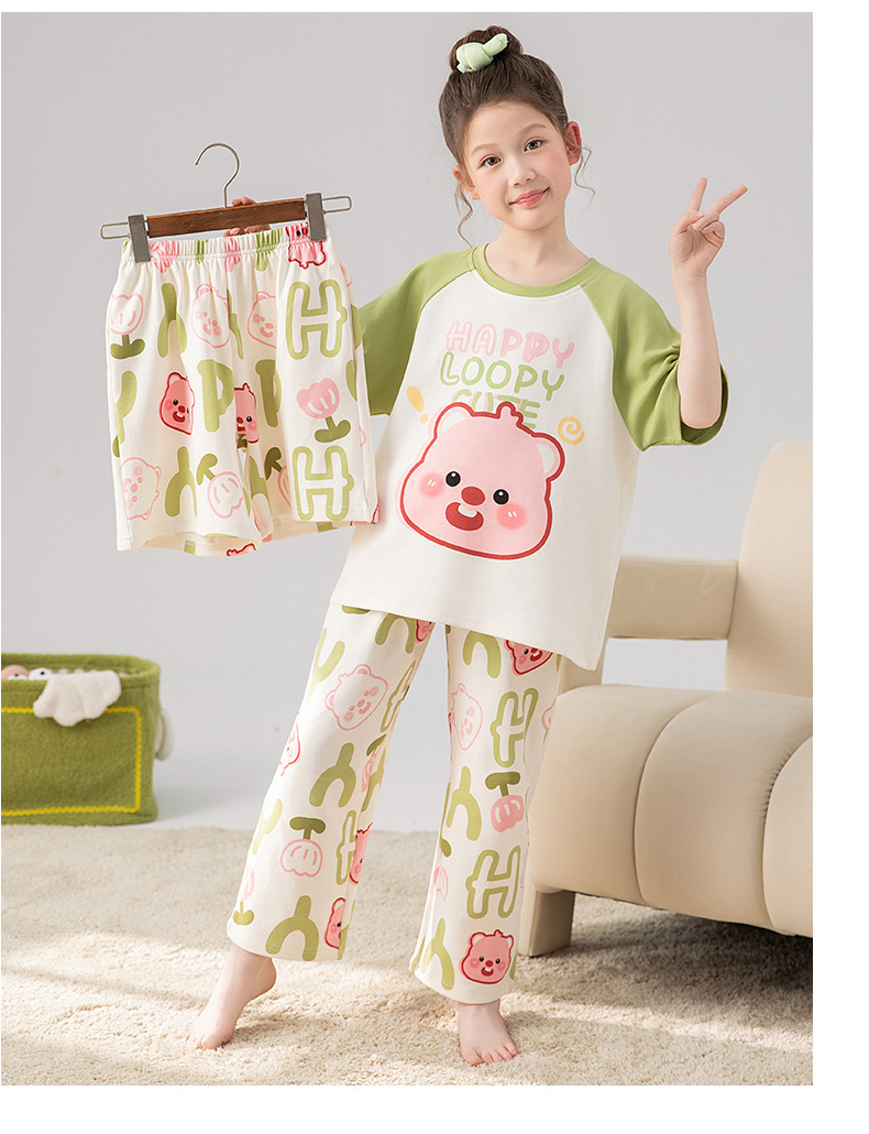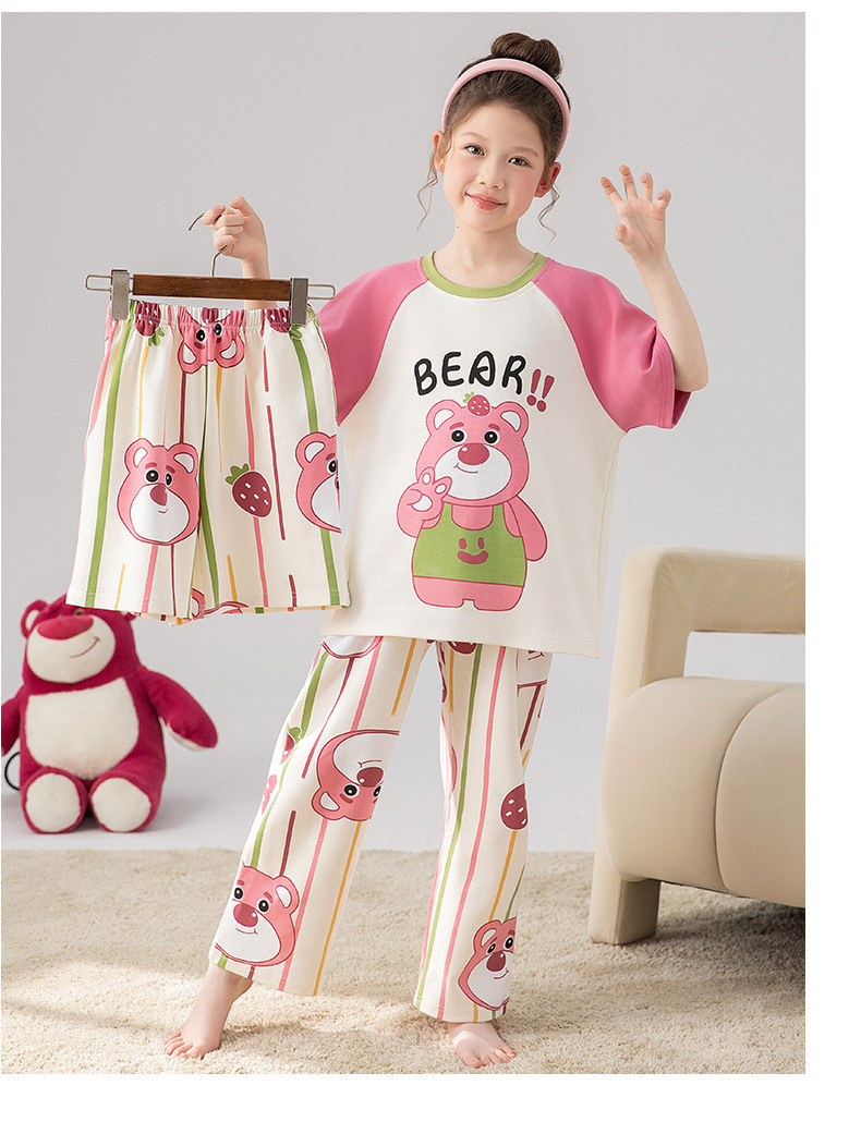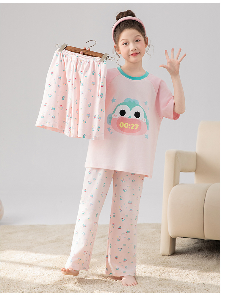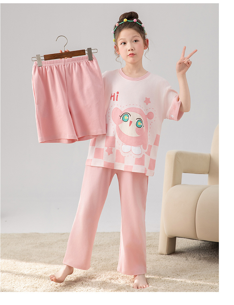 어린이 잠옷 소녀 여름 면 3 종 세트 2025 새 소녀의 얇은 반팔 바지 홈 옷 봄 옷