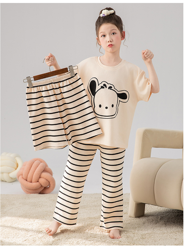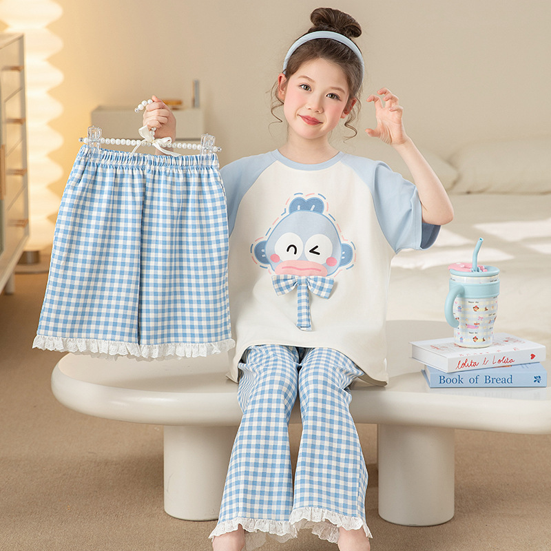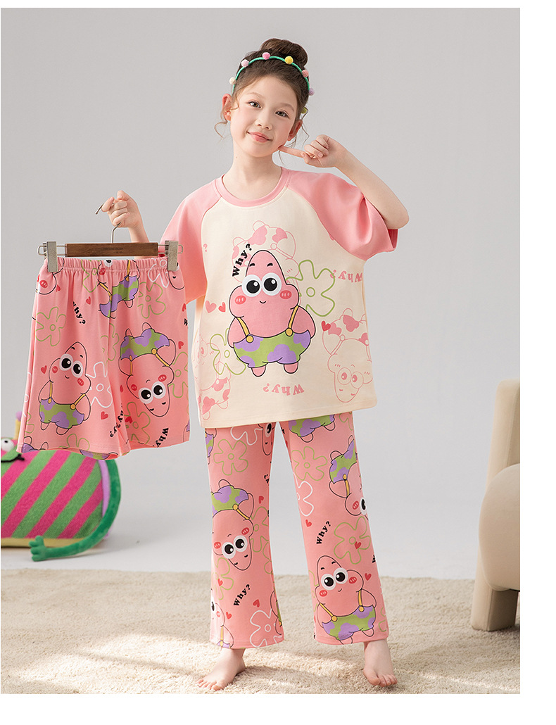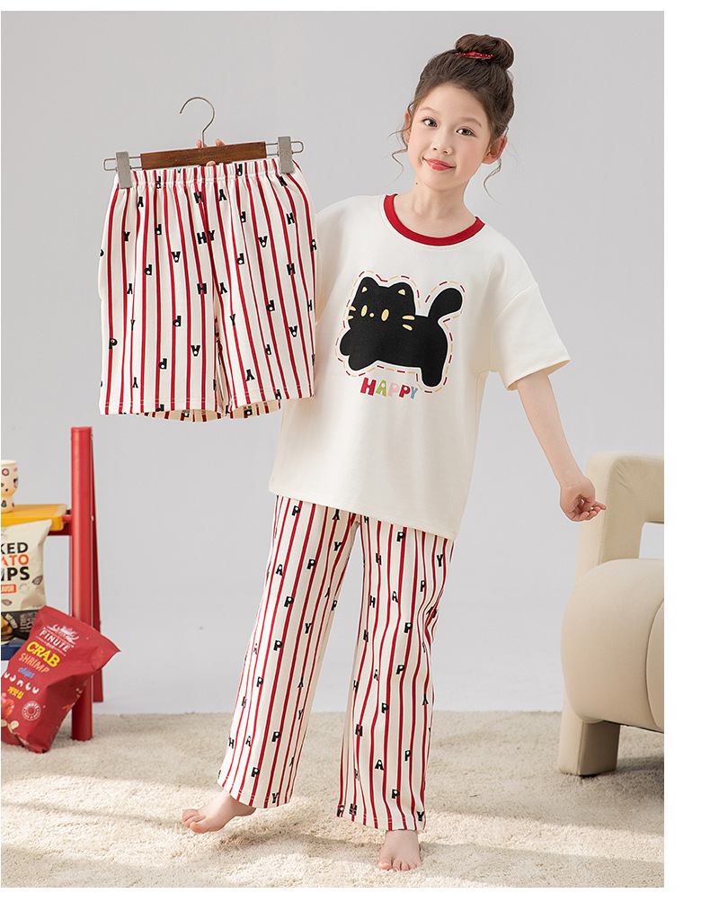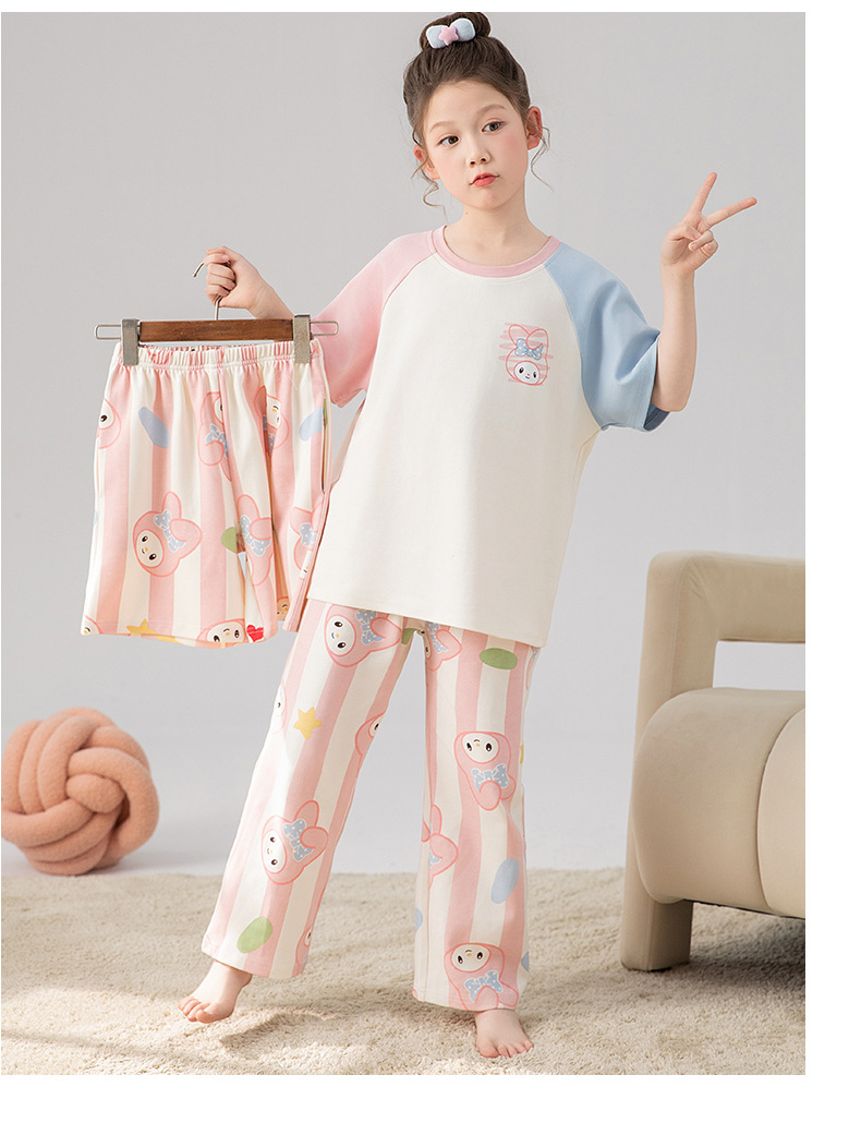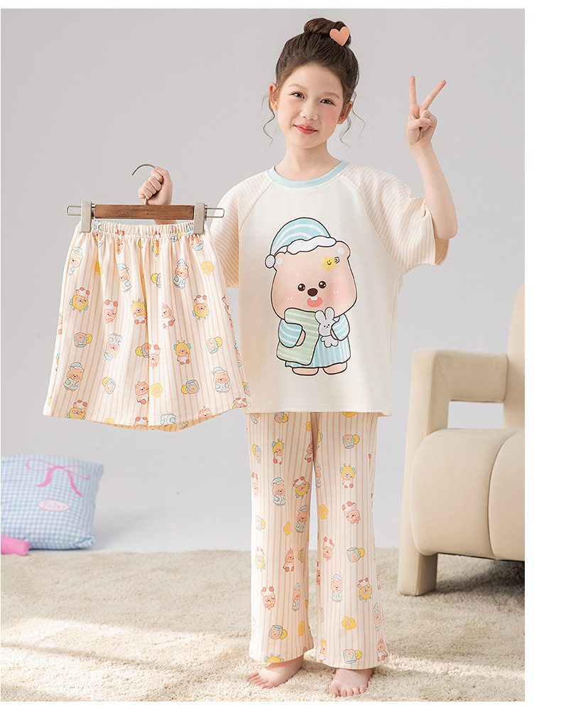 어린이 잠옷 소녀 여름 면 3 종 세트 2025 새 소녀의 얇은 반팔 바지 홈 옷 봄 옷스토어 가기