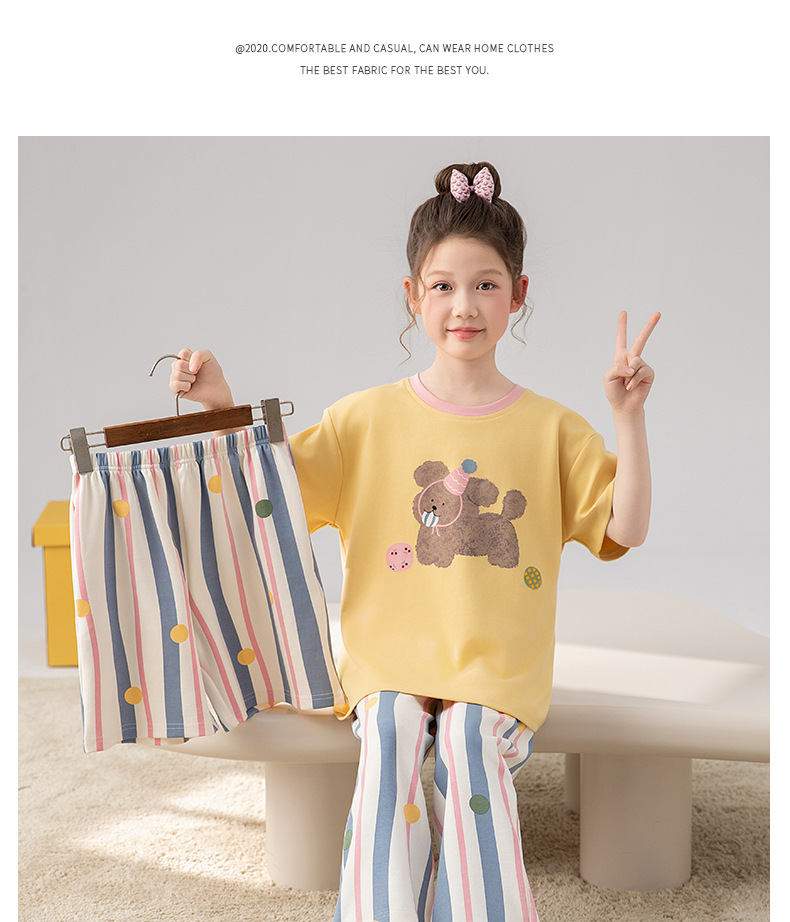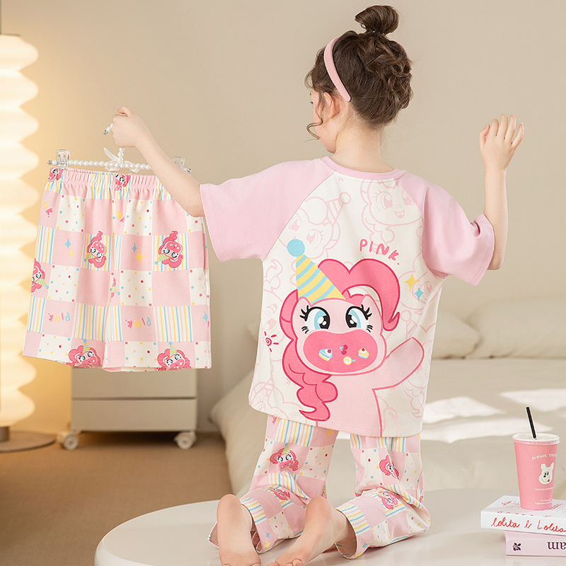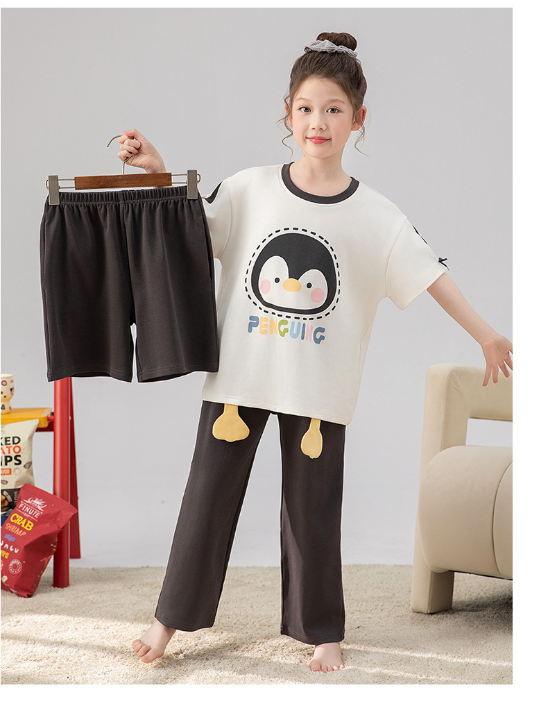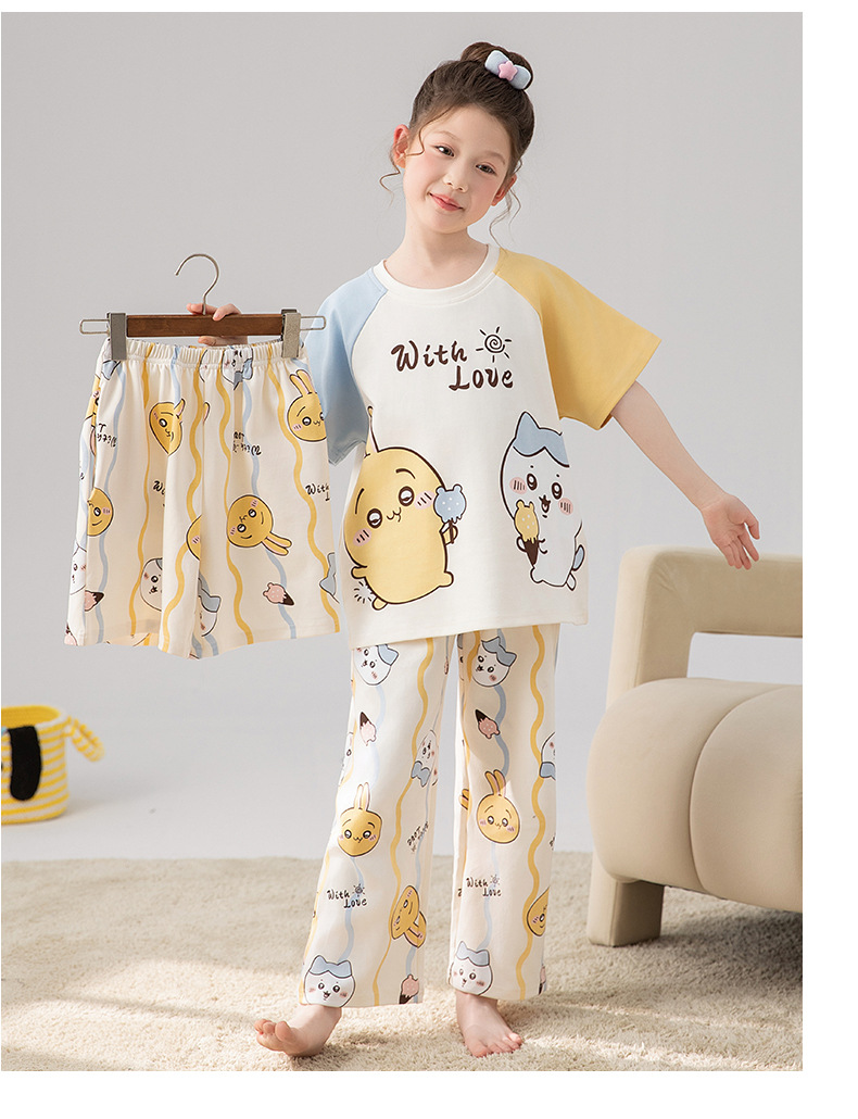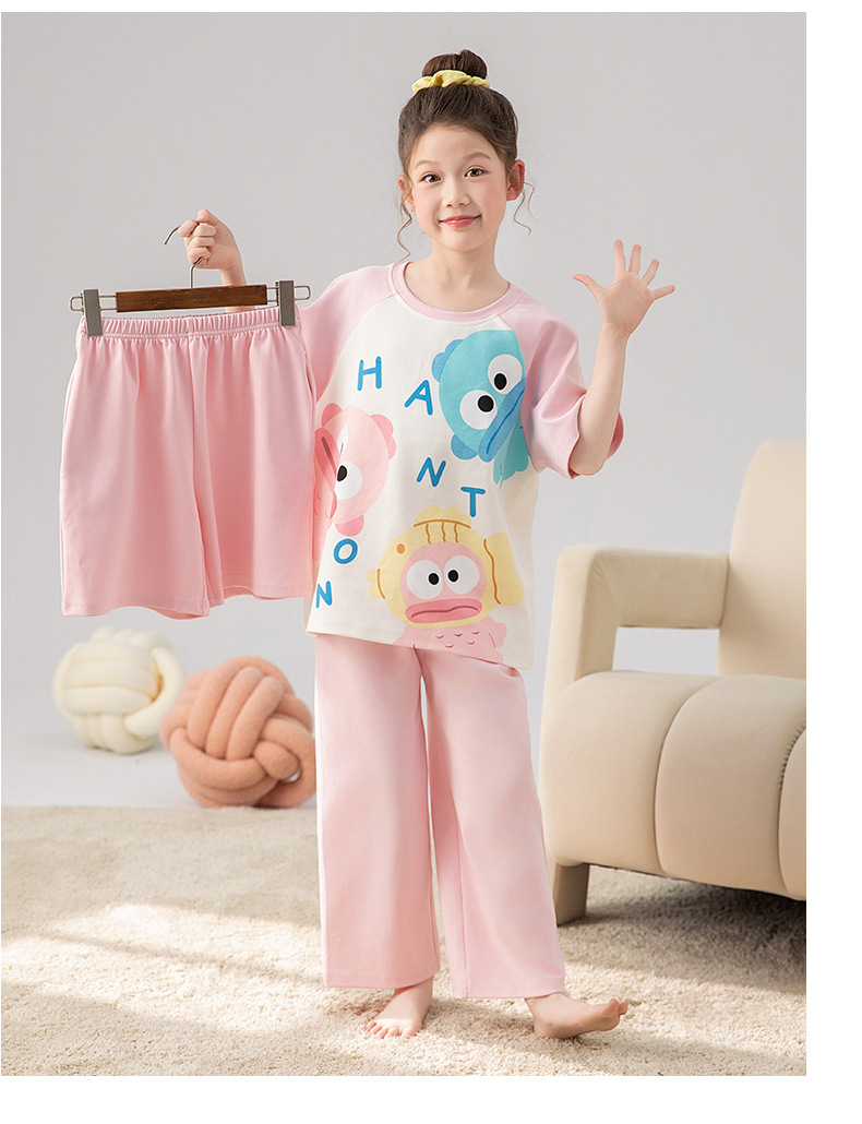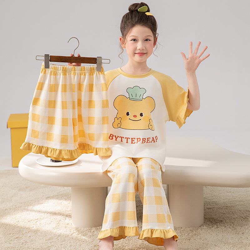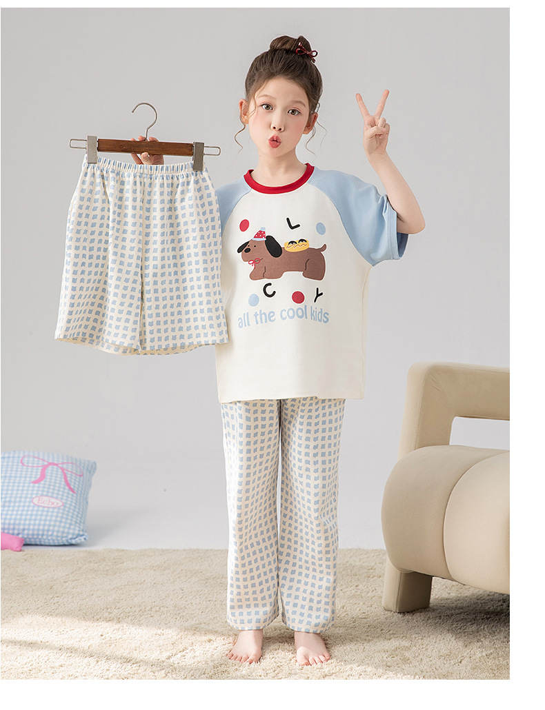 어린이 잠옷 소녀 여름 면 3 종 세트 2025 새 소녀의 얇은 반팔 바지 홈 옷 봄 옷스토어 가기