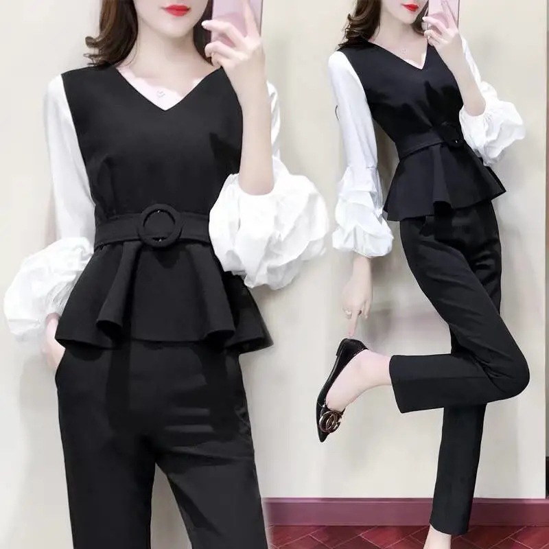 유럽과 미국의 국경 플러스 사이즈 여성 뚱뚱한 배 세트 여성 패션 새로운 프로 봄과 가을 버블 소매 투피스 세트