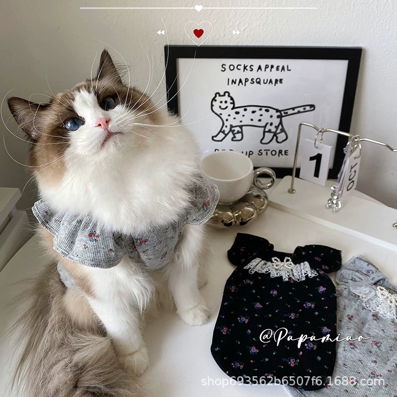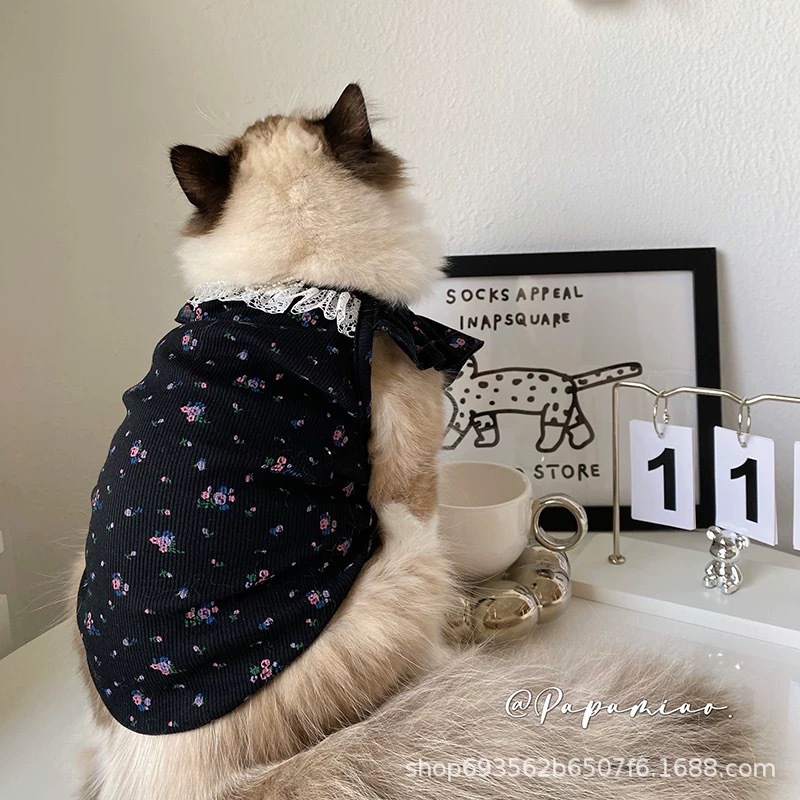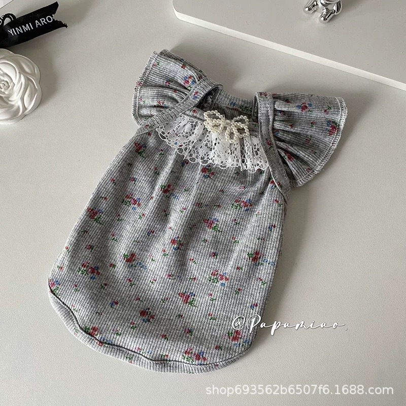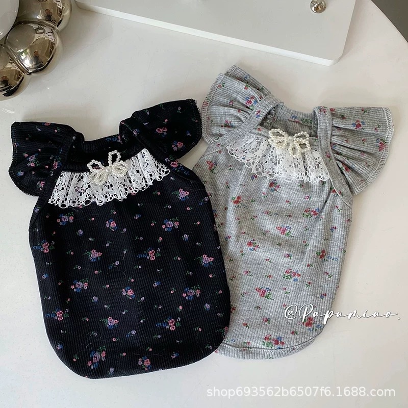 비행 소매 꽃 애완 동물 조끼 테디 개 봄과 여름 공주 레이스 얇은 안티 린트 아이스 실크 고양이 옷스토어 가기