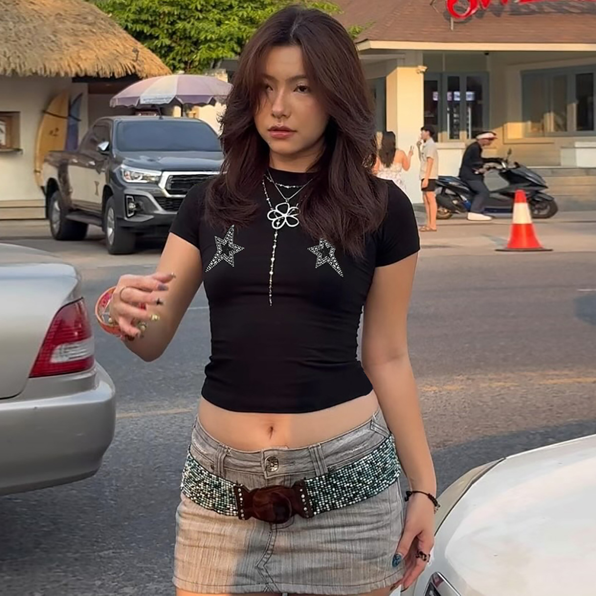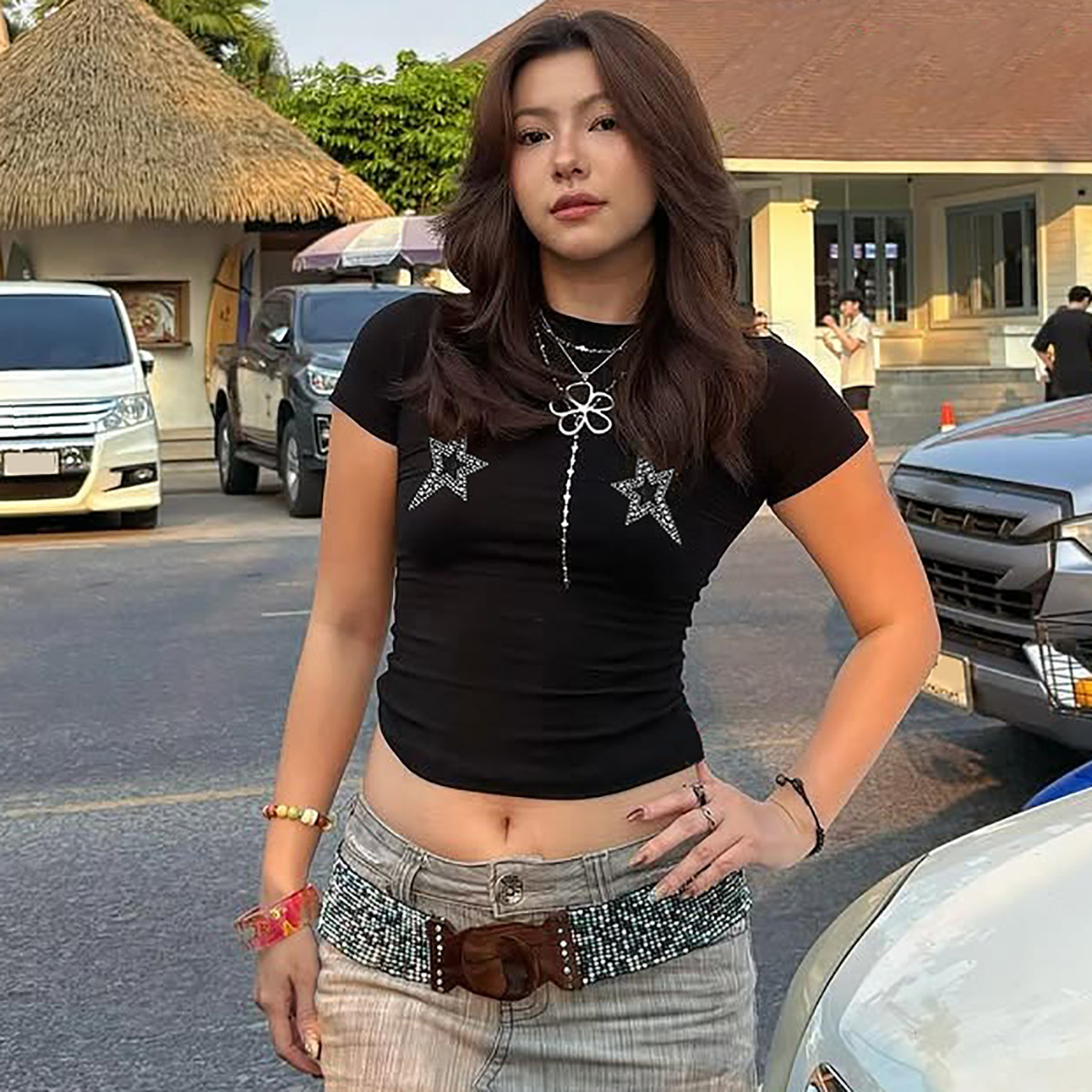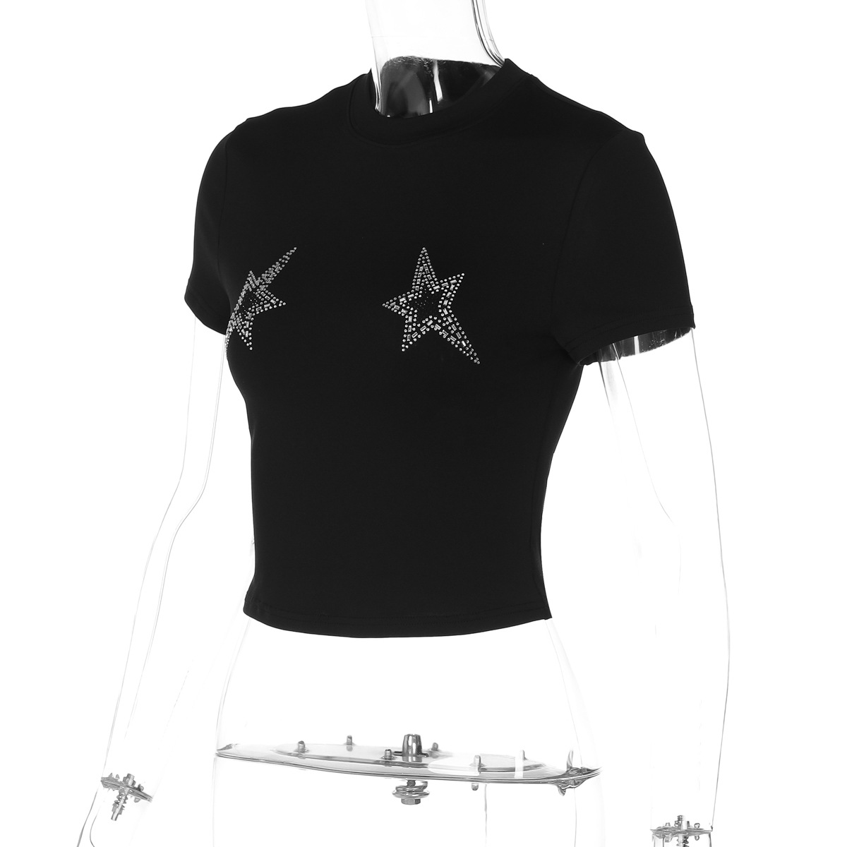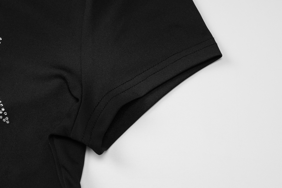 유럽과 미국 인기 판매 여성 2025 여름 새로운 패션 캐주얼 핫 드릴링 슬림 라운드 넥 짧은 소매 티셔츠 재킷 도매스토어 가기