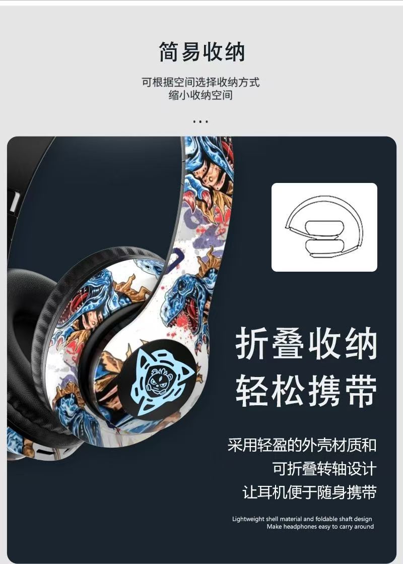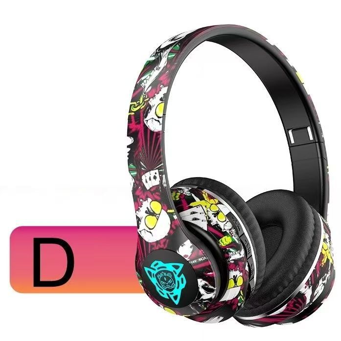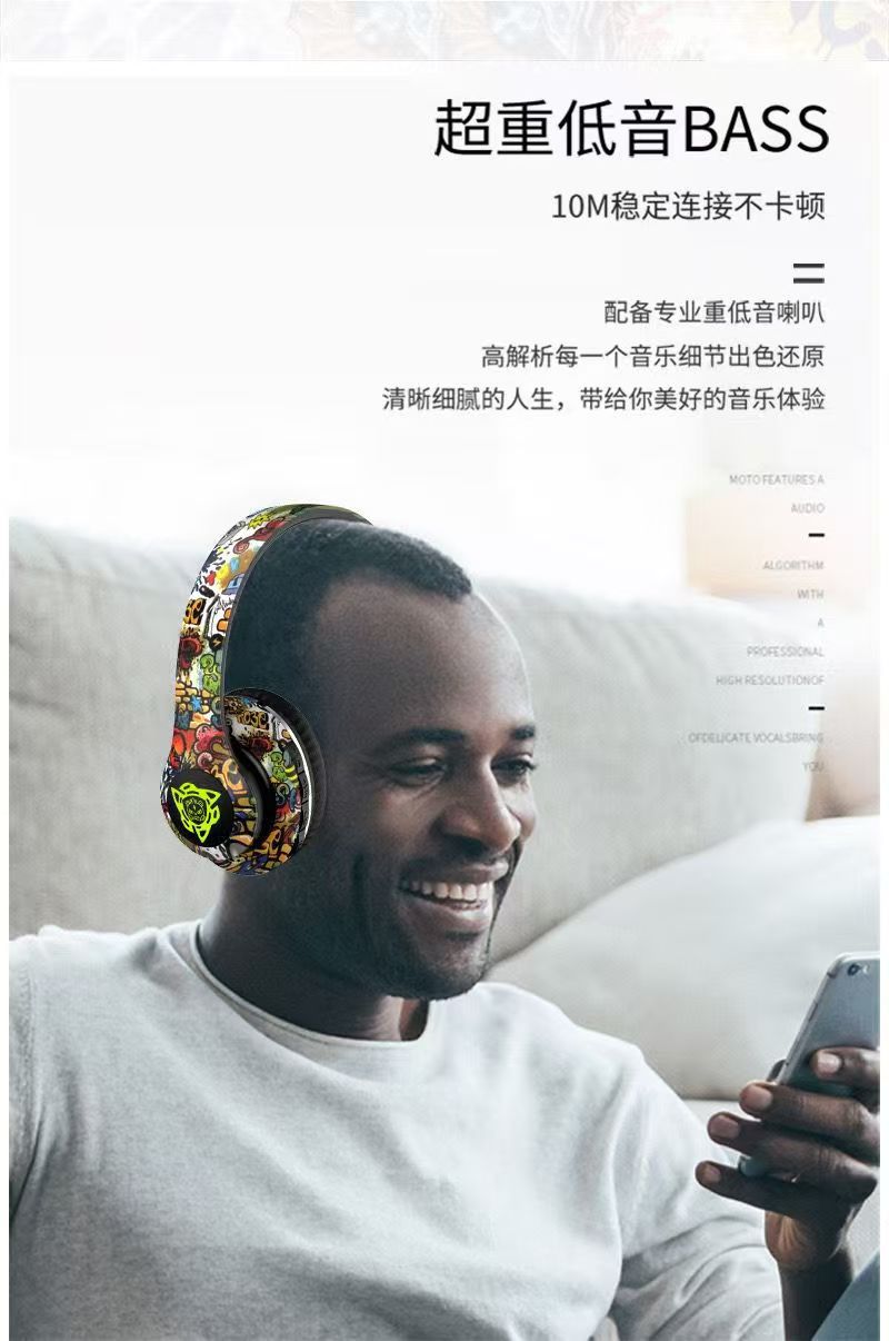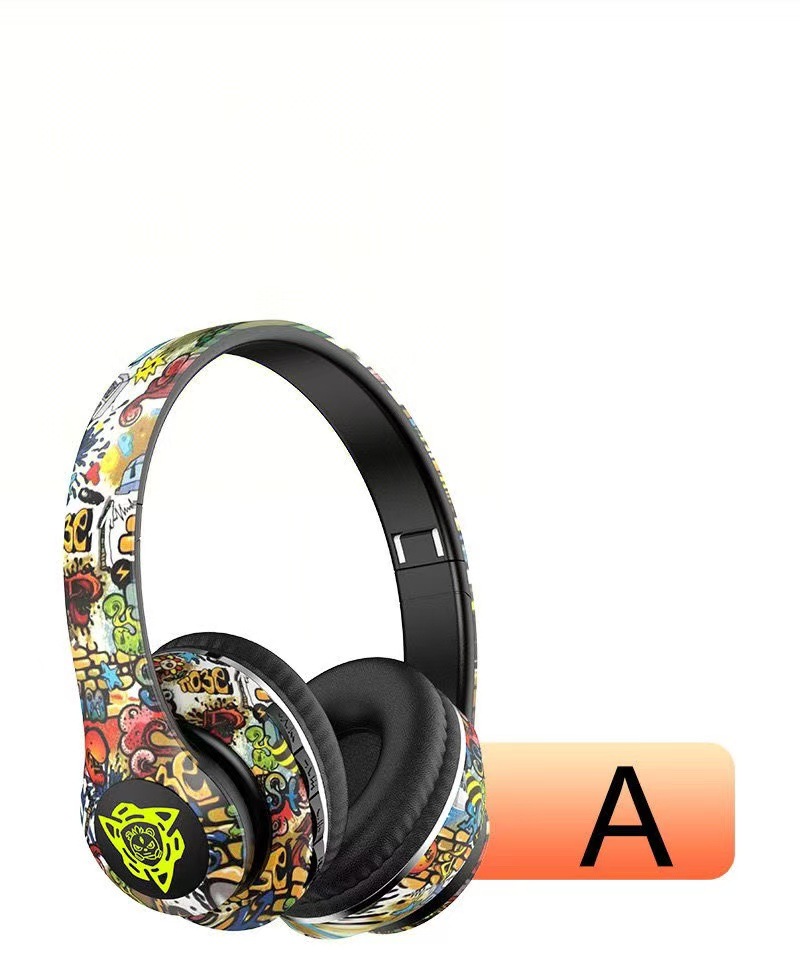 跨境爆款头戴式蓝牙耳机无线耳麦国潮涂鸦新款立体声运动重低音