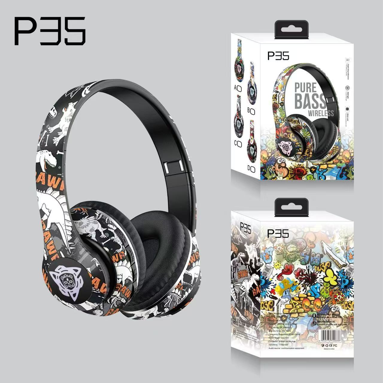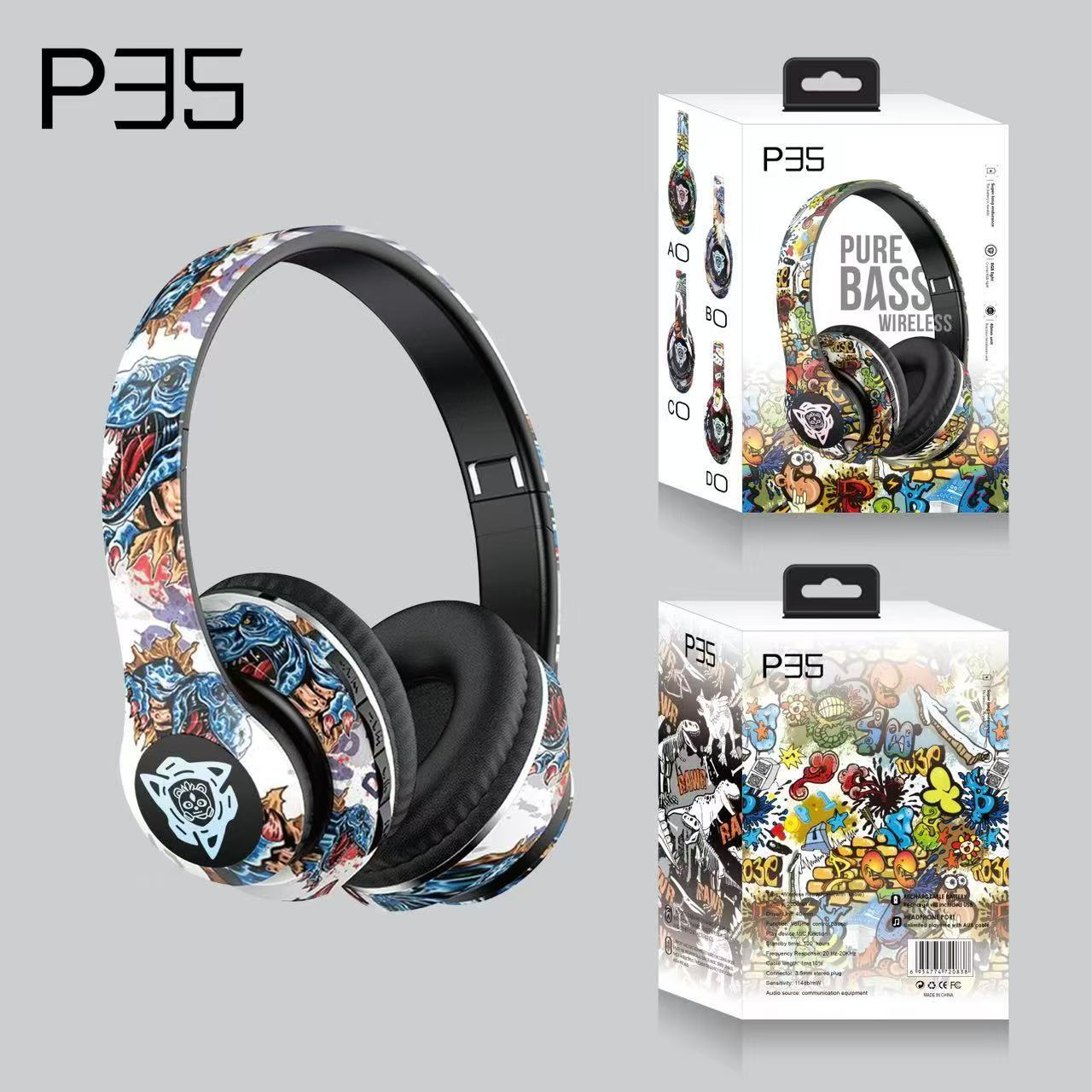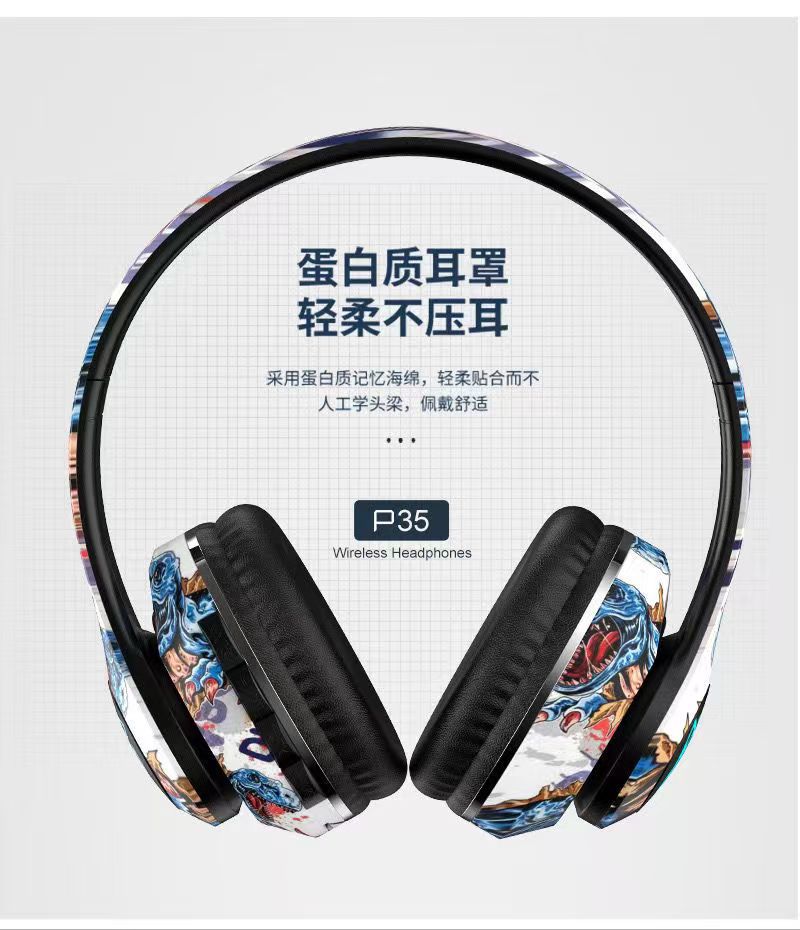 跨境爆款头戴式蓝牙耳机无线耳麦国潮涂鸦新款立体声运动重低音