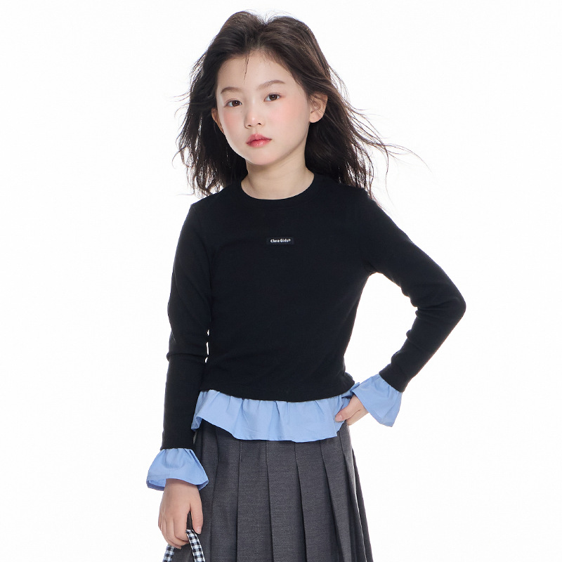 걸스 페이크 투피스 콘트라스트 긴팔 티셔츠 2025 봄과 여름 어린이 슬림핏 크루 넥 패셔너블 스티칭 레이스 탑