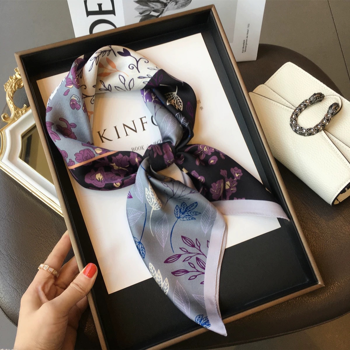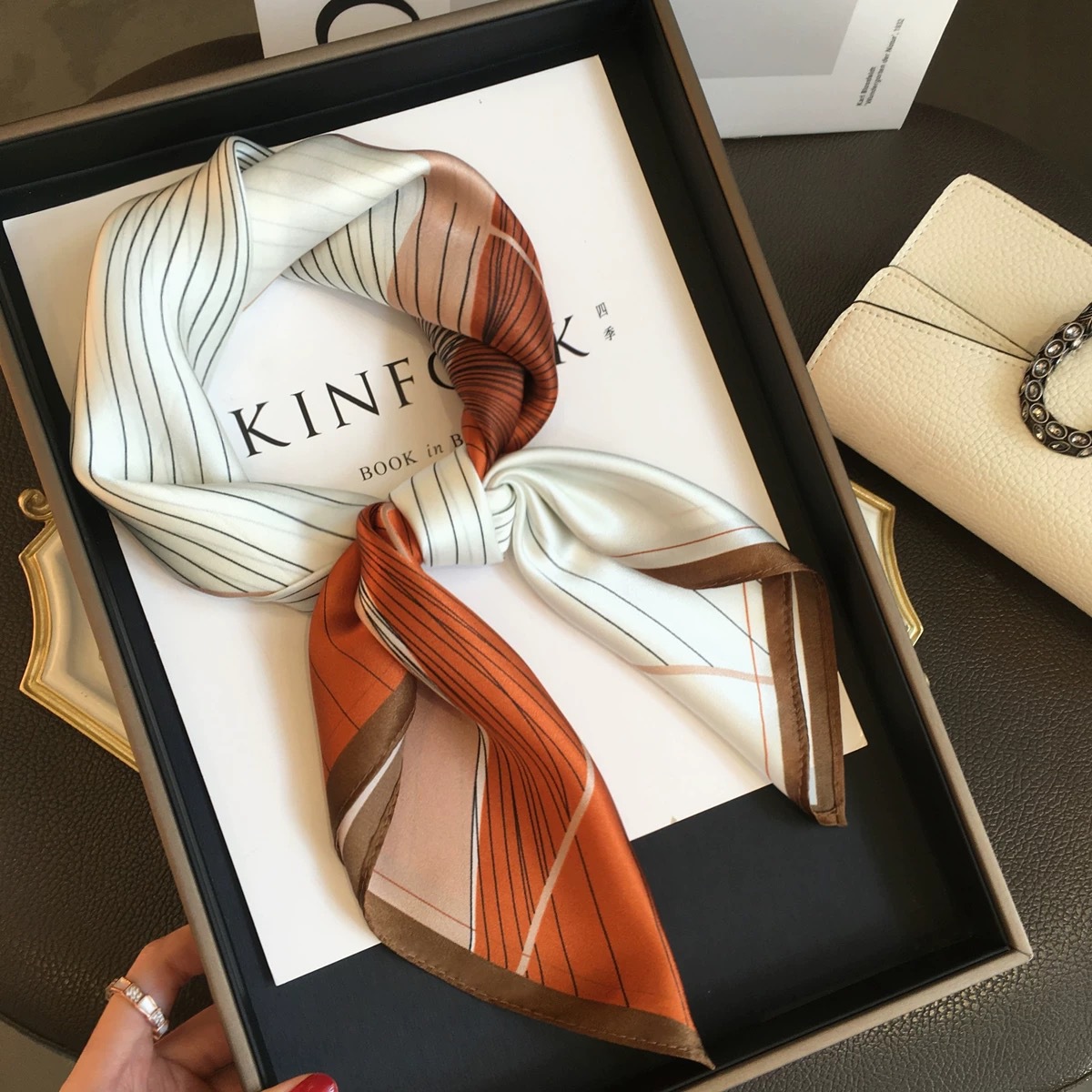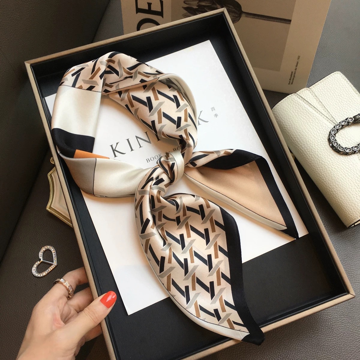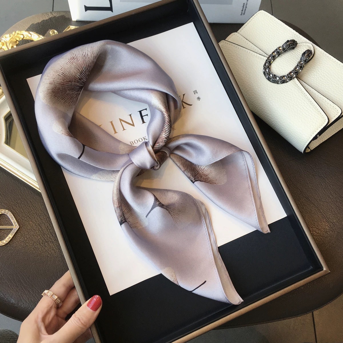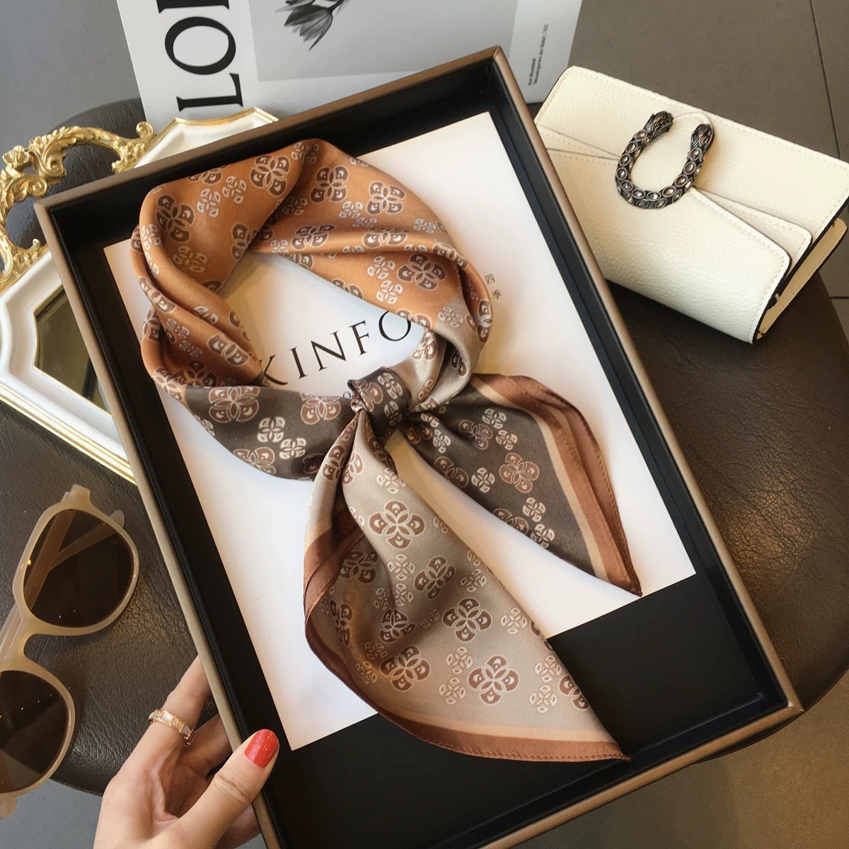 고급 작은 실크 스카프 한국 세련된 봄과 가을 장식 70 스퀘어 스카프 넥타이 헤어 넥타이 백 얇은 인쇄 스카프스토어 가기