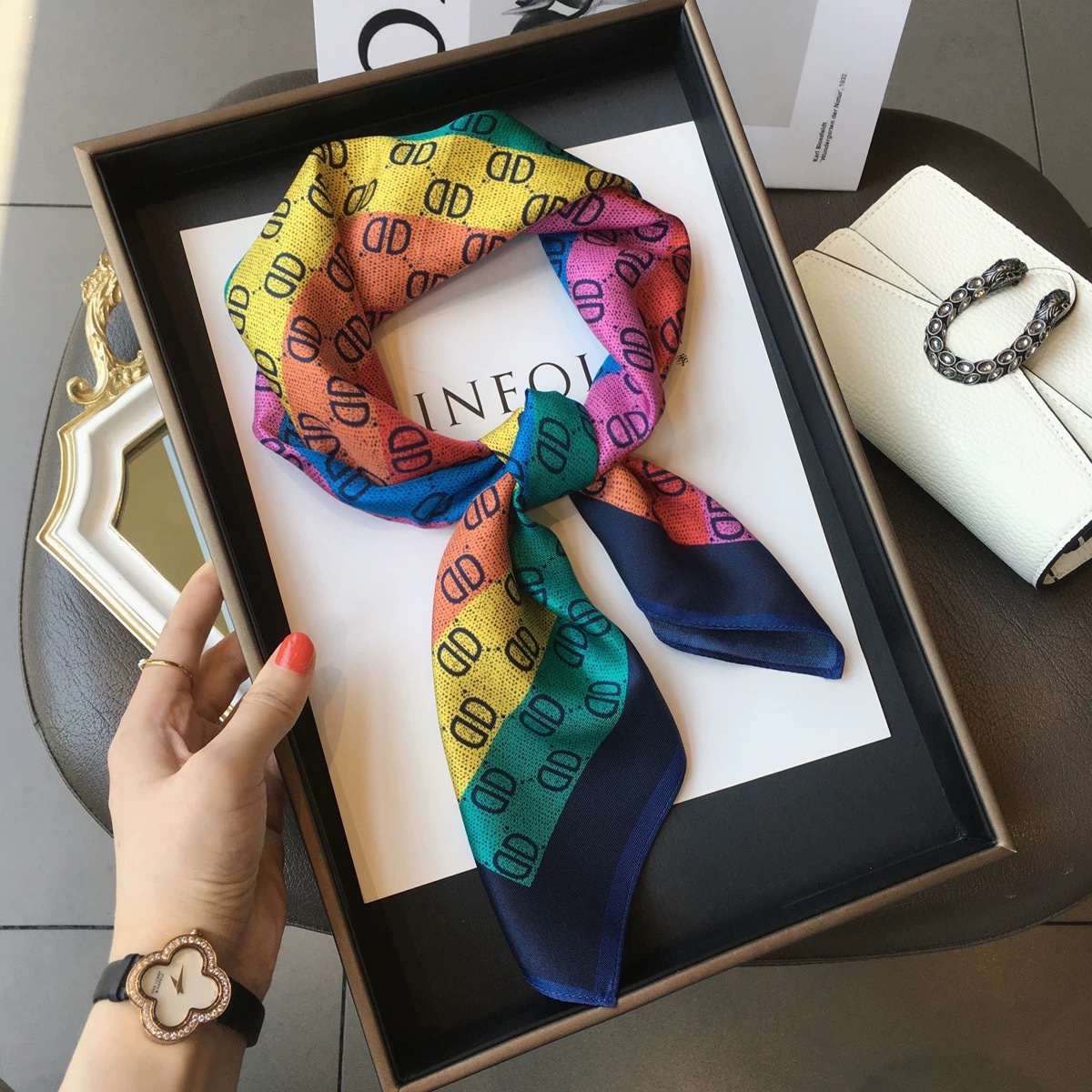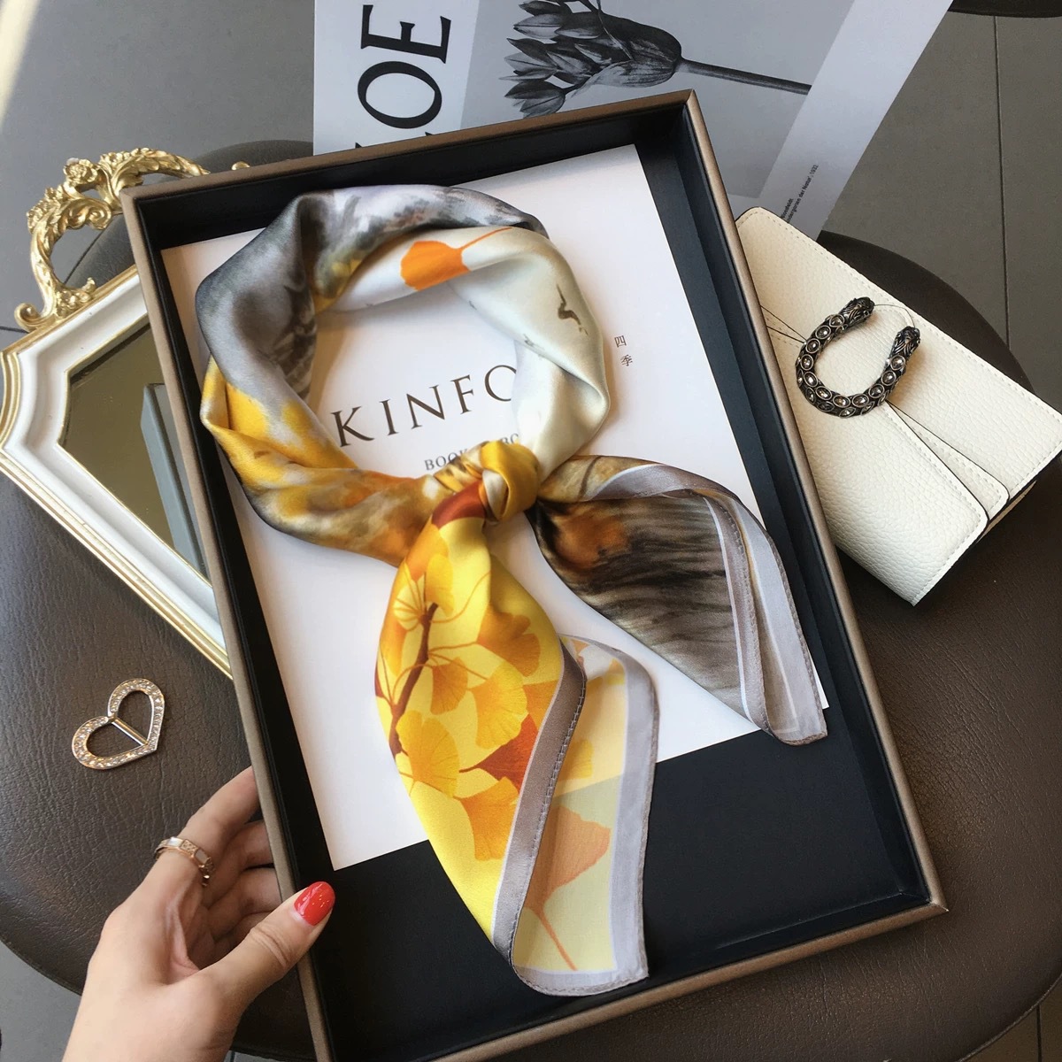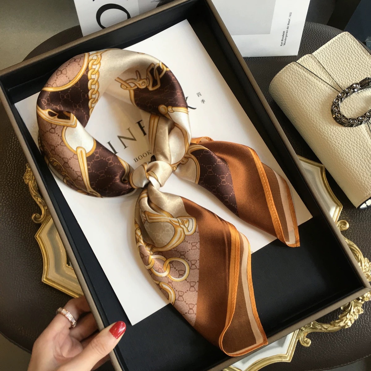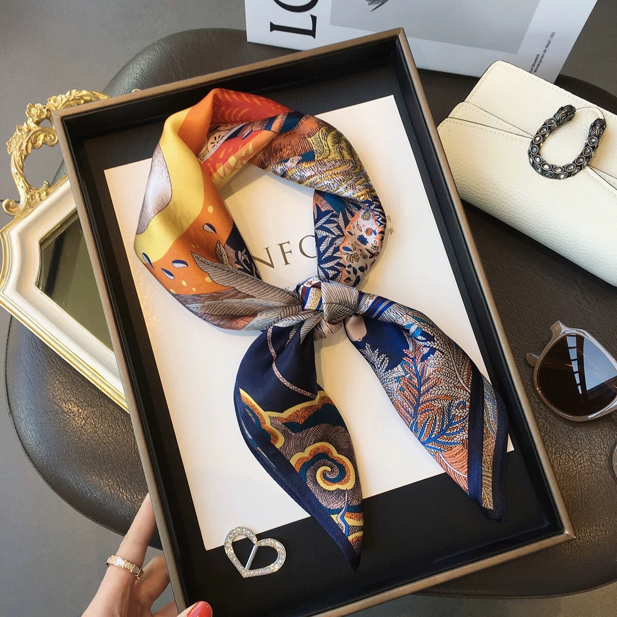 고급 작은 실크 스카프 한국 세련된 봄과 가을 장식 70 스퀘어 스카프 넥타이 헤어 넥타이 백 얇은 인쇄 스카프스토어 가기