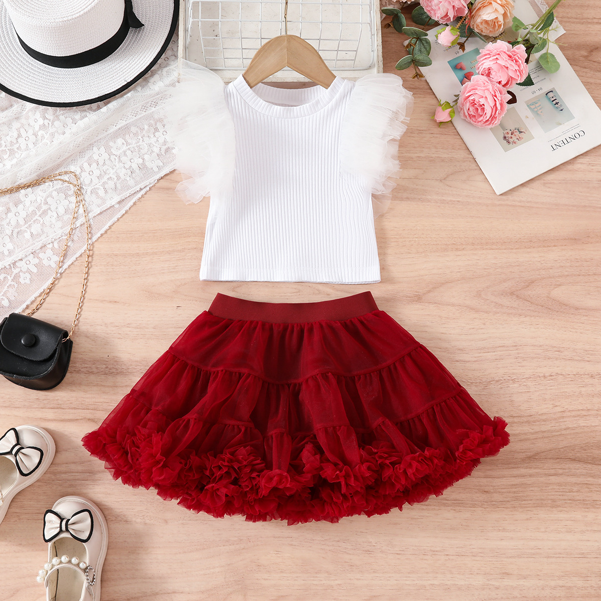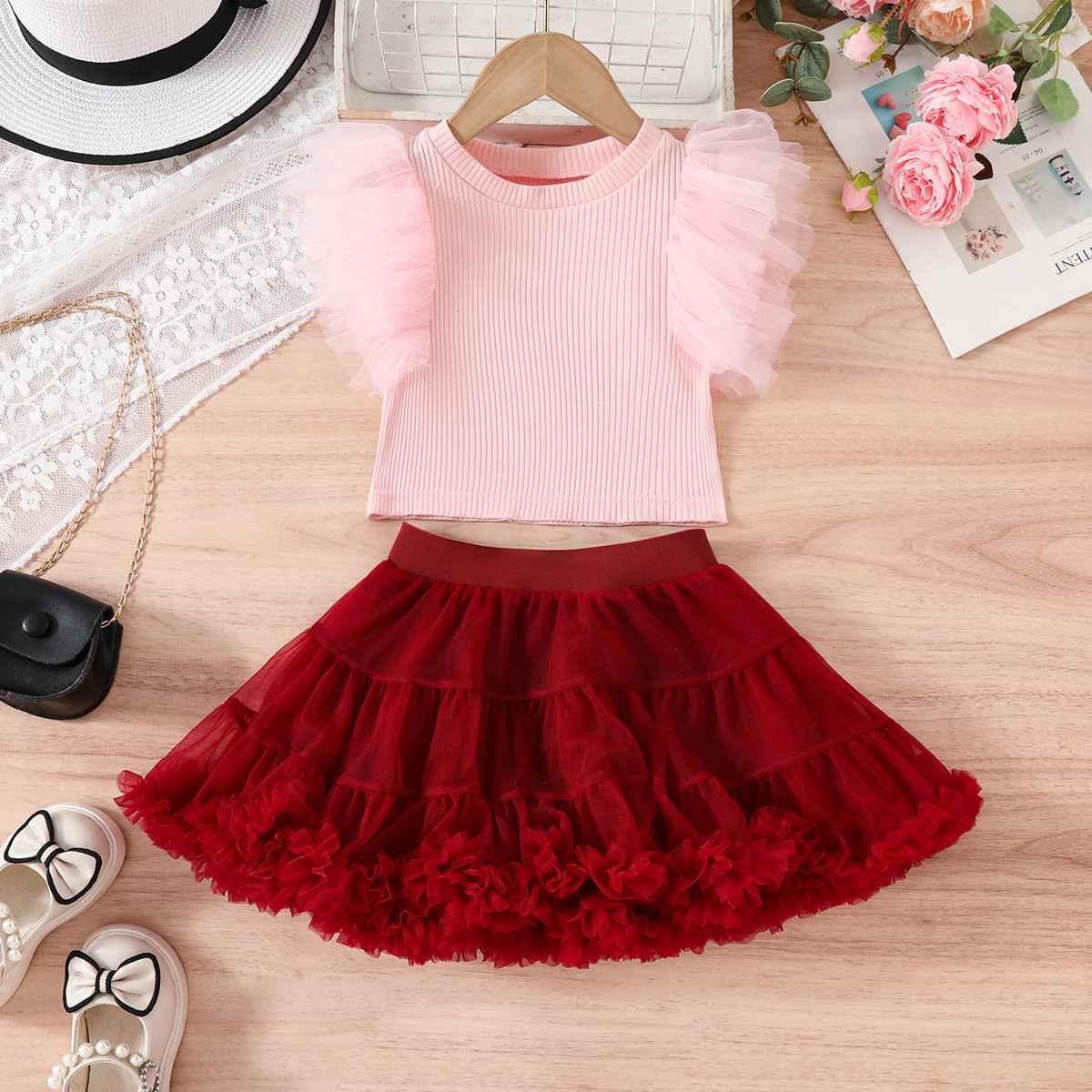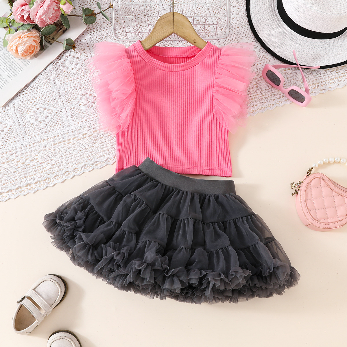 국경 간 새로운 투투 스커트 중소 소녀 생일 올 매치 공주 스커트 메쉬 비행 소매 티셔츠 TUTU 스커트 세트