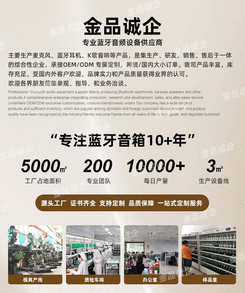 金品诚企,专注于蓝牙音箱和耳机领域,致力于为消费者带来丰富的音频体验。自成立以来,我们始终秉持“精品”理念,深入洞察市场趋势与用户需求,专注打磨每一款产品。