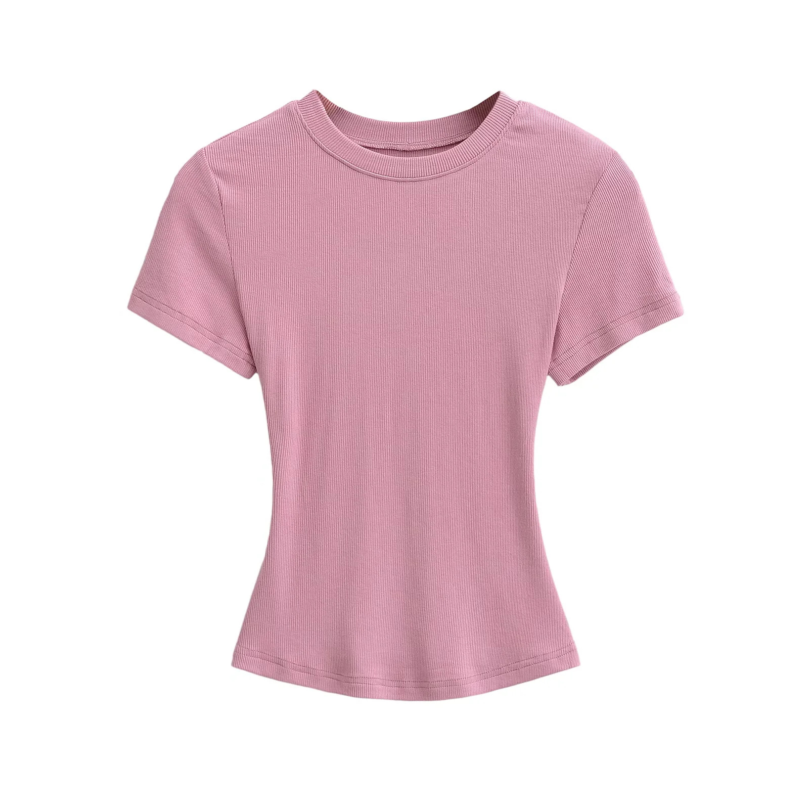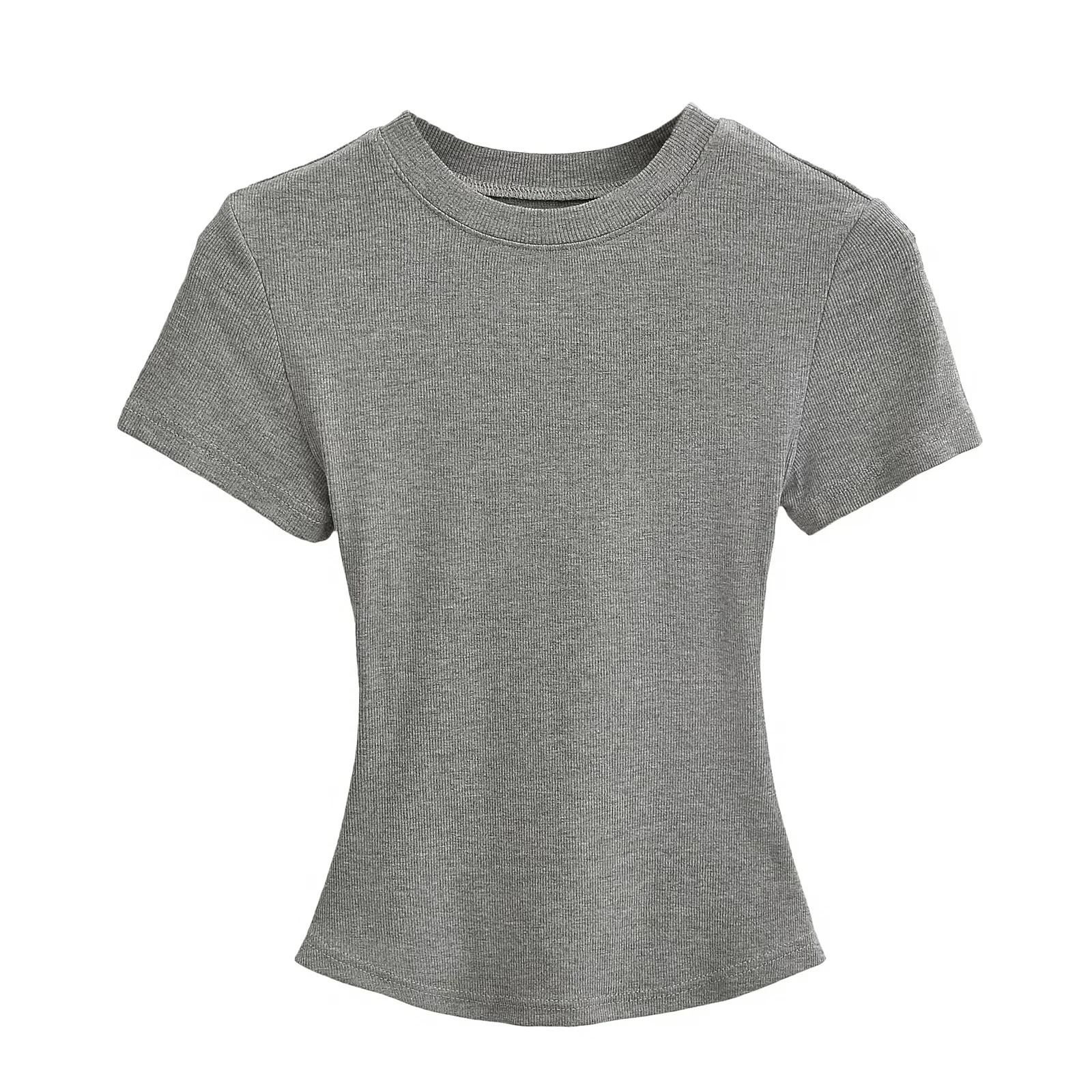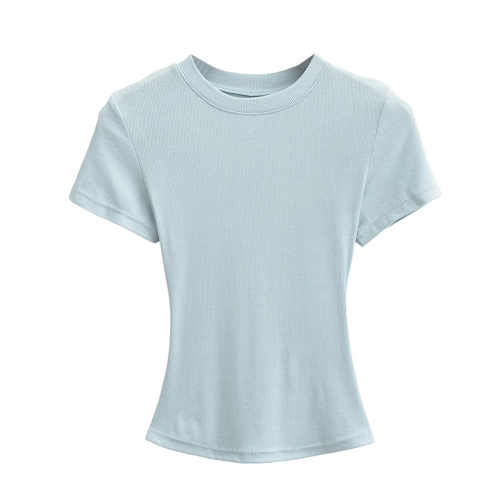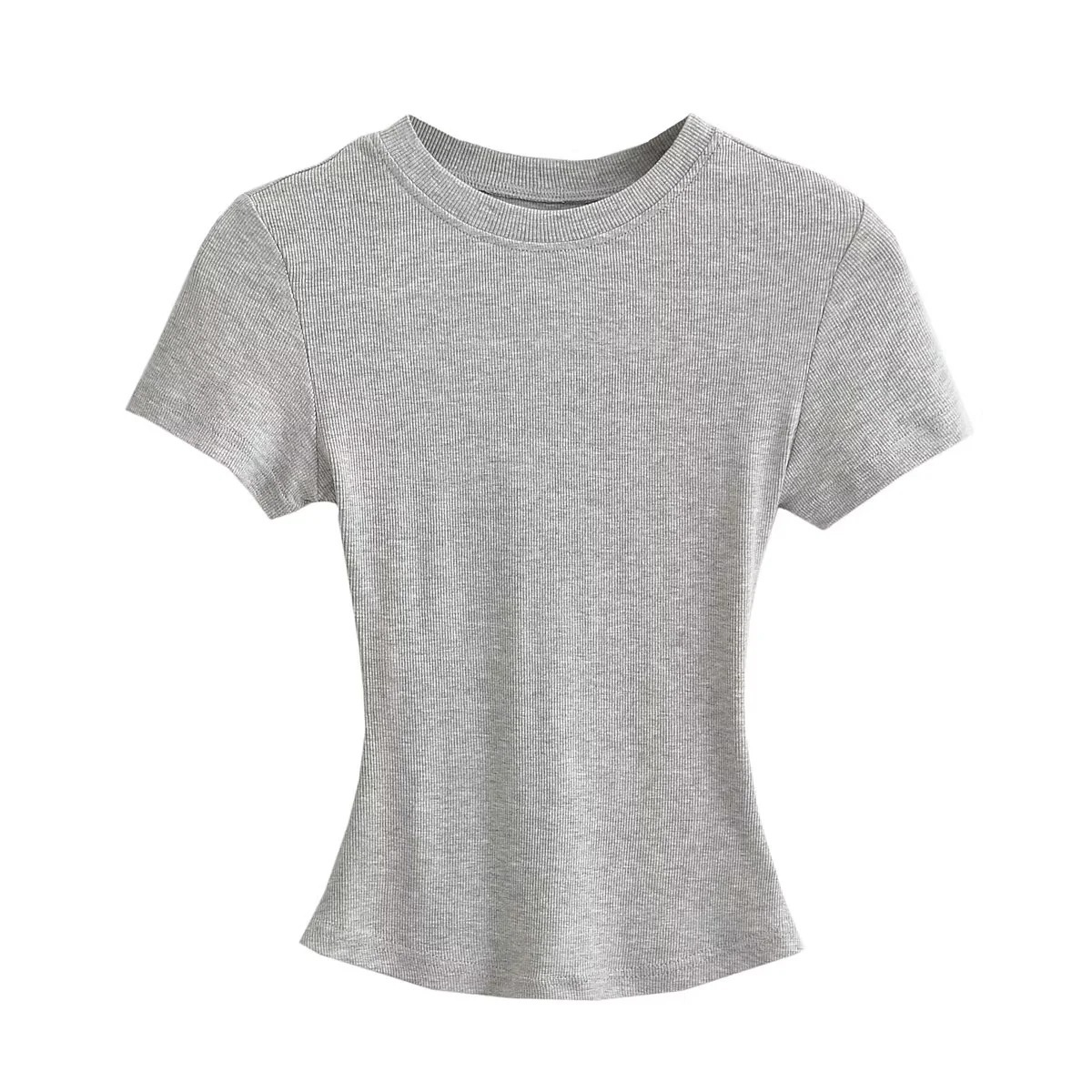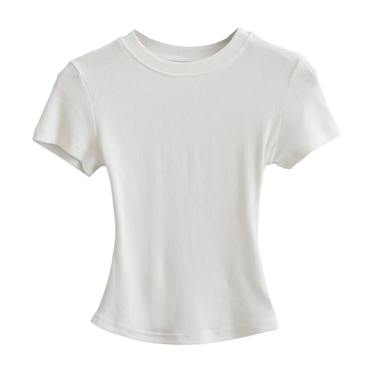 유럽과 미국의 카다시안 스타일 섹시 작은 둥근 목 반팔 티셔츠 여성의 2024 여름 스키 솔리드 컬러베이스 스레드 탑스토어 가기