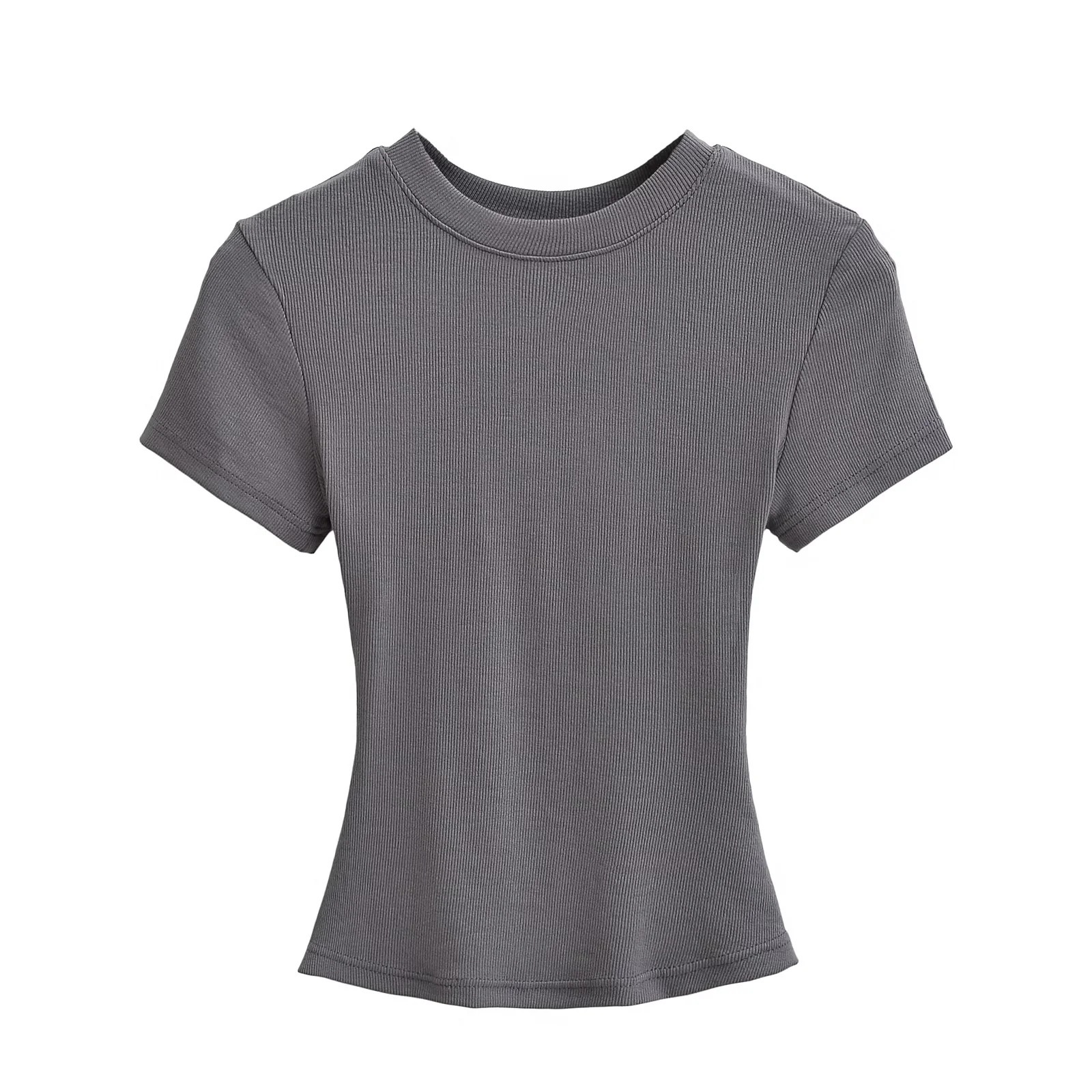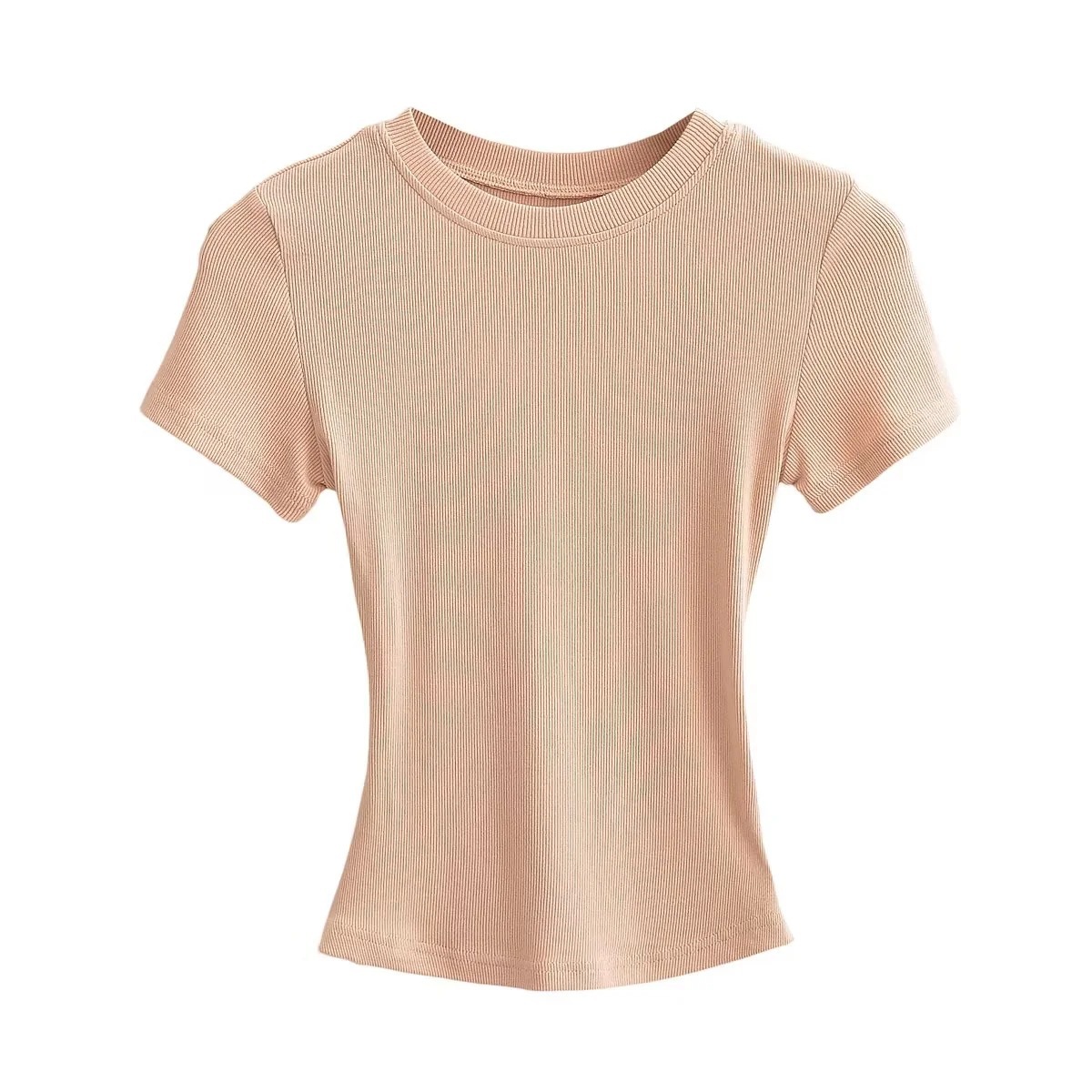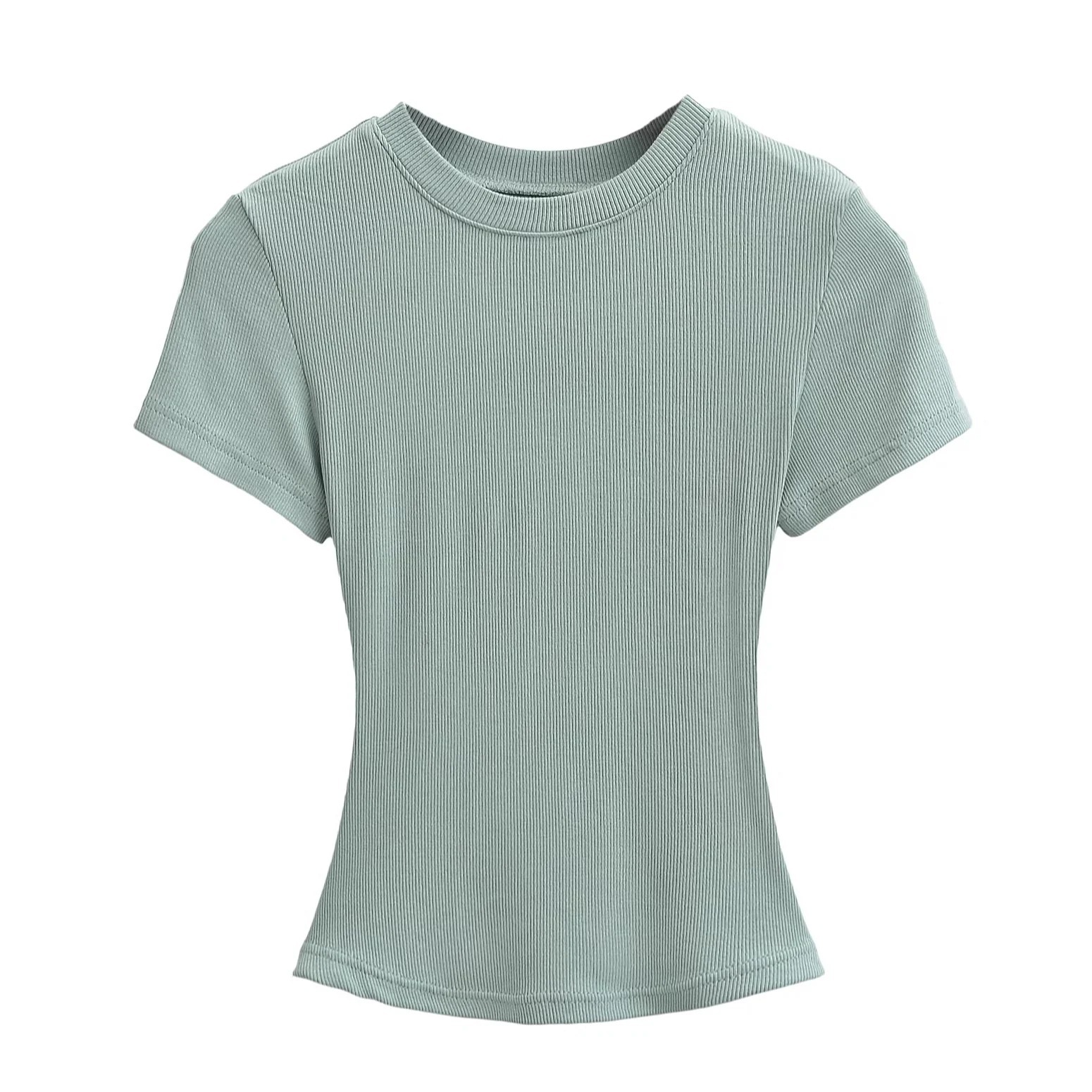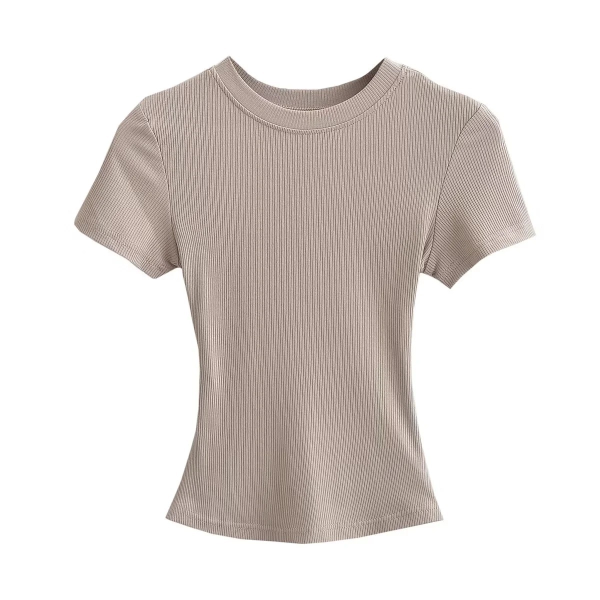 유럽과 미국의 카다시안 스타일 섹시 작은 둥근 목 반팔 티셔츠 여성의 2024 여름 스키 솔리드 컬러베이스 스레드 탑스토어 가기
