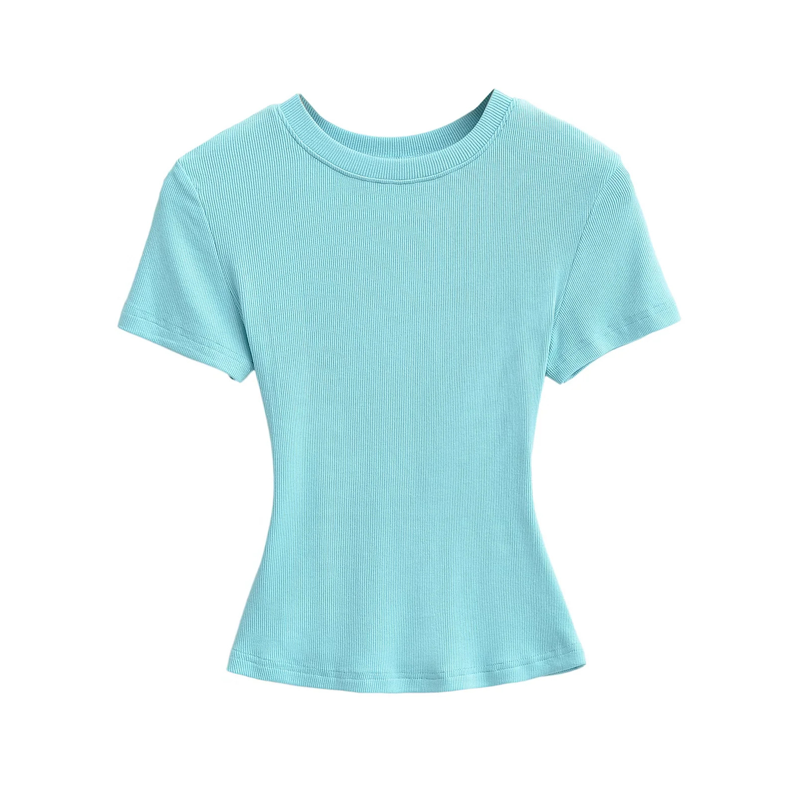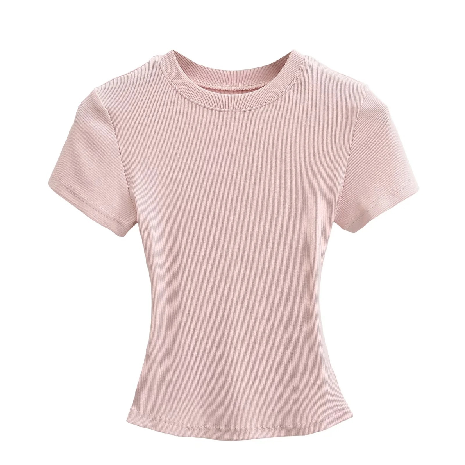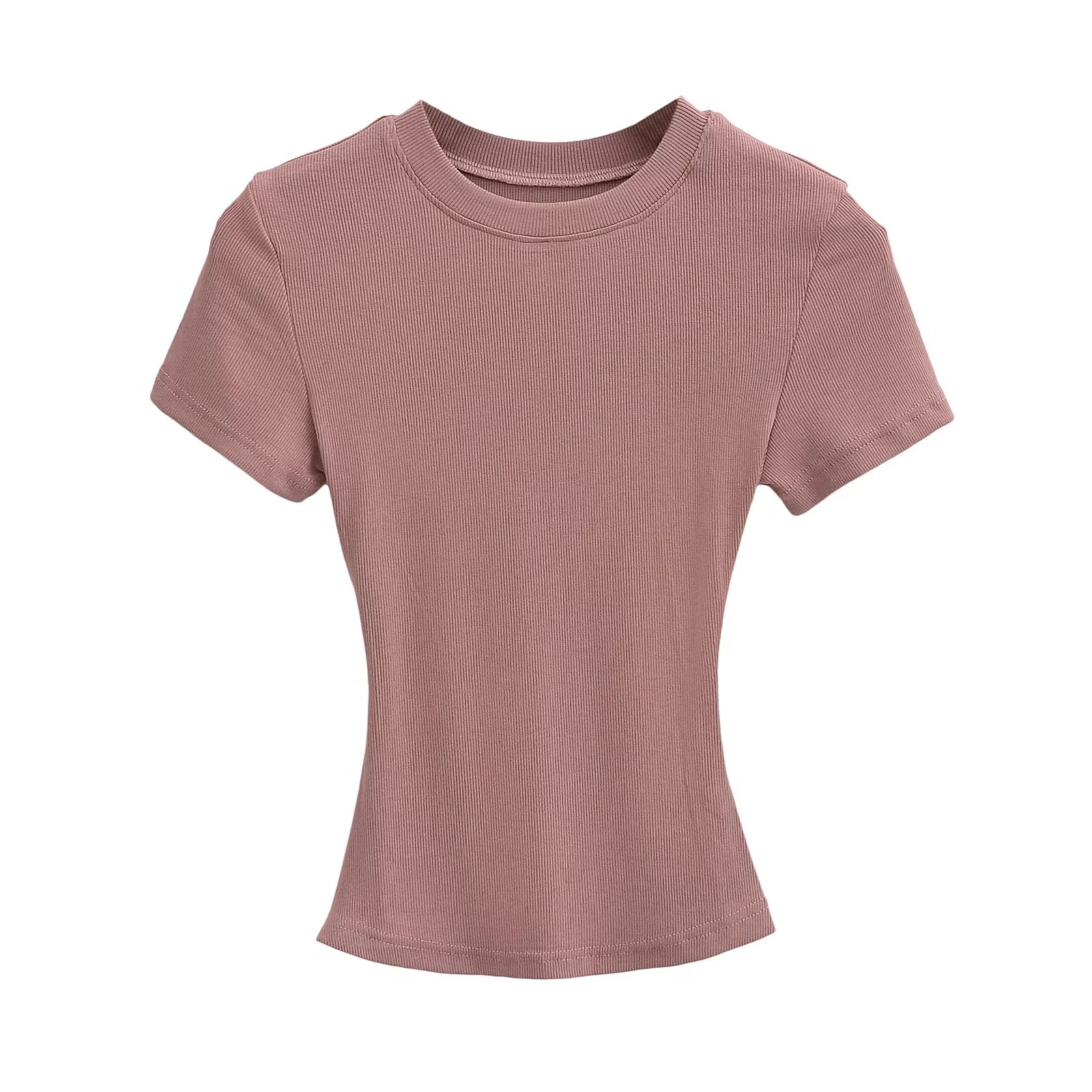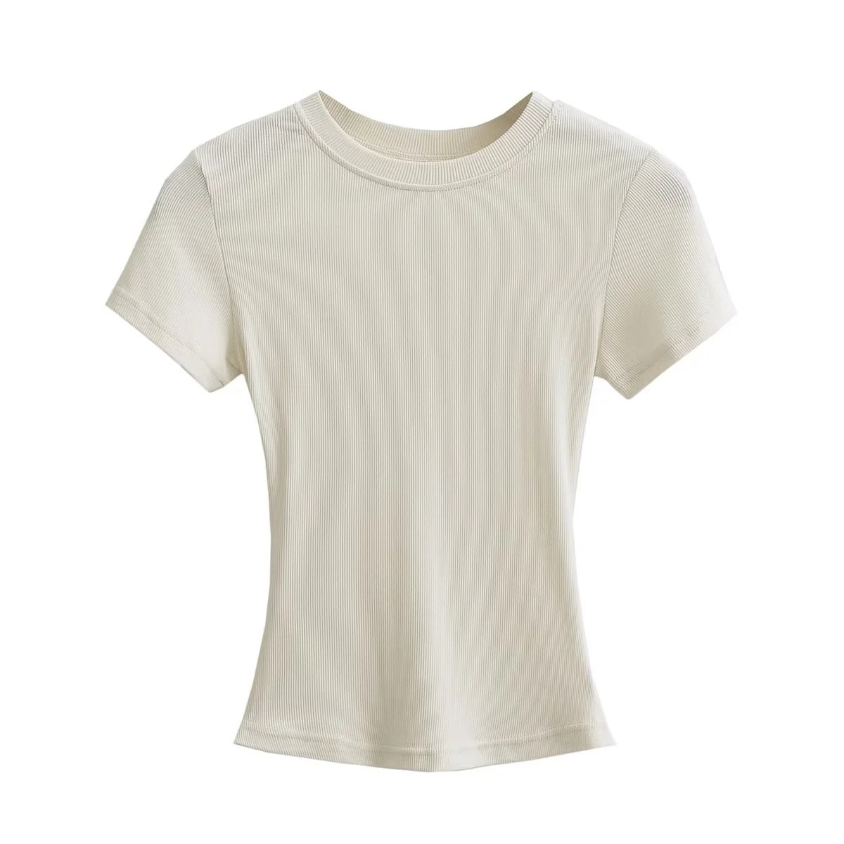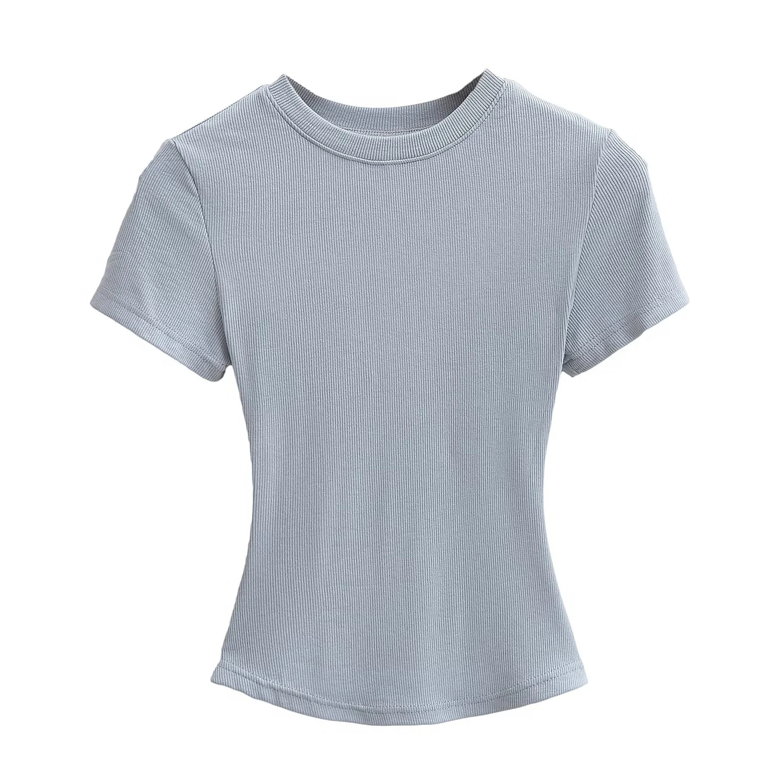 유럽과 미국의 카다시안 스타일 섹시 작은 둥근 목 반팔 티셔츠 여성의 2024 여름 스키 솔리드 컬러베이스 스레드 탑스토어 가기
