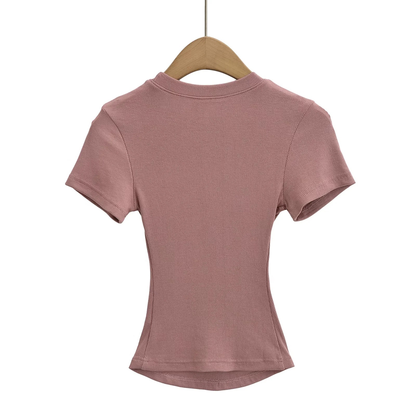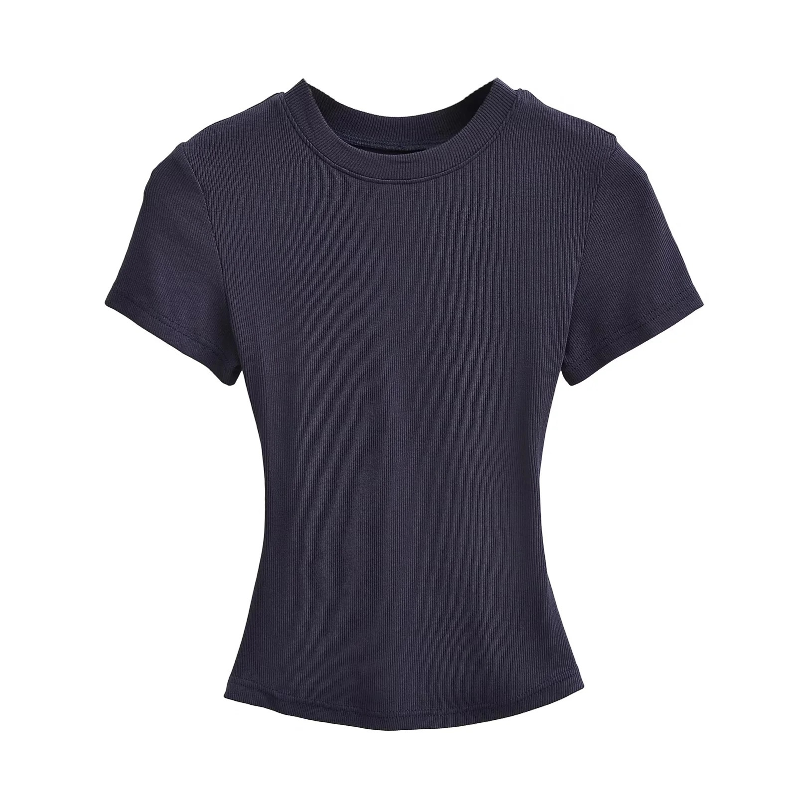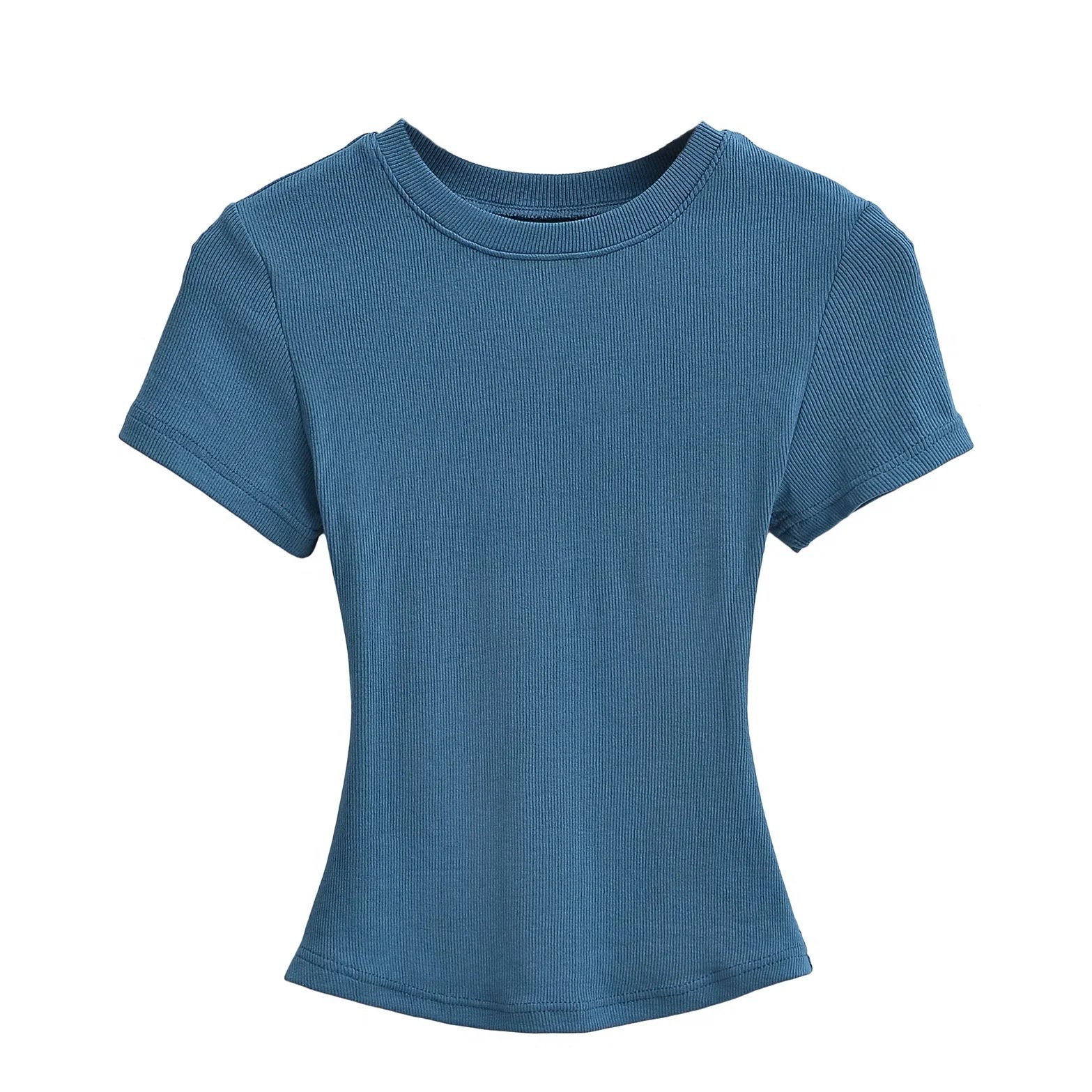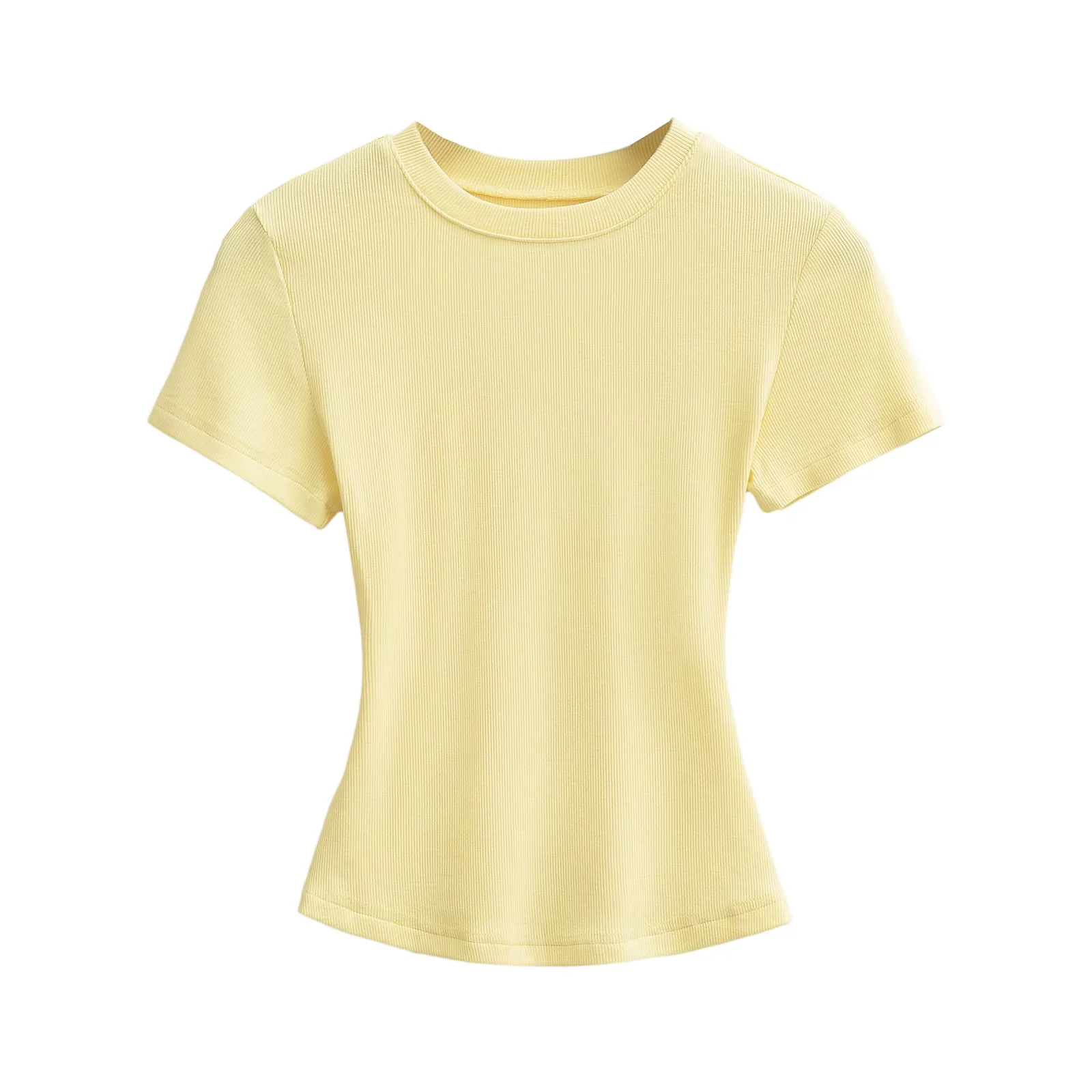 유럽과 미국의 카다시안 스타일 섹시 작은 둥근 목 반팔 티셔츠 여성의 2024 여름 스키 솔리드 컬러베이스 스레드 탑스토어 가기