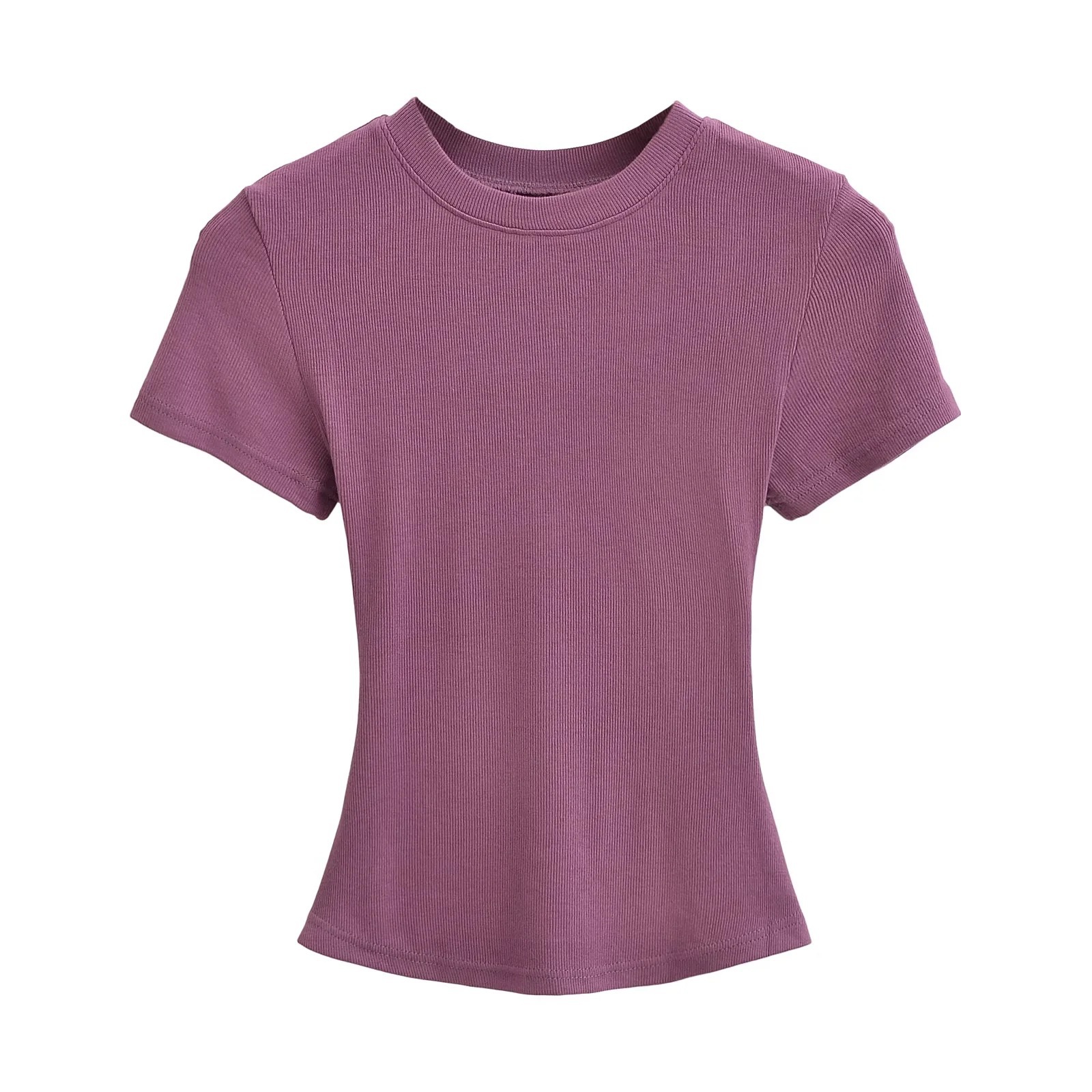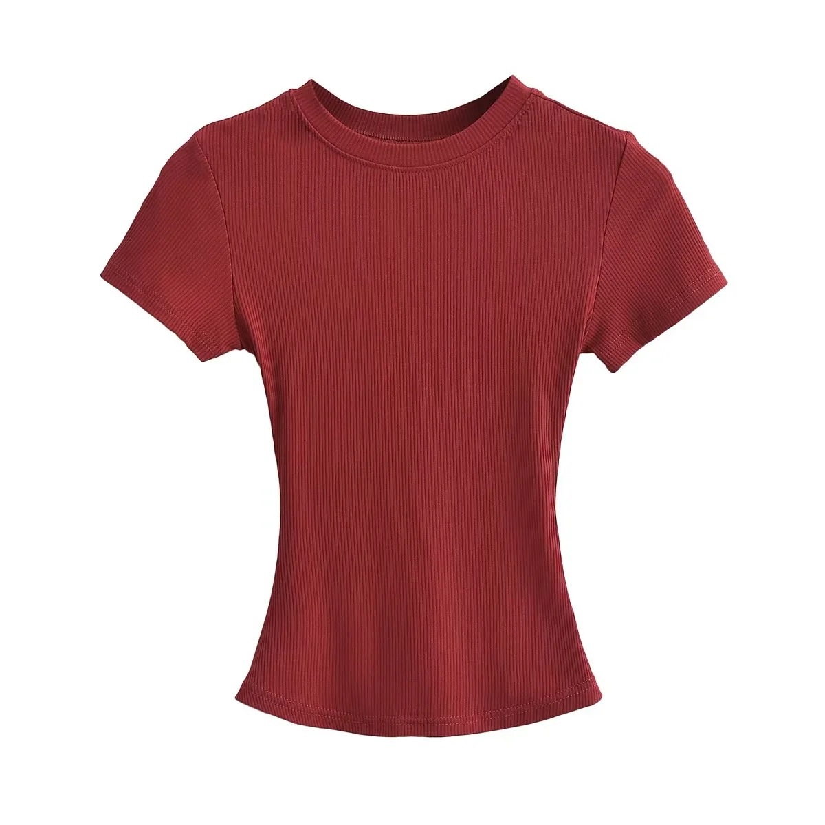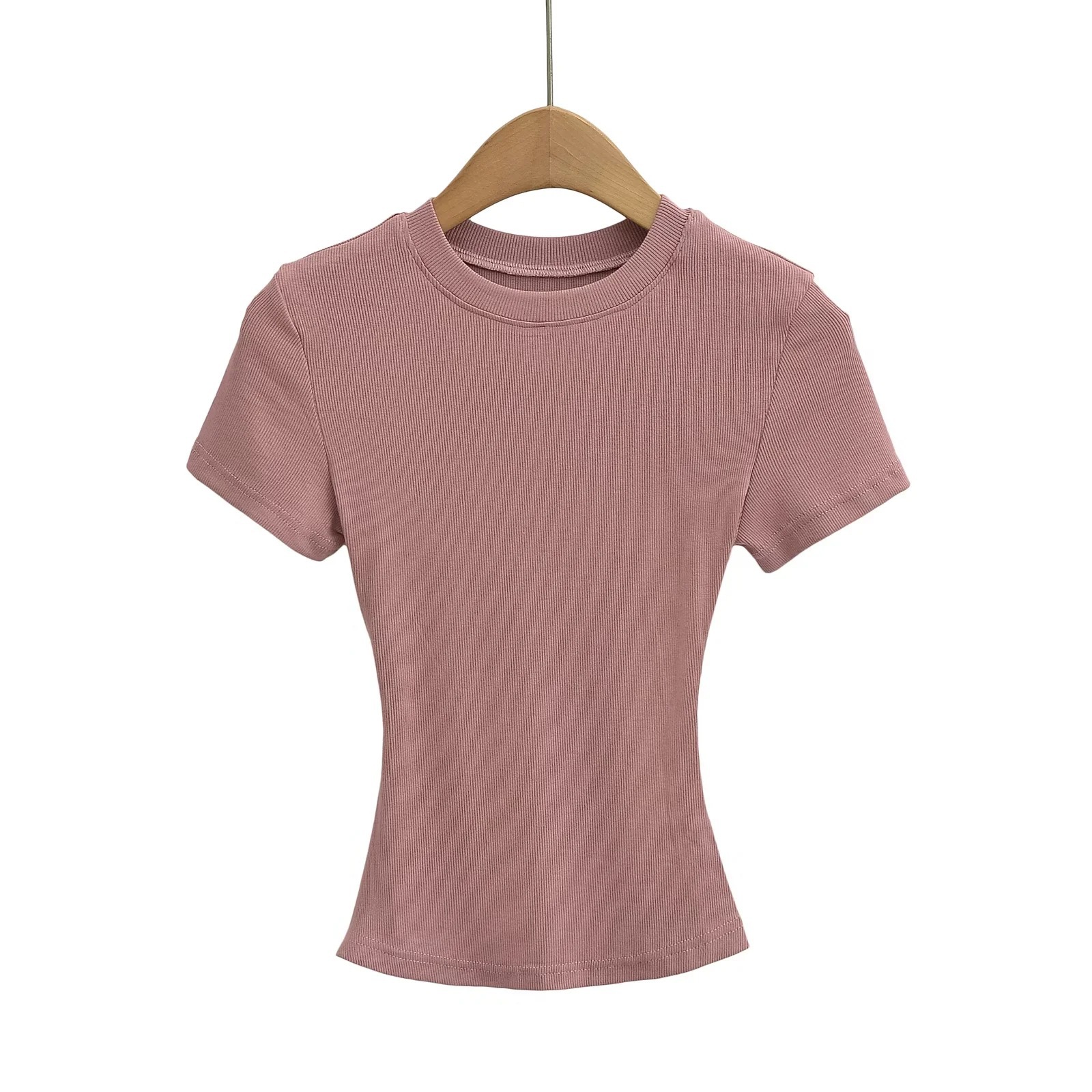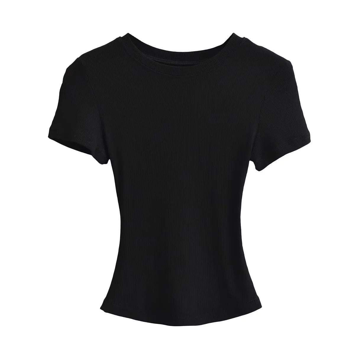 유럽과 미국의 카다시안 스타일 섹시 작은 둥근 목 반팔 티셔츠 여성의 2024 여름 스키 솔리드 컬러베이스 스레드 탑스토어 가기