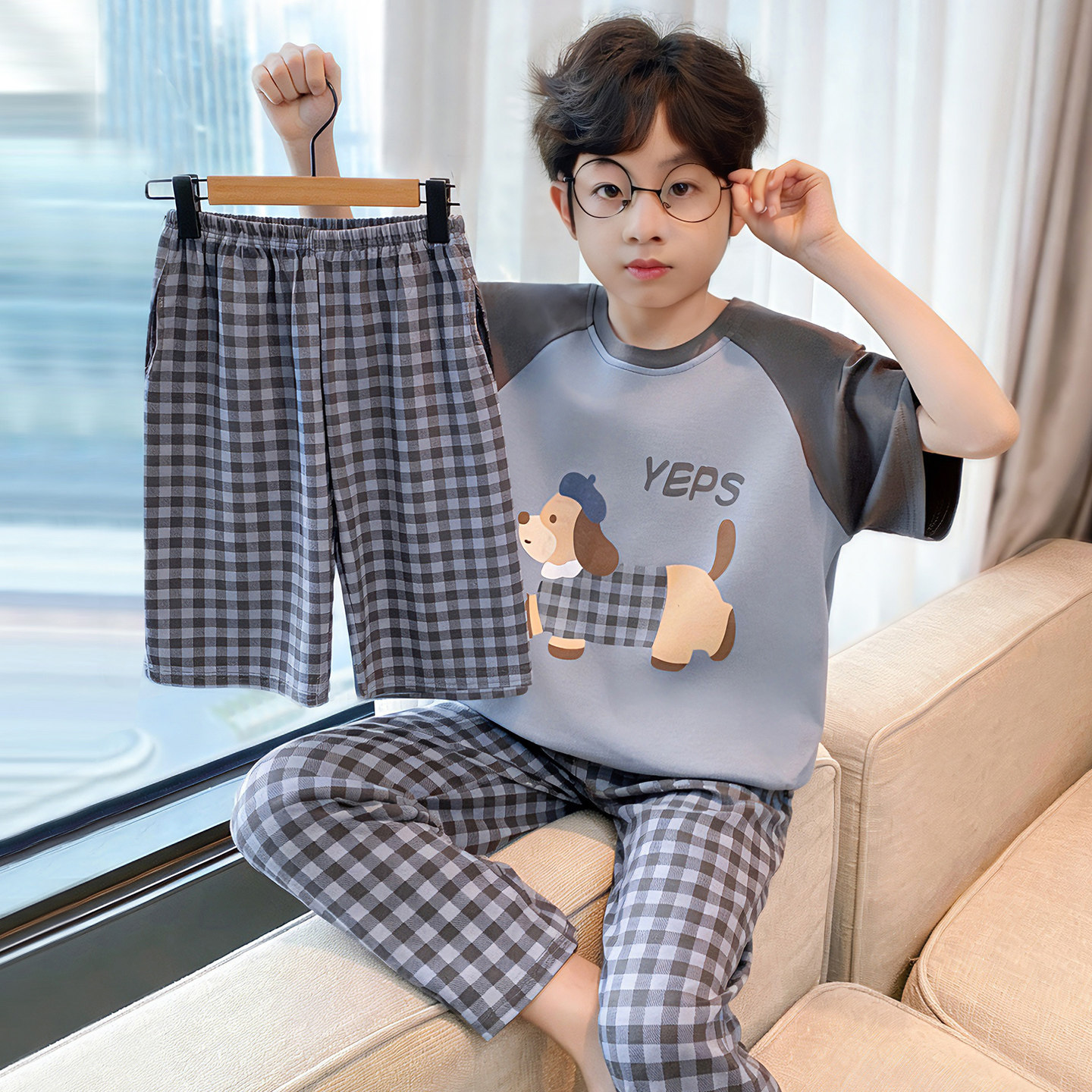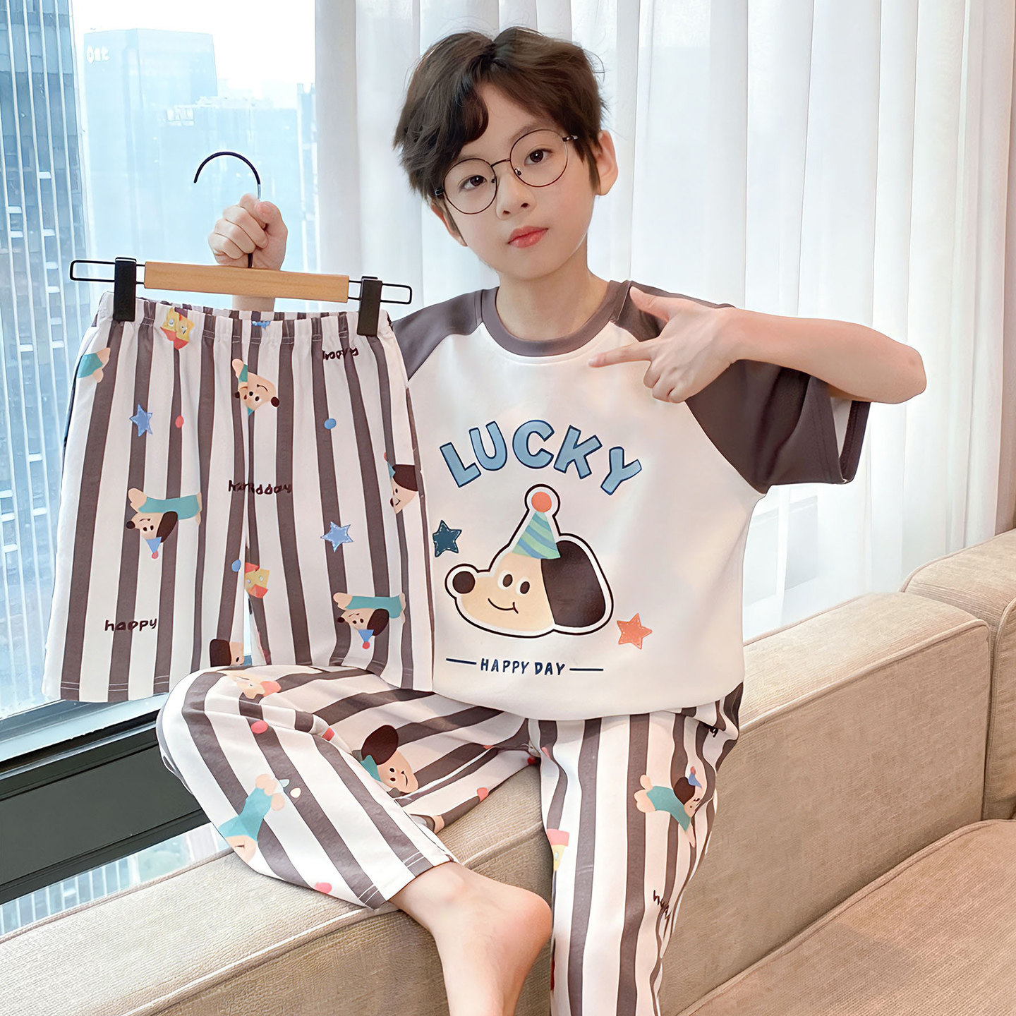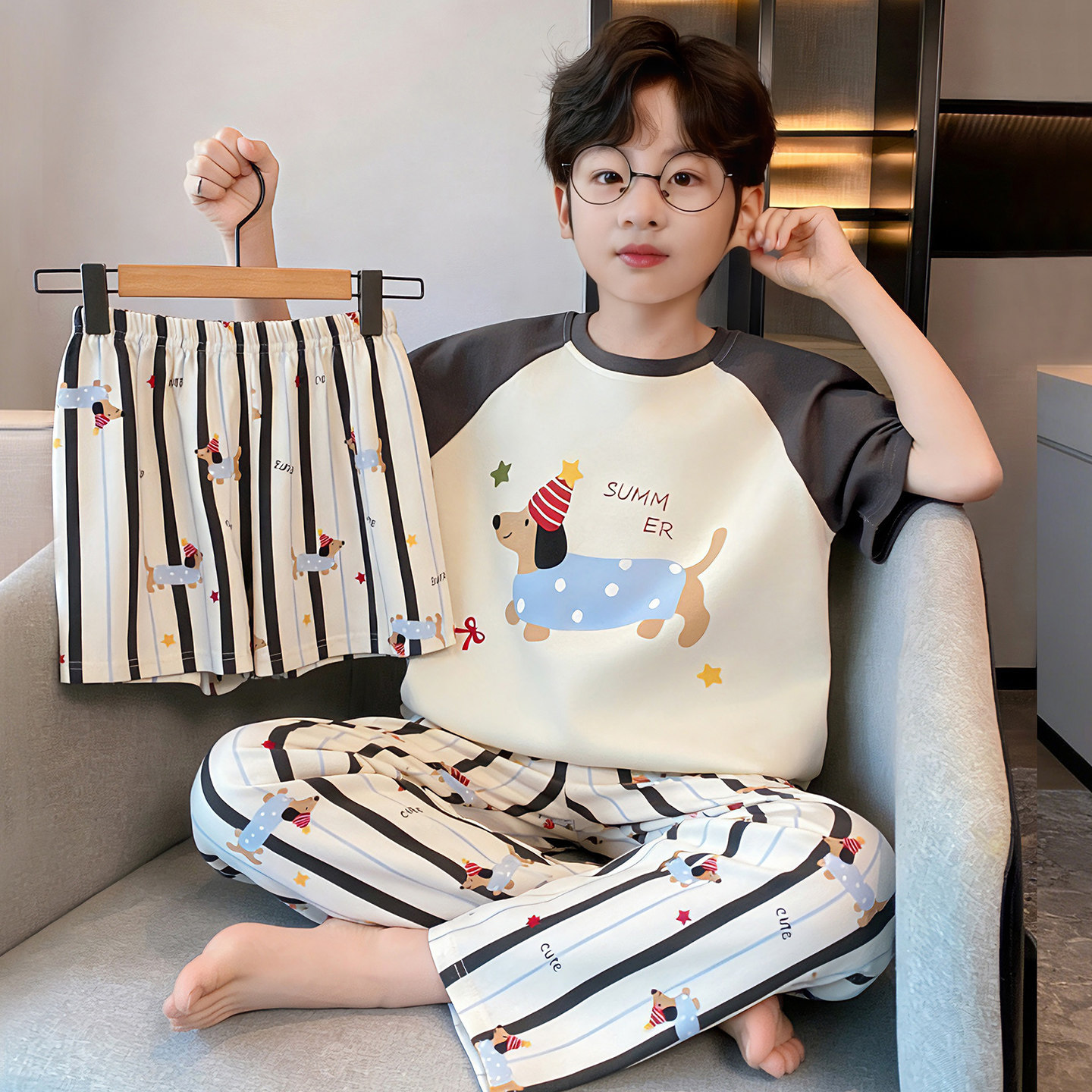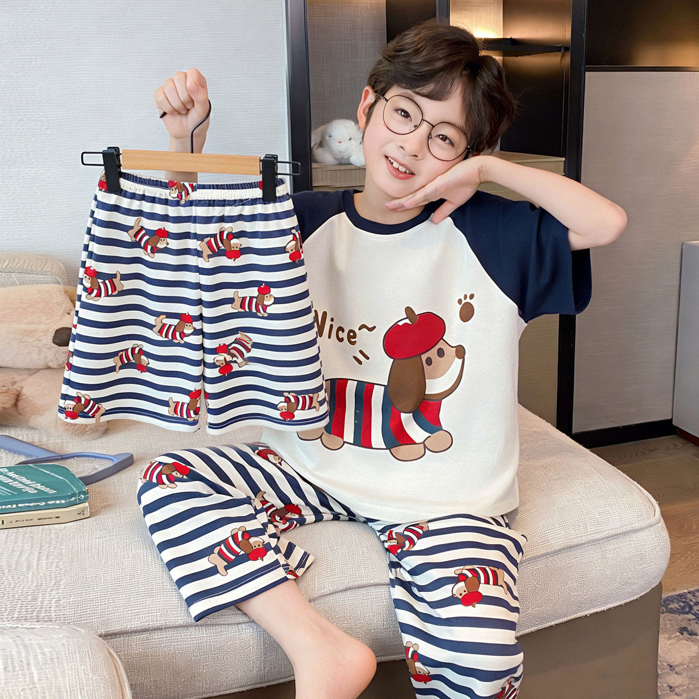 3 피스 코튼 어린이 잠옷 소년의 여름 얇은 반팔 바지 소년의 에어컨 옷 세트 7
