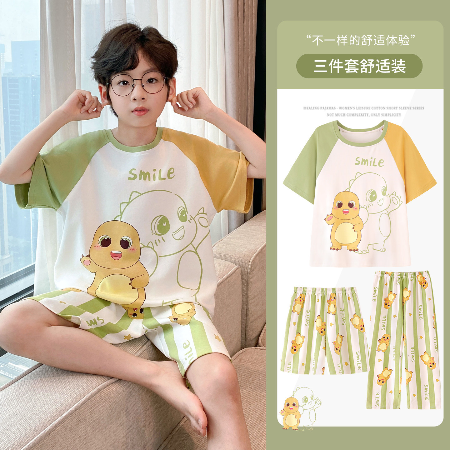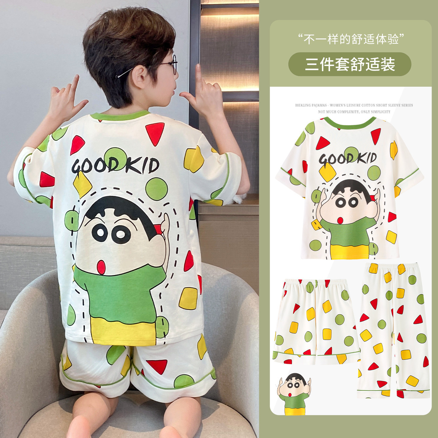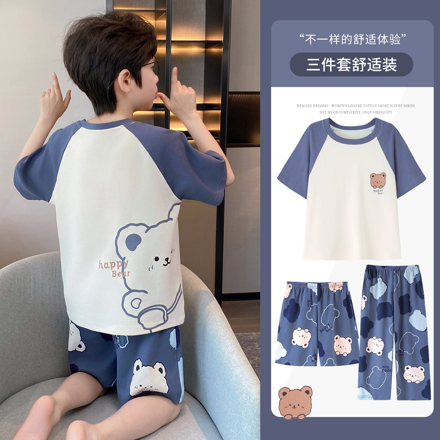 3 피스 코튼 어린이 잠옷 소년의 여름 얇은 반팔 바지 소년의 에어컨 옷 세트 7스토어 가기