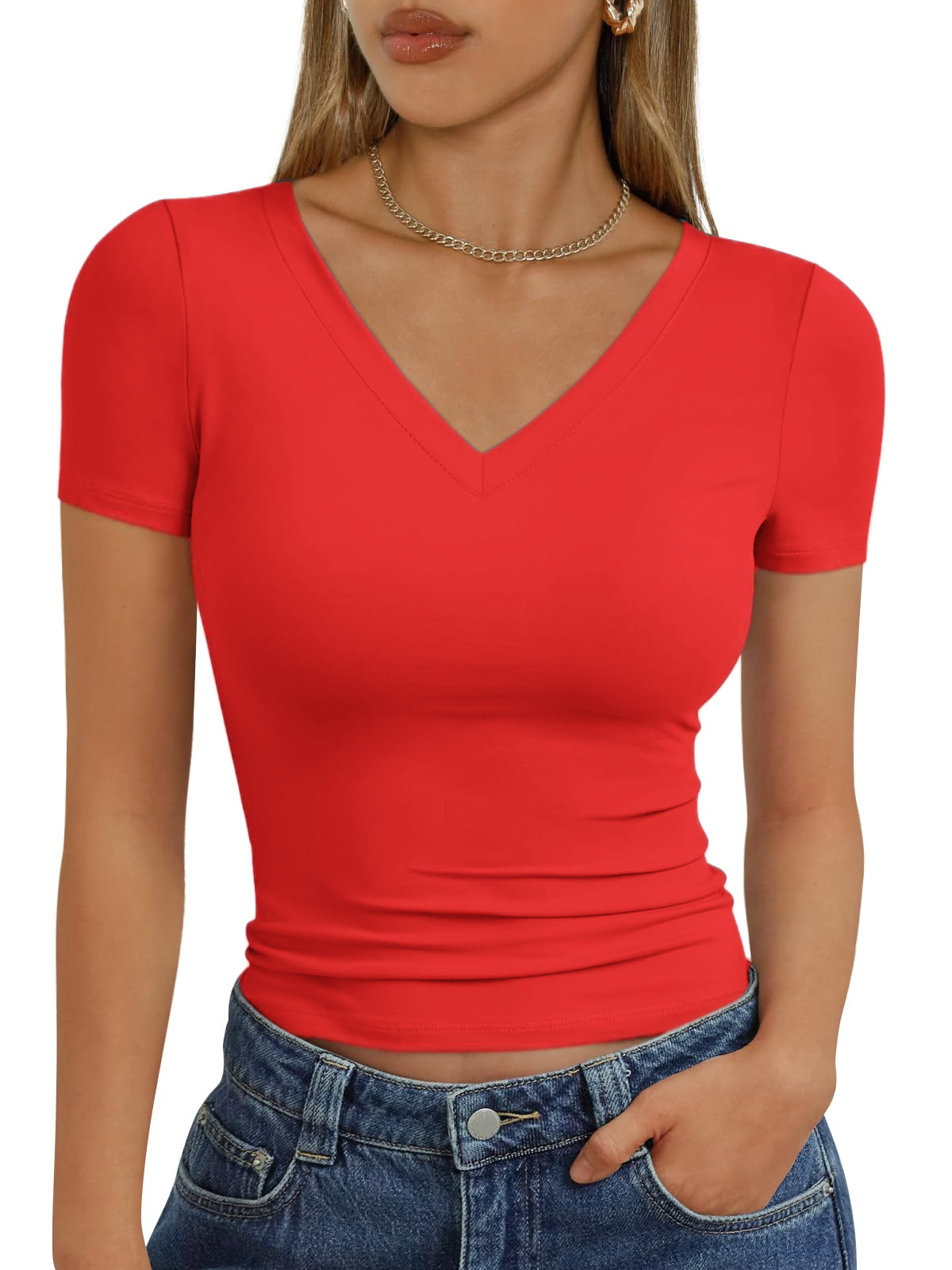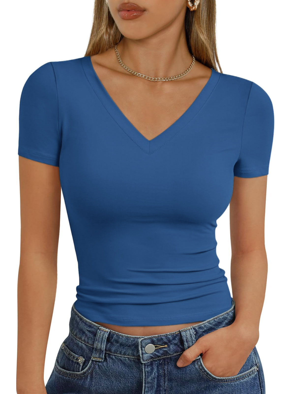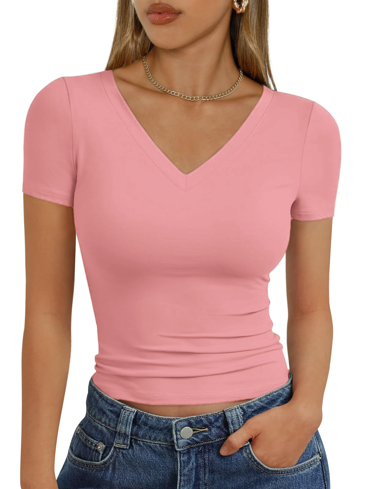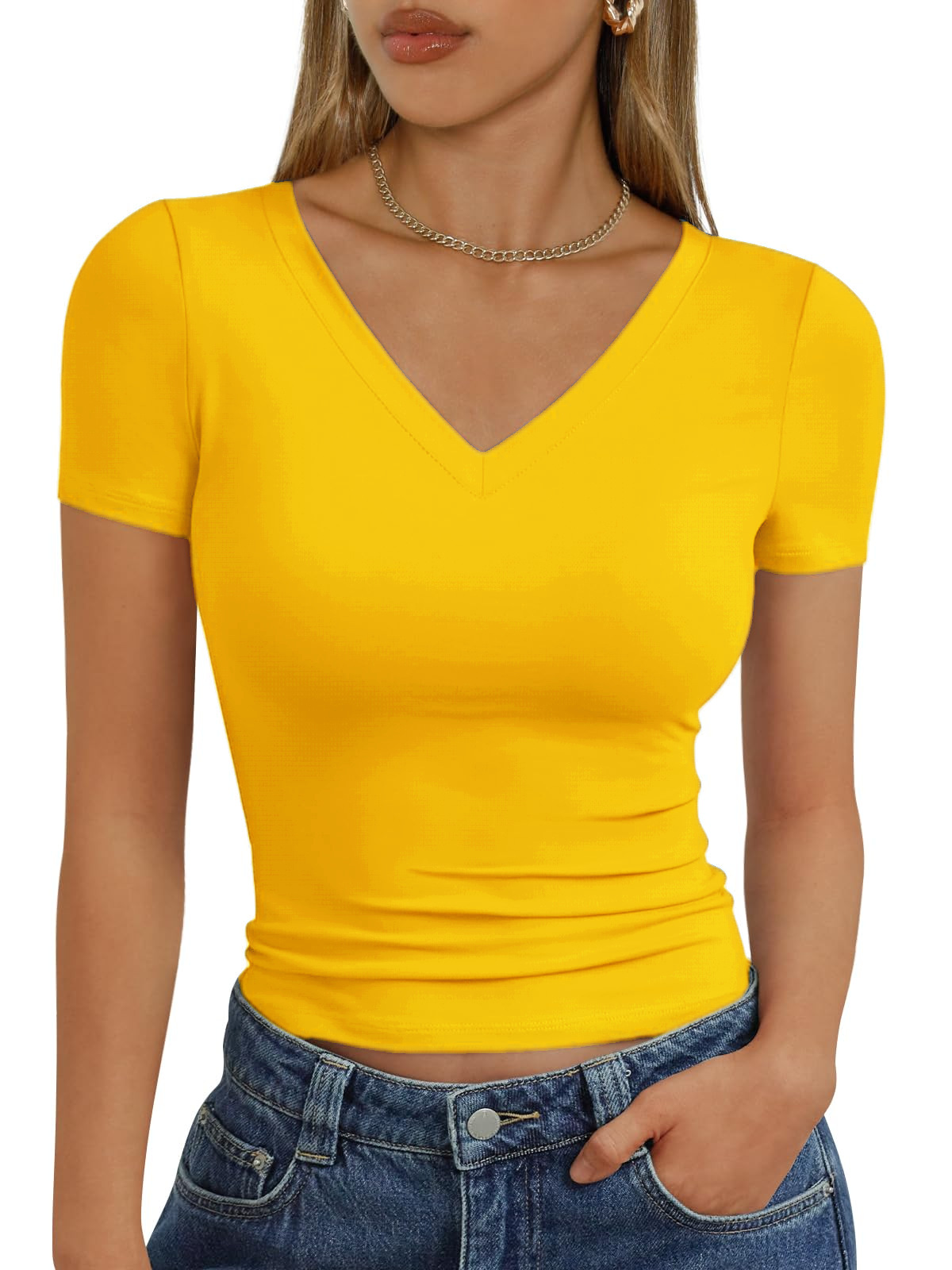 패션 퀸 여성 베이직 V 넥 반팔 티셔츠 슬림 핏 배꼽 노출 Y2k 티셔츠 2025 여름스토어 가기
