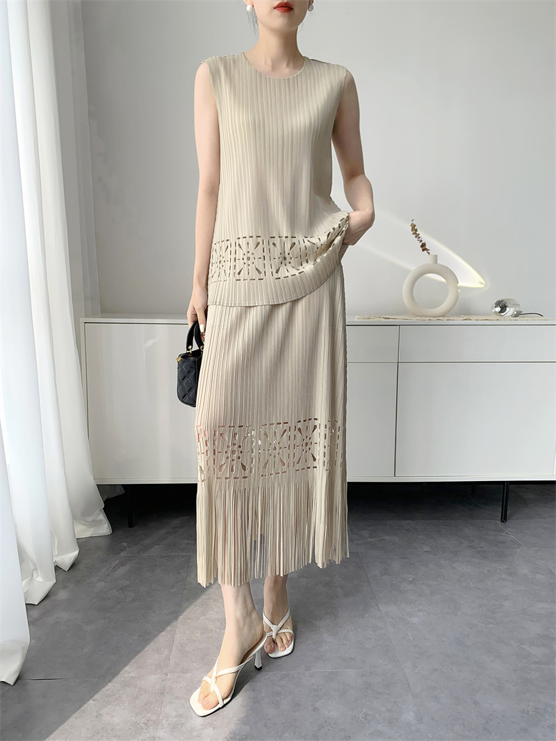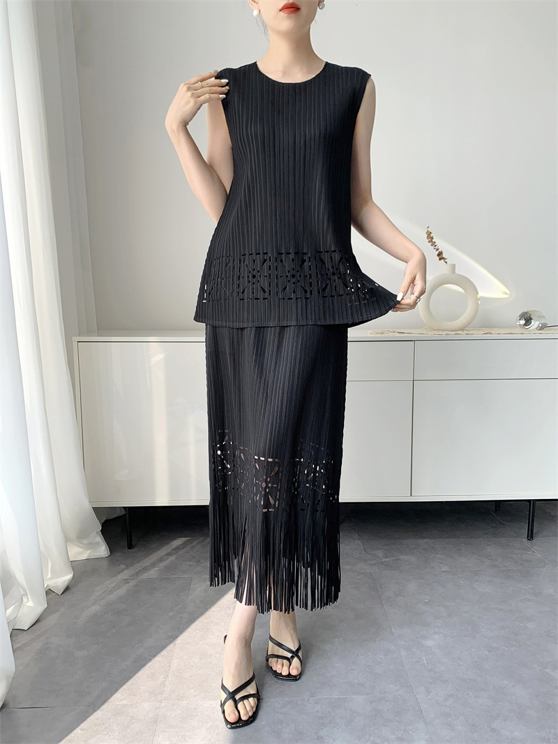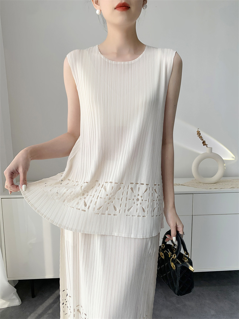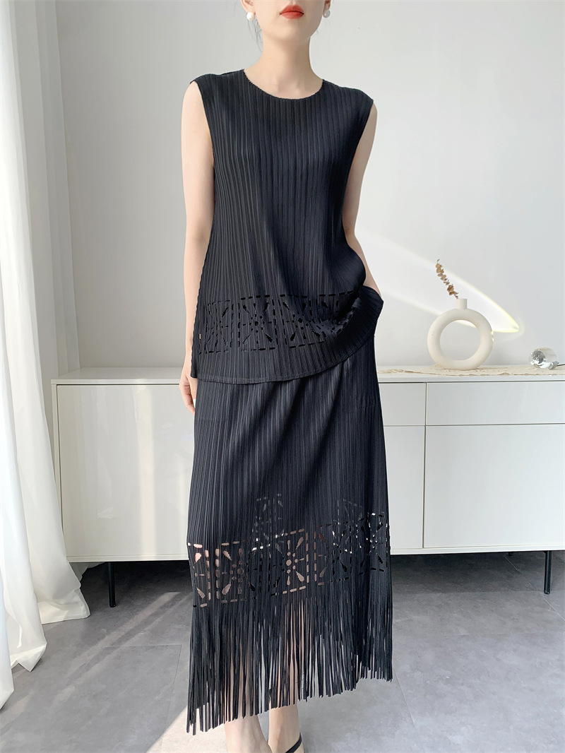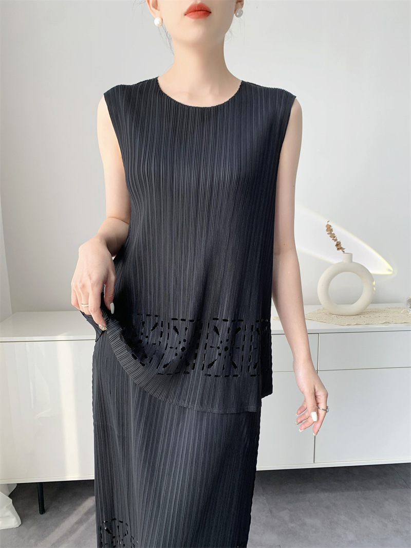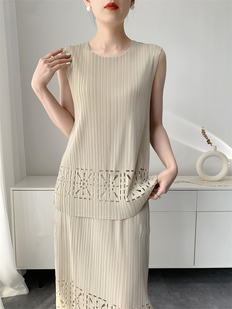 미야케 스타일의 고급 주름 술은 여성의 2025 년 여름 정상 오버 스커트 기질 연령을 세트 편안한 여가를 줄입니다.