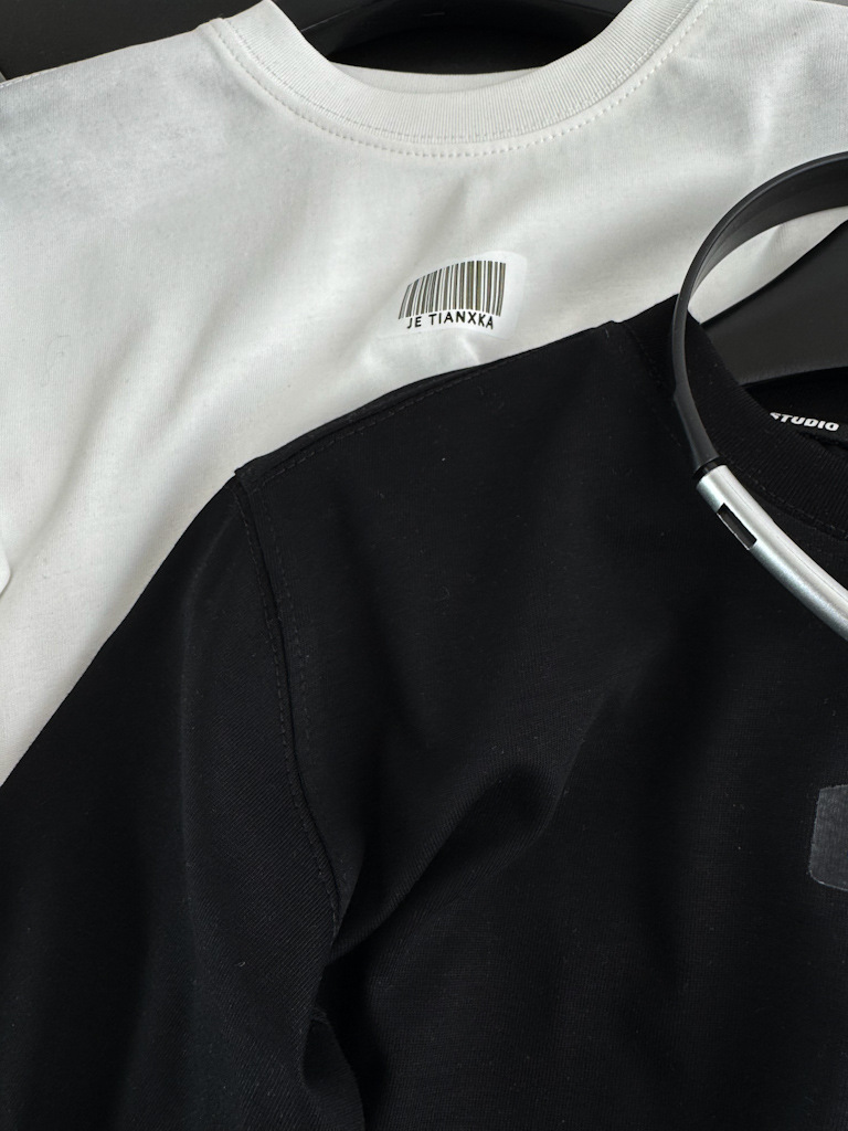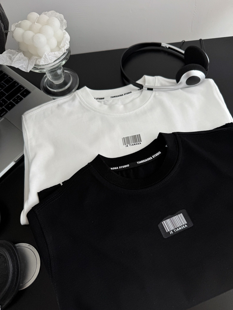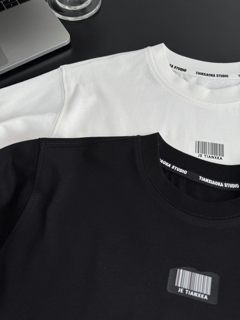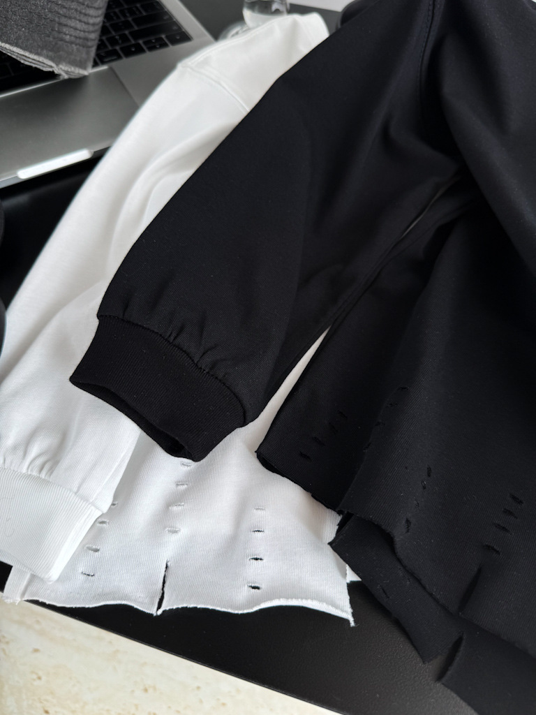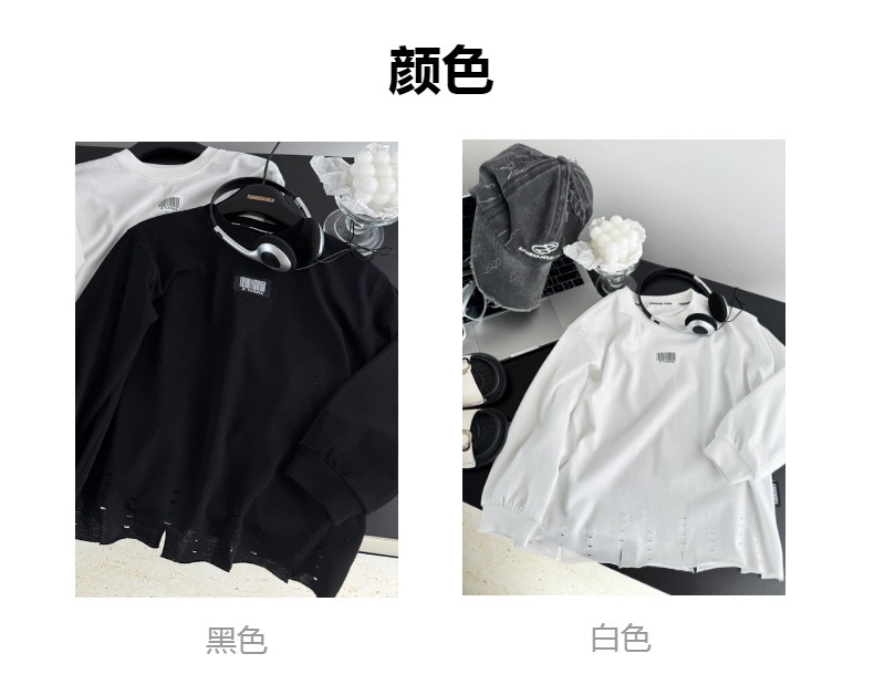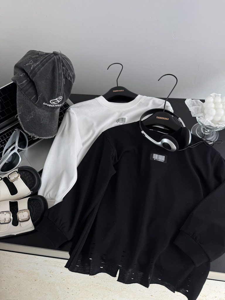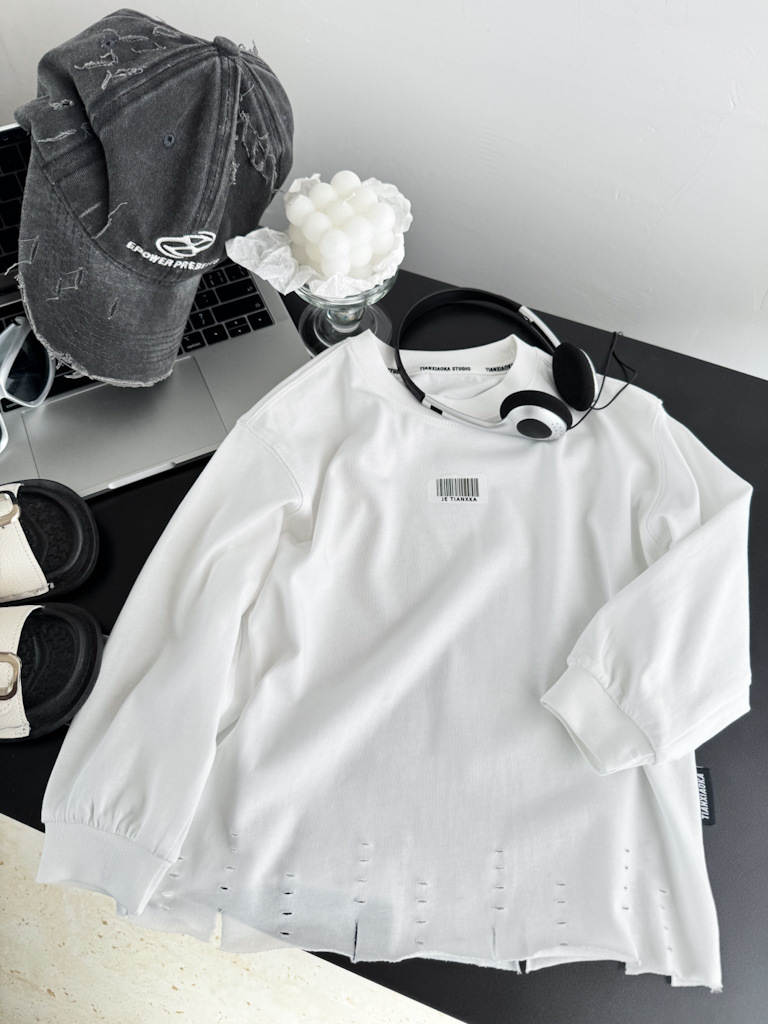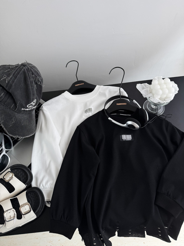 한국 아동복 거친 가장자리 디자인 센스 2025 봄 새로운 라운드 넥 흑백 티셔츠 니트 코튼 어린이 긴 소매스토어 가기