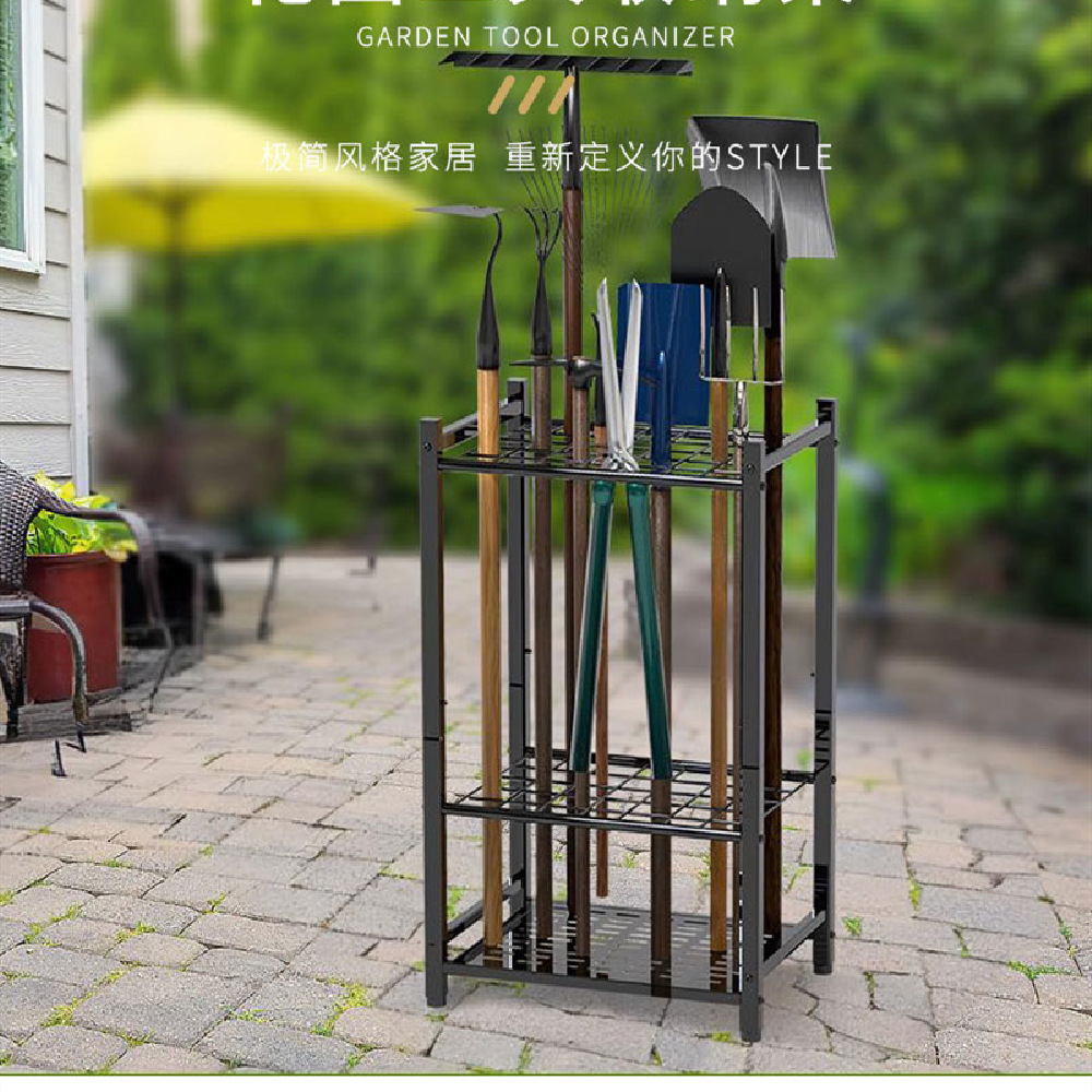 국경 간 안뜰 청소 기기 저장 랙 3 층 철 조정 가능한 발 매트 정원 도구 저장 랙 스토리지 랙