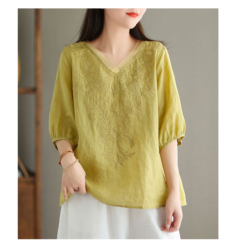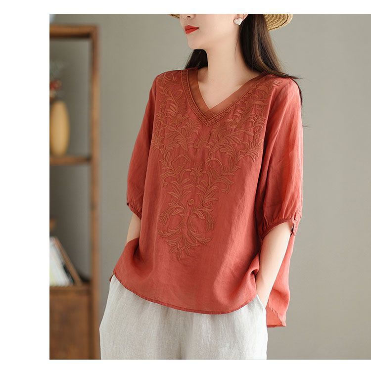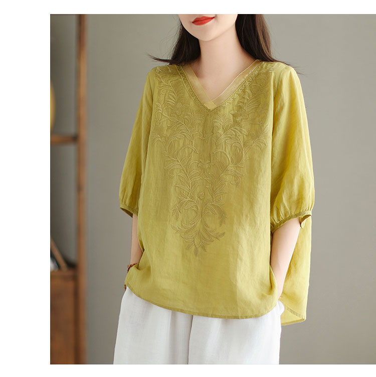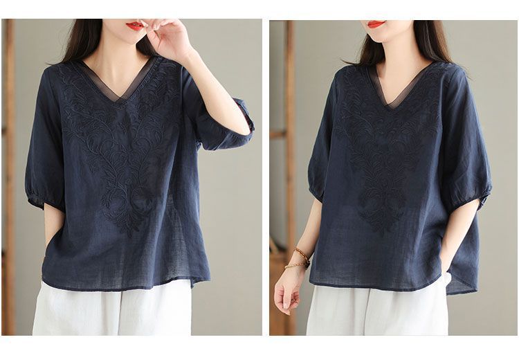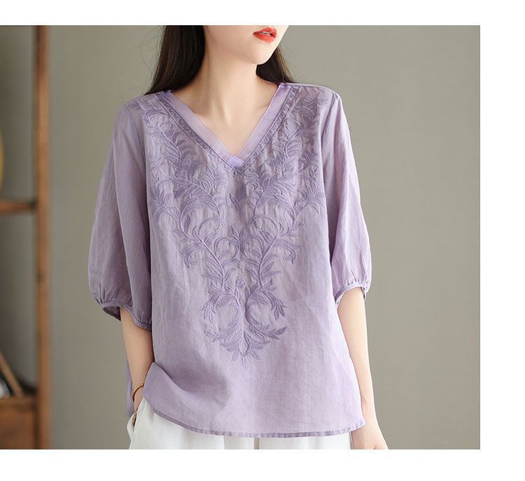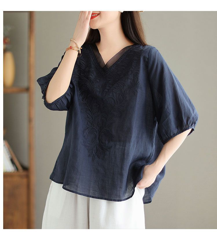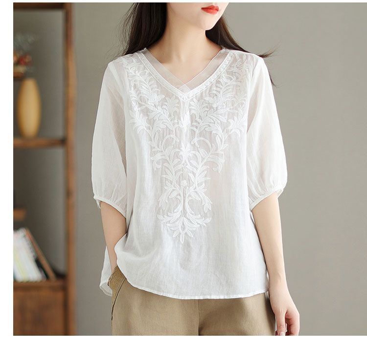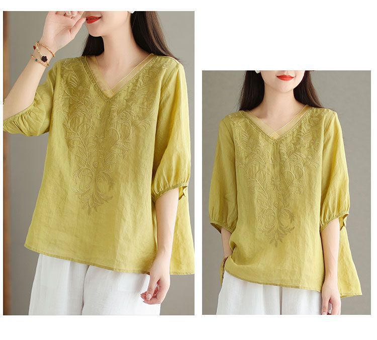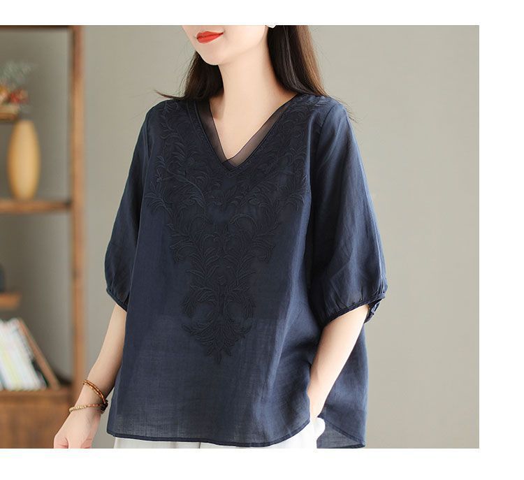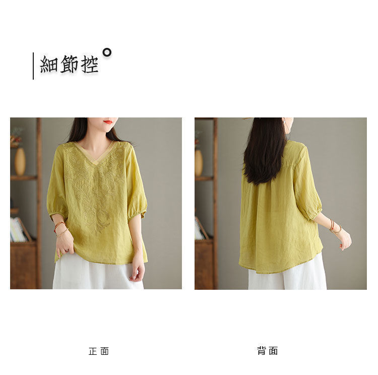여자 중간 소매 셔츠 2025 여름 얇은 V-목 무거운 자수 캐주얼 올 매치 얇은 하이 엔드 코튼 및 리넨 셔츠스토어 가기