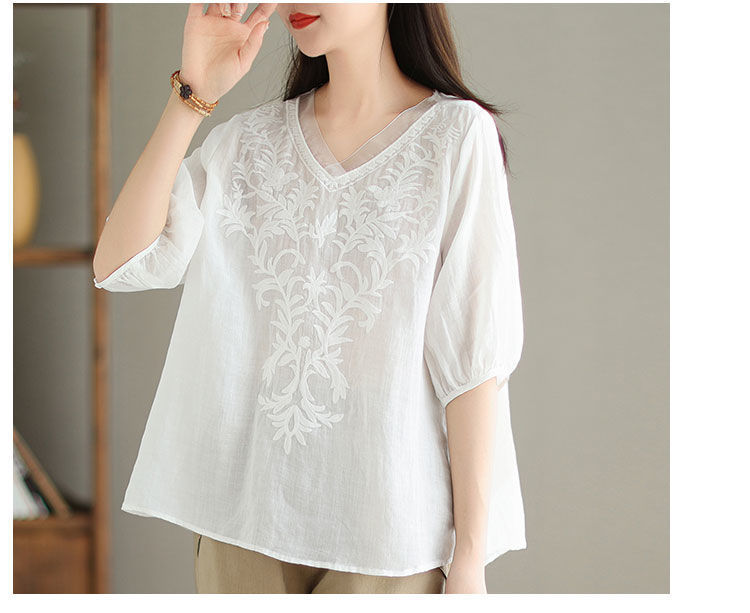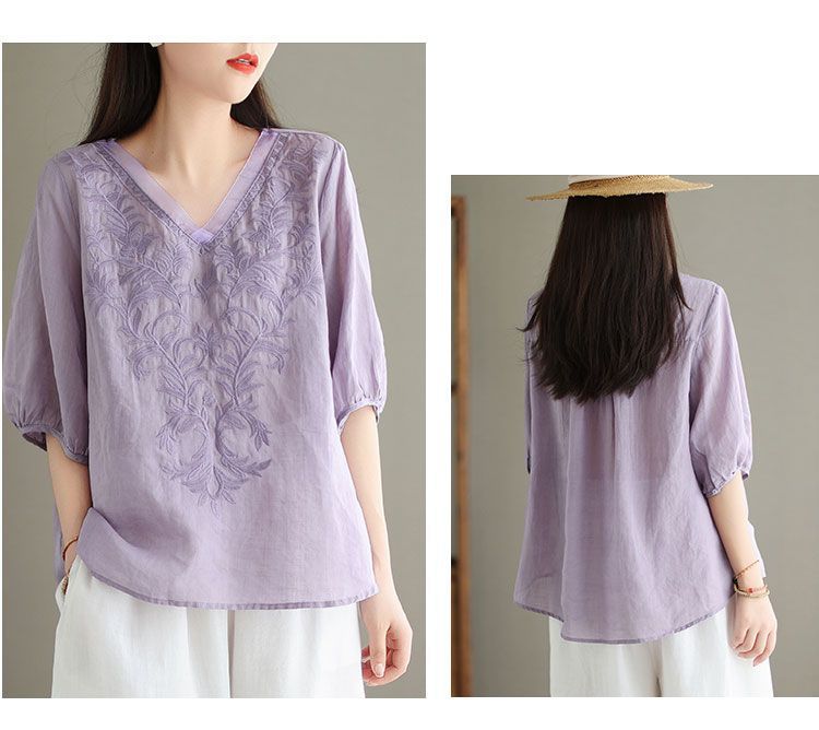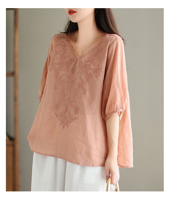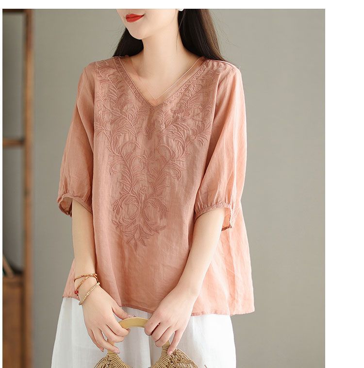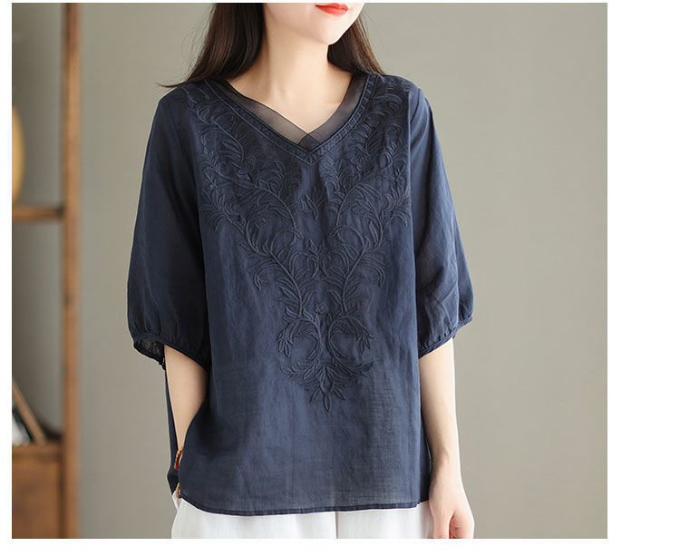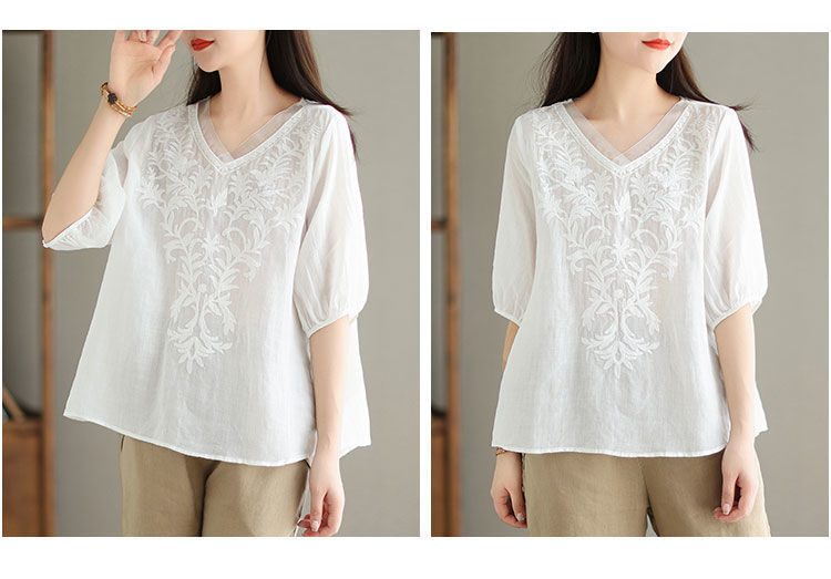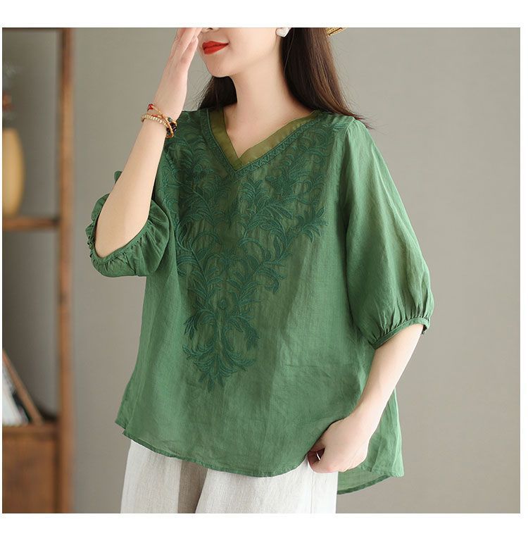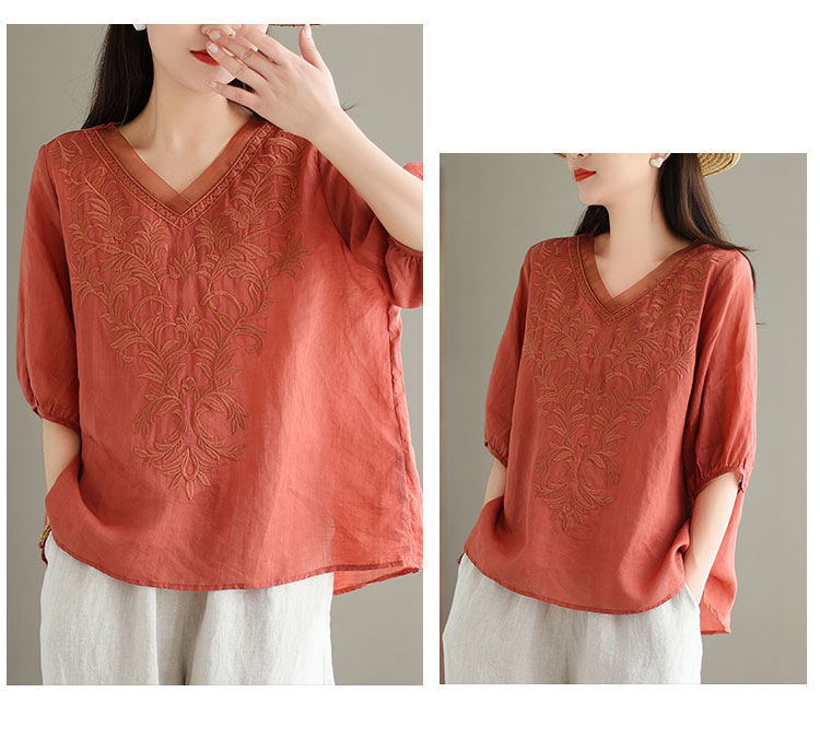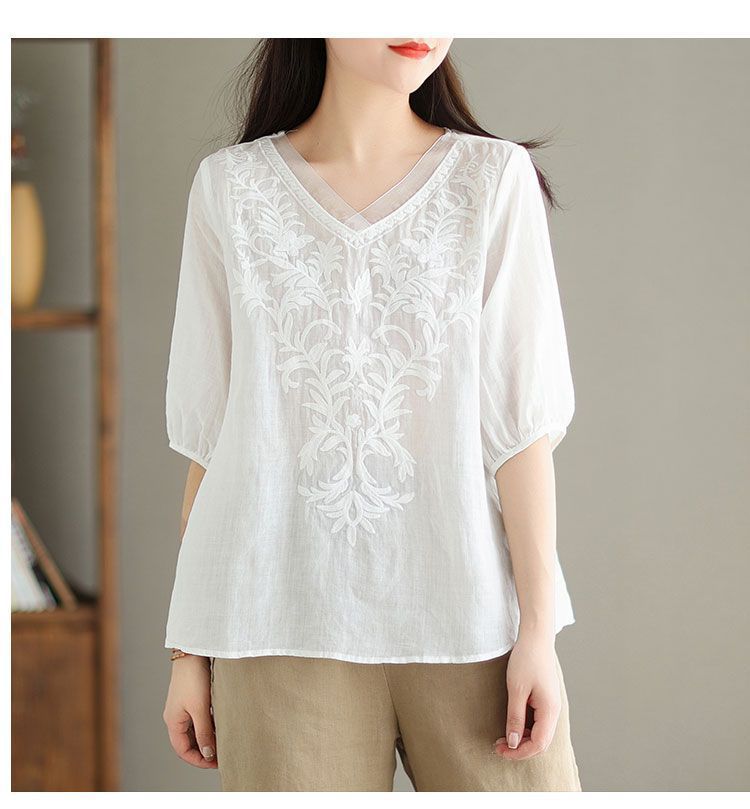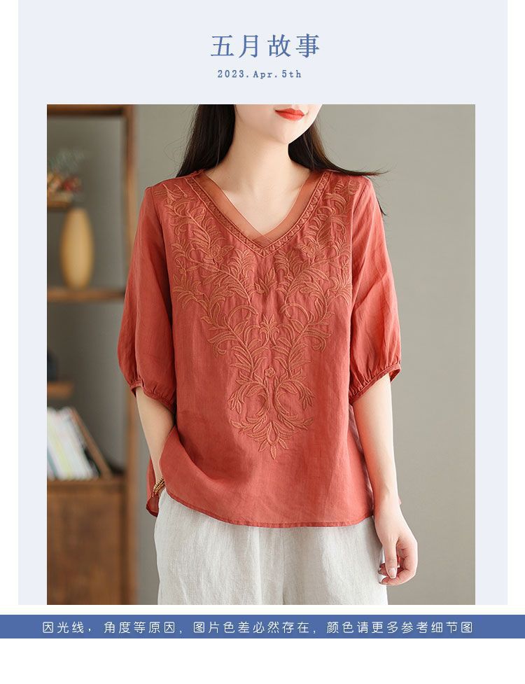 여자 중간 소매 셔츠 2025 여름 얇은 V-목 무거운 자수 캐주얼 올 매치 얇은 하이 엔드 코튼 및 리넨 셔츠스토어 가기