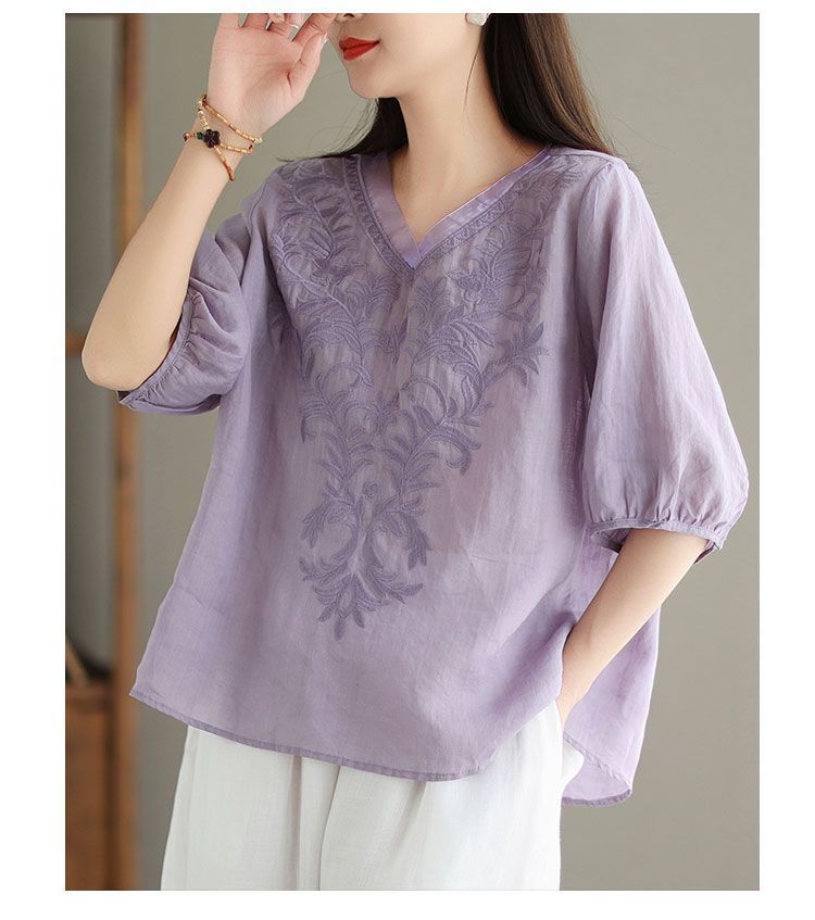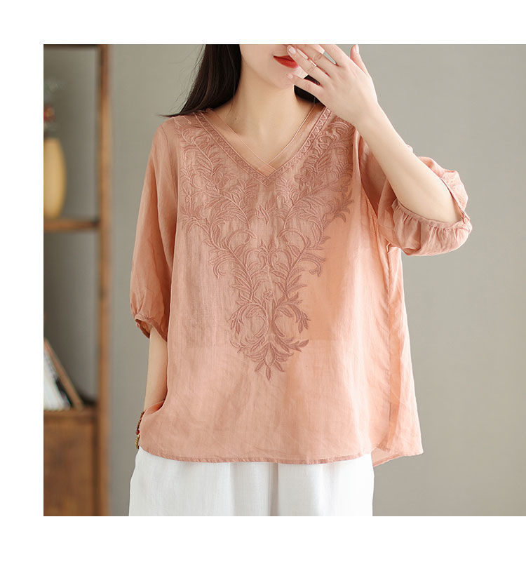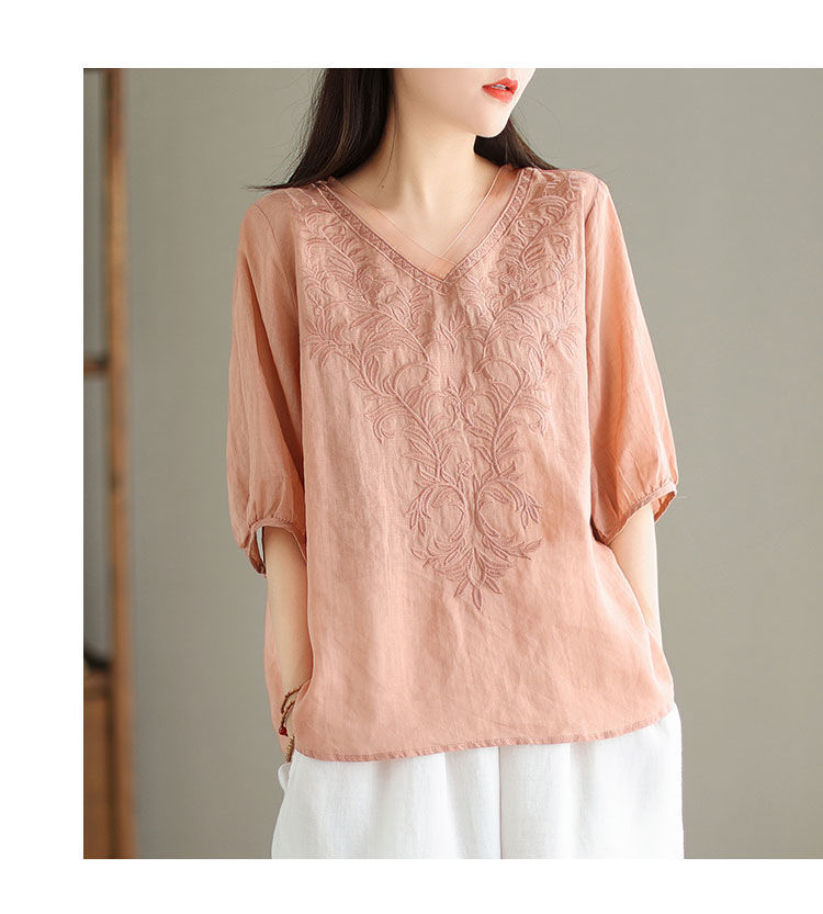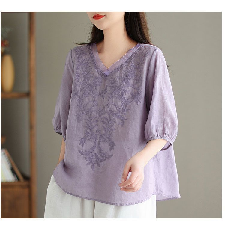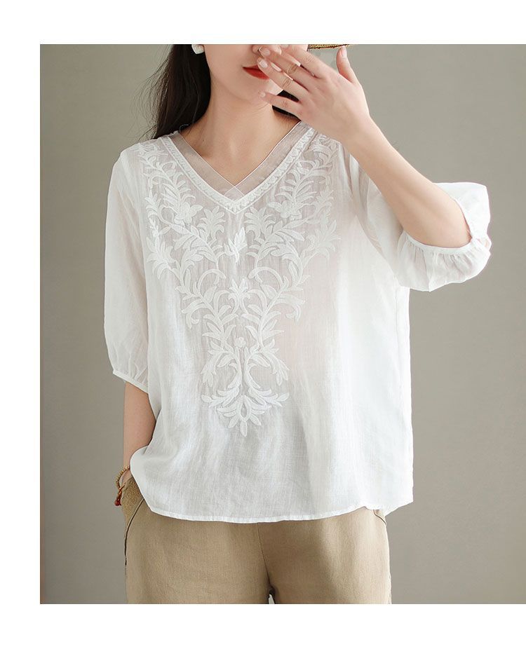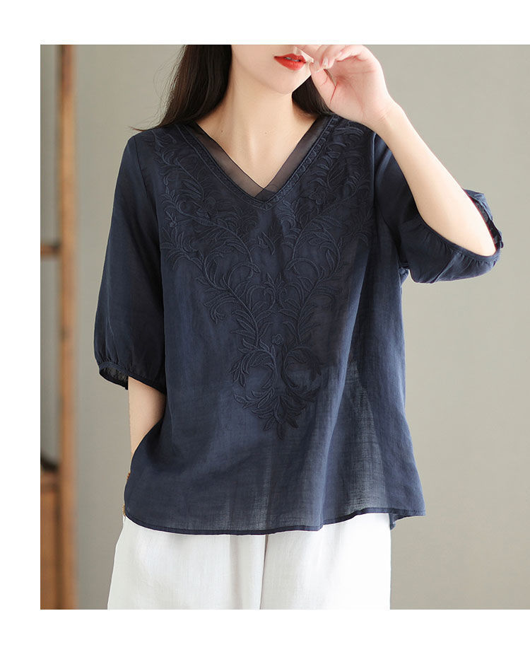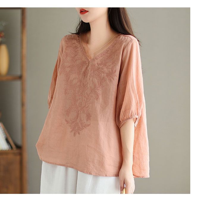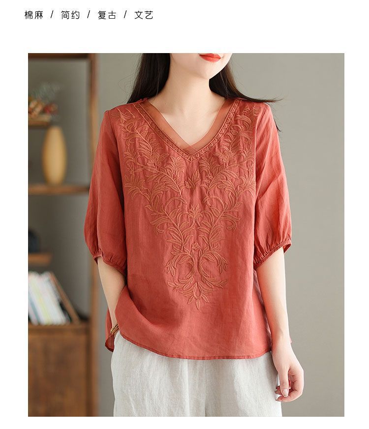 여자 중간 소매 셔츠 2025 여름 얇은 V-목 무거운 자수 캐주얼 올 매치 얇은 하이 엔드 코튼 및 리넨 셔츠스토어 가기
