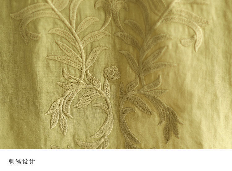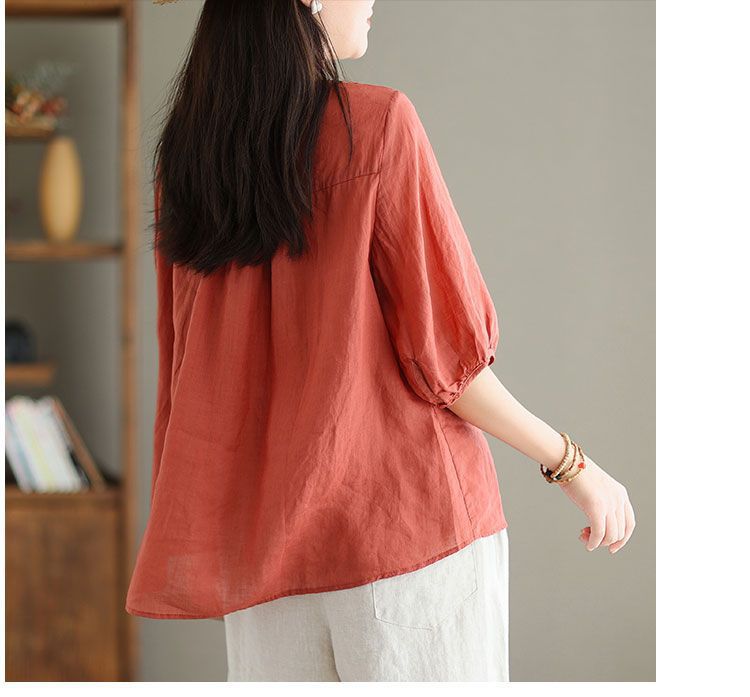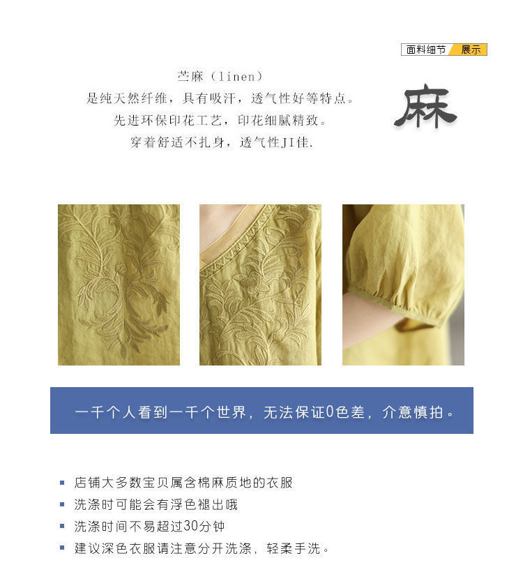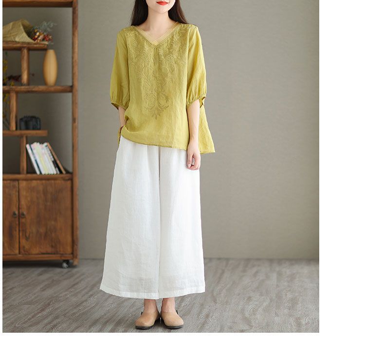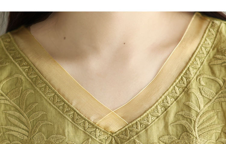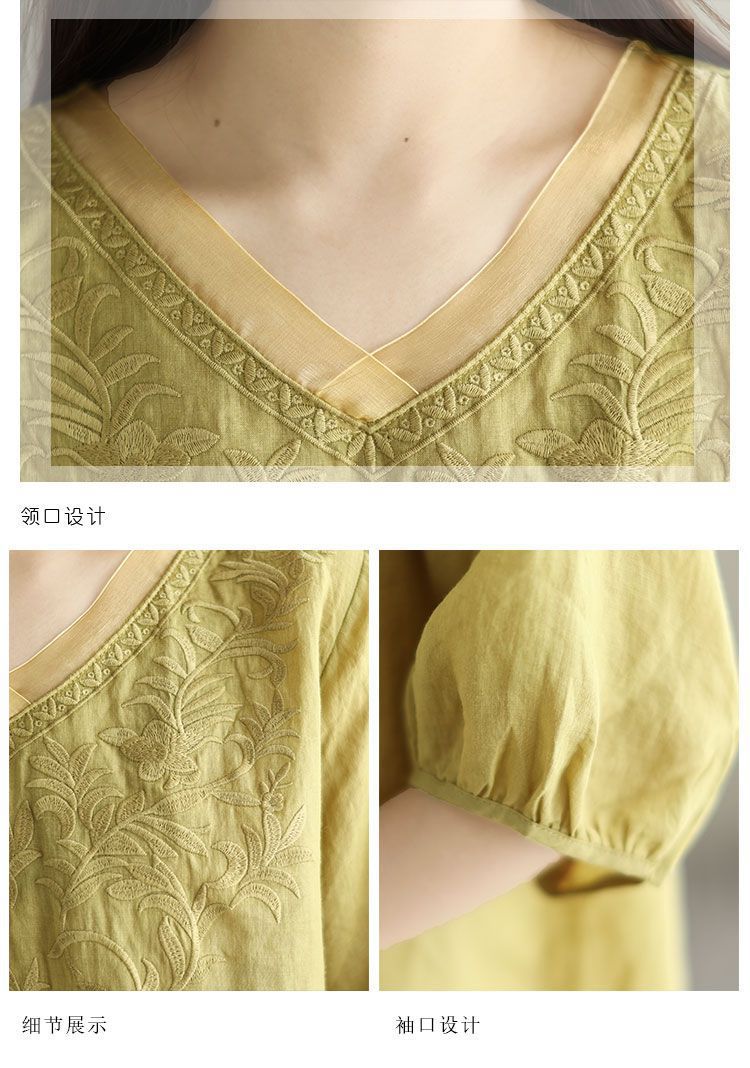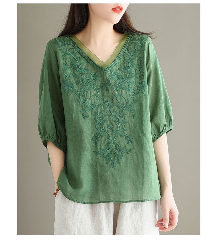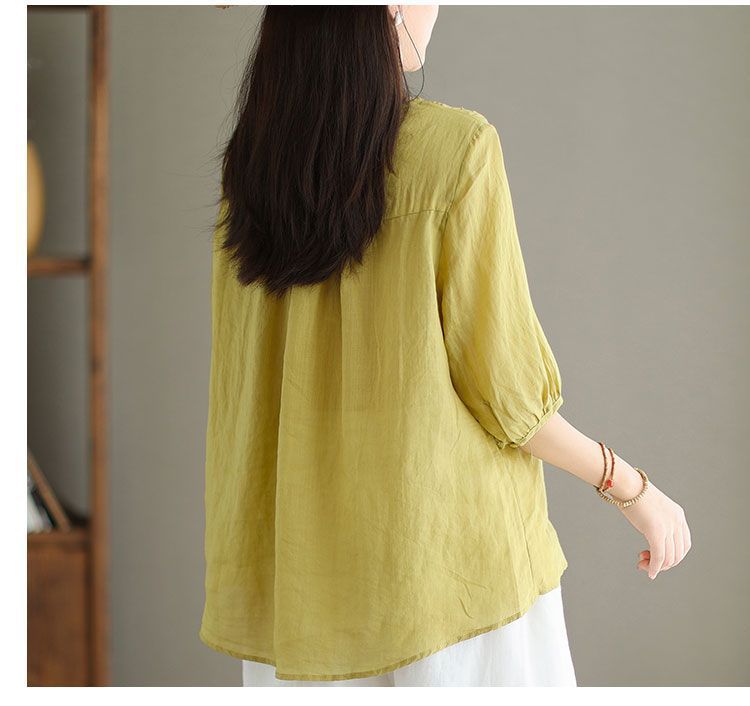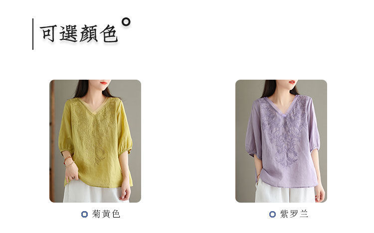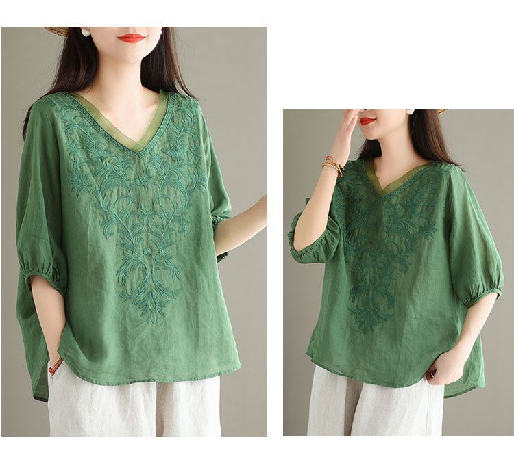 여자 중간 소매 셔츠 2025 여름 얇은 V-목 무거운 자수 캐주얼 올 매치 얇은 하이 엔드 코튼 및 리넨 셔츠스토어 가기