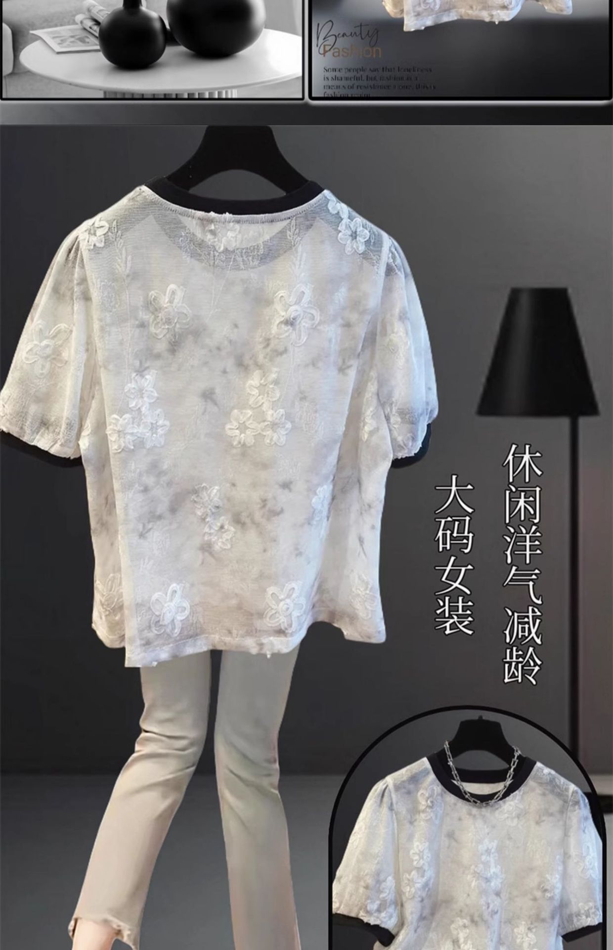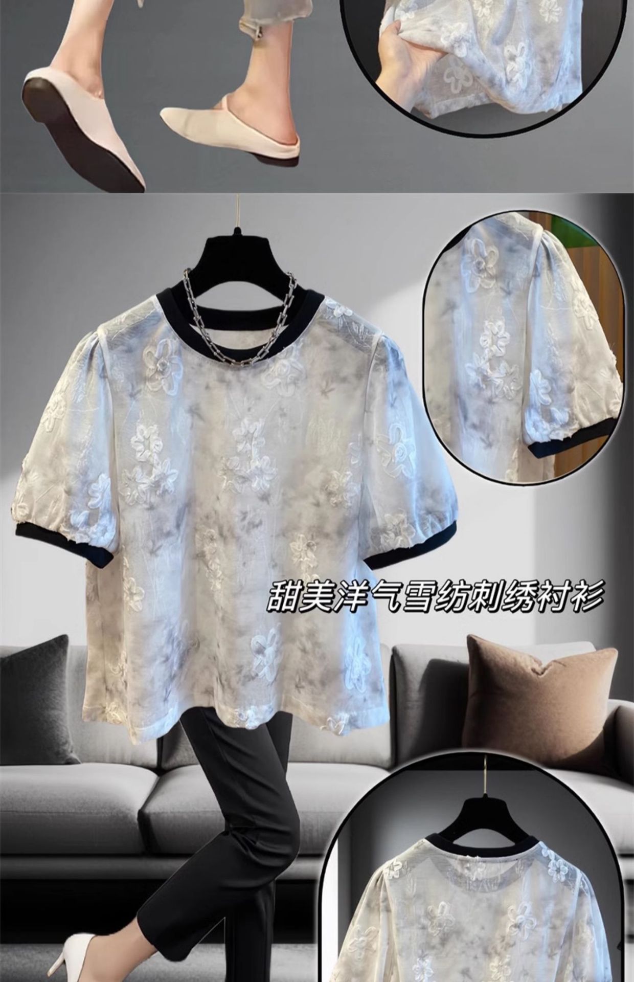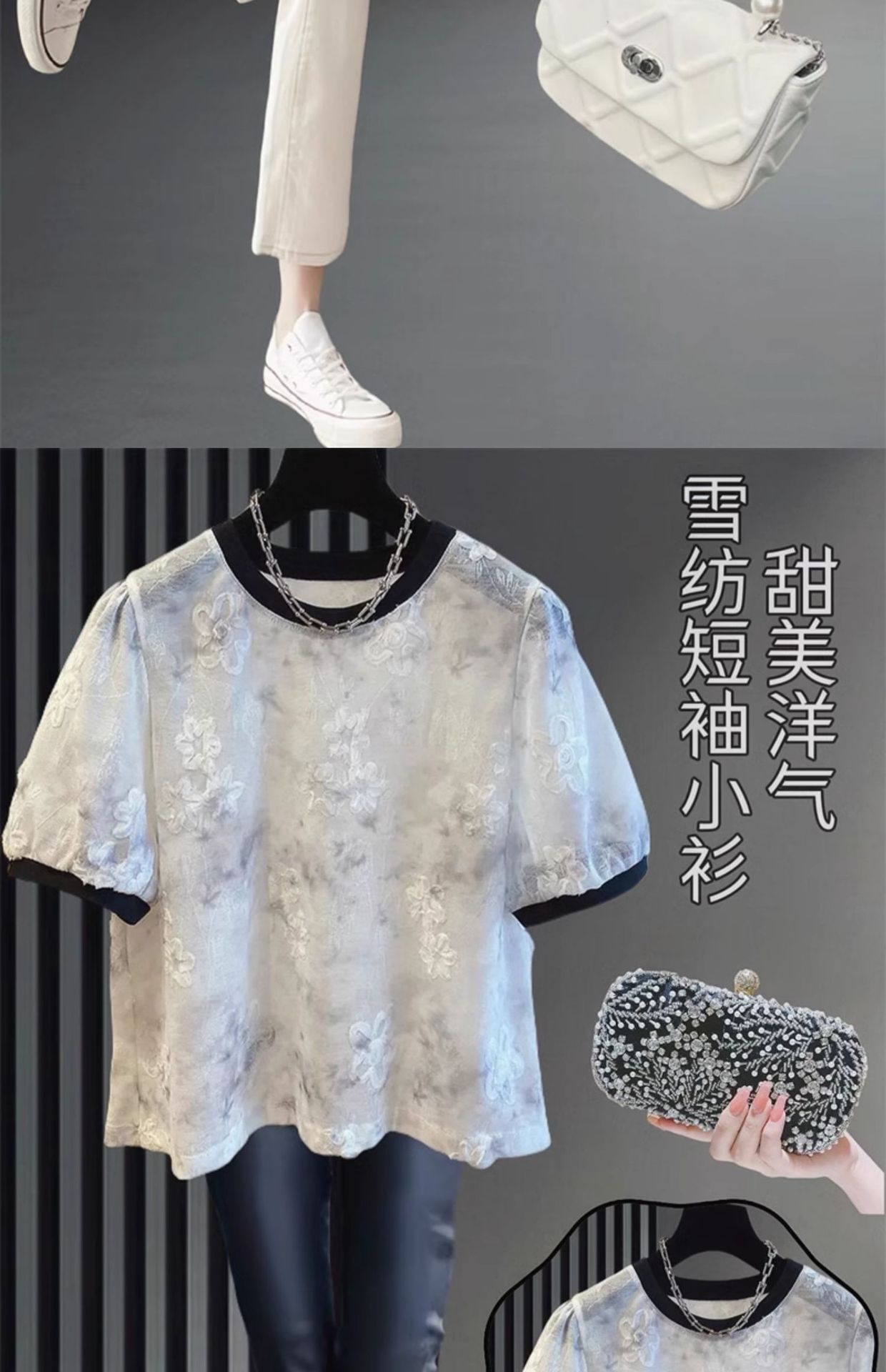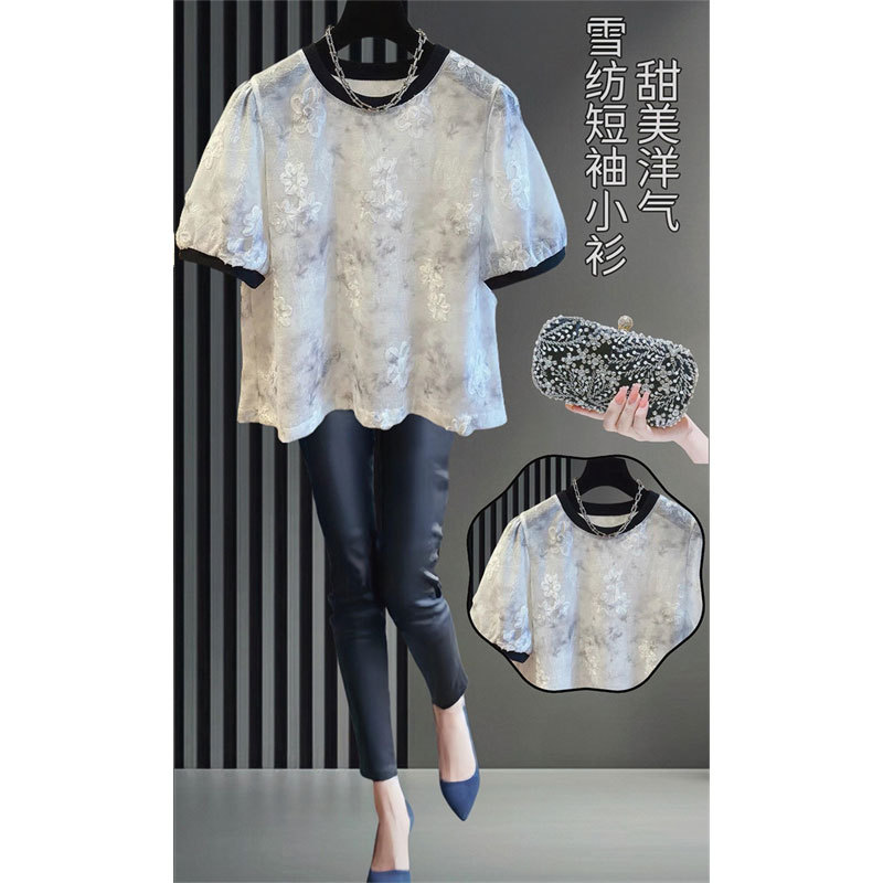 플러스 사이즈 여자 여름 하이 엔드 프린트 크루 넥 스위트 쉬폰 셔츠 최고의 여자 올 매치 에이지 감소 셔츠