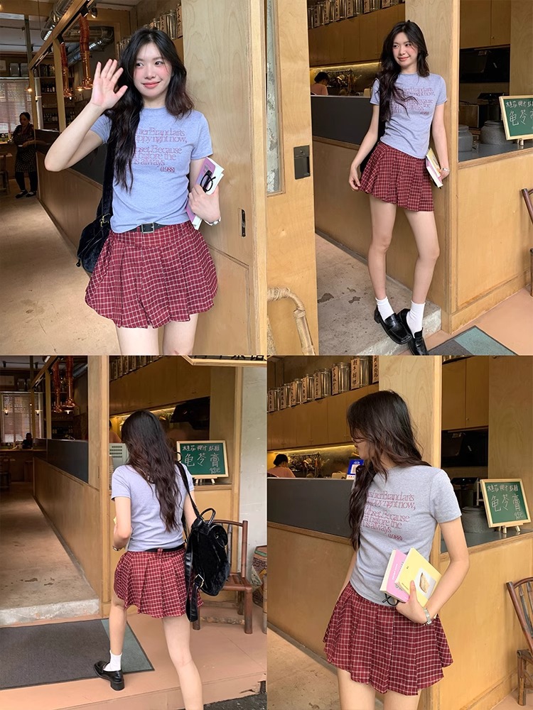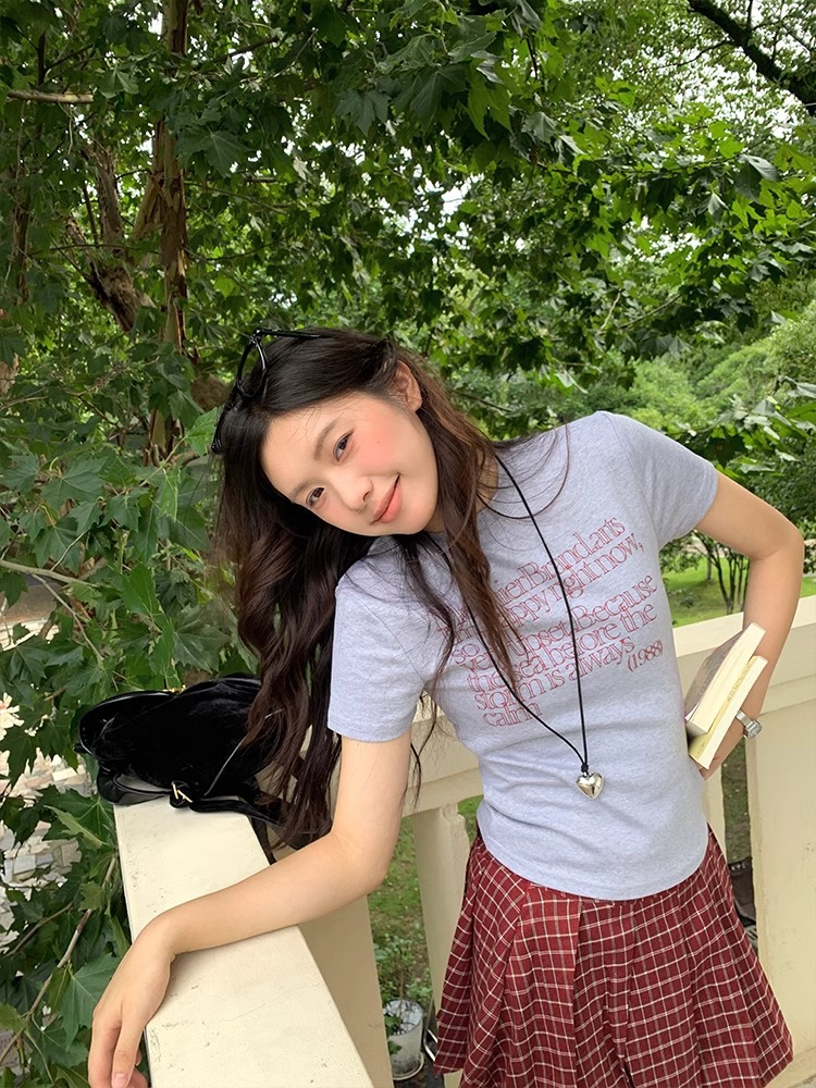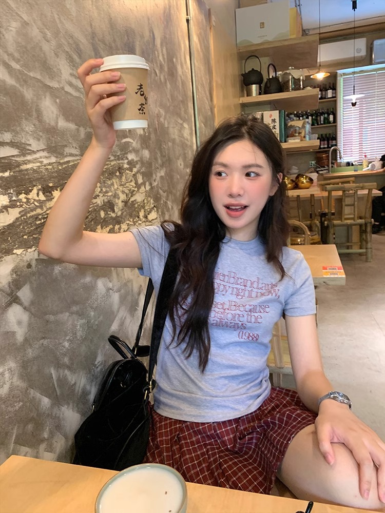 한국 스타일 소녀 2025 년 여름 슬림 핏 반팔 티셔츠 여성 복고풍 편지 인쇄 어깨 반팔 캐주얼 탑